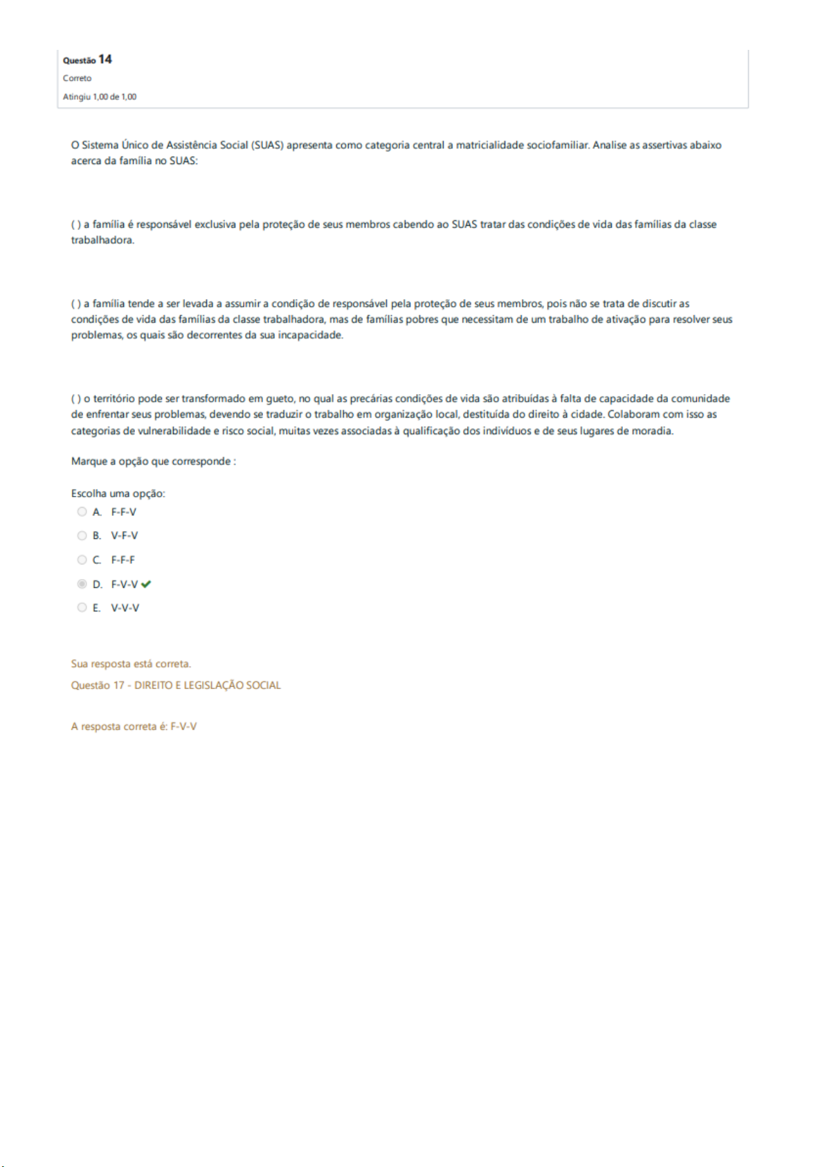 Questão 14 Correto Atingiu 1,00 de 1,00 o Sistema Único de Assistência Social (SUAS) apresenta como categoria central a matricialidade sociofamiliar. Analise as assertivas abaixo acerca da família no SUAS: () a família é responsável exclusiva pela proteção de seus membros cabendo ao SUAS tratar das condições de vida das famílias da classe trabalhadora. a família tende a ser levada a assumir a condição de responsável pela proteção de seus membros, pois não se trata de discutir as condições de vida das famílias da classe trabalhadora, mas de famílias pobres que necessitam de um trabalho de ativação para resolver seus problemas, os quais são decorrentes da sua incapacidade. o território pode ser transformado em gueto, no qual as precárias condições de vida são atribuídas à falta de capacidade da comunidade de enfrentar seus problemas, devendo se traduzir o trabalho em organização local, destituída do direito à cidade. Colaboram com isso as categorias de vulnerabilidade e risco social, muitas vezes associadas à qualificação dos indivíduos e de seus lugares de moradia. Marque a opção que corresponde : Escolha uma opção: A. F-F-V B. V-F-V C. F-F-F D. F-V-V E. V-V-V Sua resposta está correta. Questão 17 DIREITO E LEGISLAÇÃO SOCIAL A resposta correta é: F-V-V
