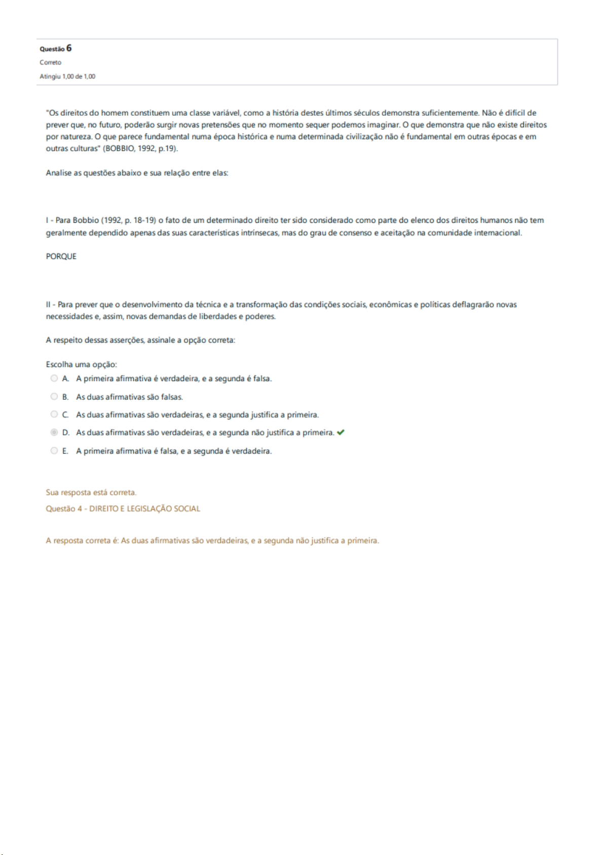 Questão 6 Correto Atingiu 1,00 de 1,00 "Os direitos do homem constituem uma classe variável, como a história destes últimos séculos demonstra suficientemente. Não é de prever que, no futuro, poderão surgir novas pretensões que no momento sequer podemos imaginar. que demonstra que não existe direitos por natureza. o que parece fundamental numa época histórica e numa determinada civilização não é fundamental em outras épocas e em outras culturas" (BOBBIO, 1992, p.19). Analise as questões abaixo e sua relação entre elas: I Para Bobbio (1992, 18-19) o fato de um determinado direito ter sido considerado como parte do elenco dos direitos humanos não tem geralmente dependido apenas das suas características mas do grau de consenso e aceitação na comunidade internacional. PORQUE Para prever que o desenvolvimento da técnica e a transformação das condições sociais, econômicas e políticas deflagrarão novas necessidades e, assim, novas demandas de liberdades e poderes. A respeito dessas asserções, assinale a opção correta: Escolha uma opção: A. A primeira afirmativa é verdadeira, e a segunda é falsa. B. As duas afirmativas são falsas. C. As duas afirmativas são verdadeiras, e a segunda justifica a primeira. D. As duas afirmativas são verdadeiras, e a segunda não justifica a primeira. E. A primeira afirmativa é falsa, e a segunda é verdadeira. Sua resposta está correta. Questão 4 DIREITO E LEGISLAÇÃO SOCIAL A resposta correta é: As duas afirmativas são verdadeiras, e a segunda não justifica a primeira.