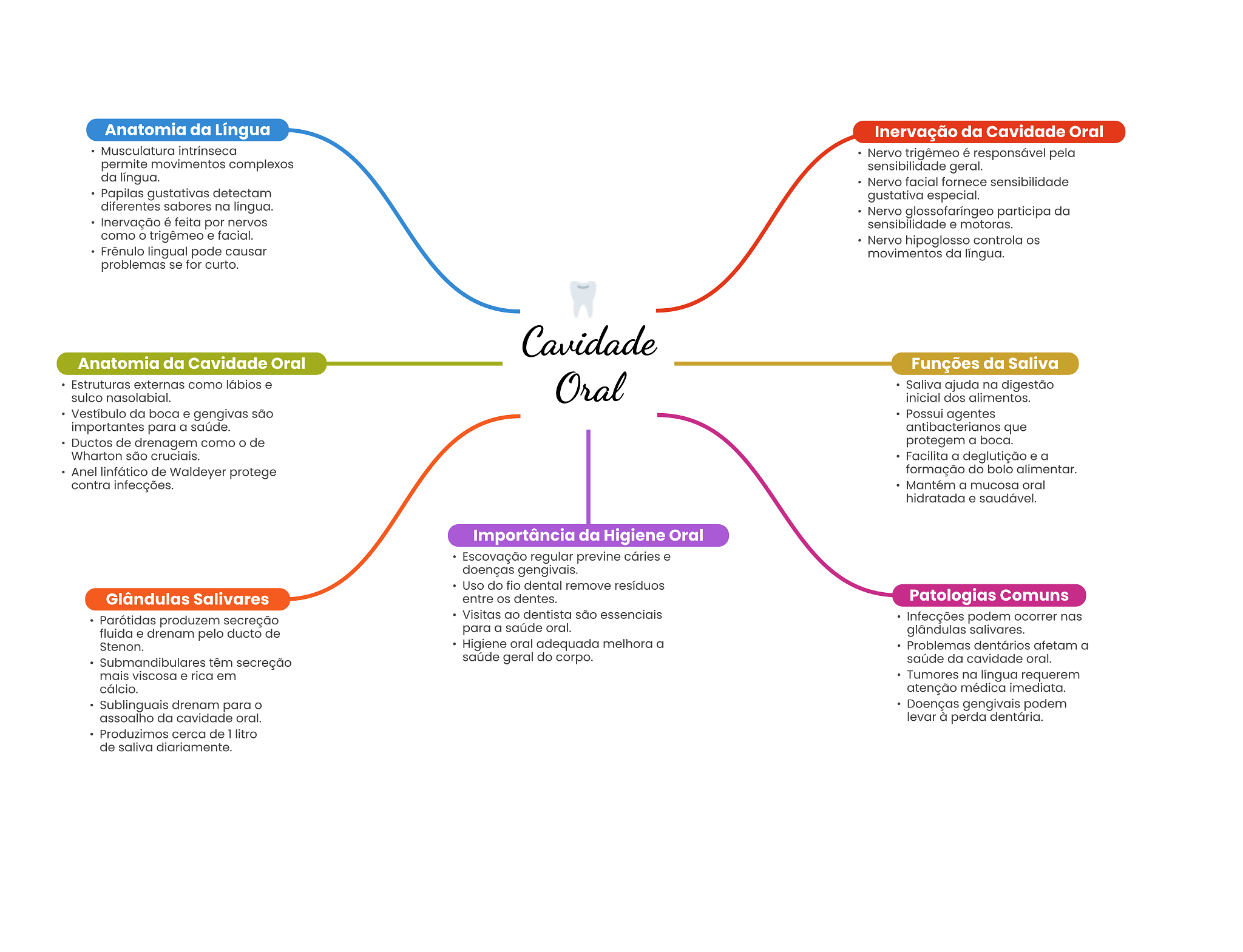 Anatomia da Língua Inervação da Cavidade Oral Musculatura intrínseca Nervo trigêmeo é responsável pela permite movimentos complexos sensibilidade geral. da língua. Nervo facial fornece sensibilidade Papilas gustativas detectam gustativa especial. diferentes sabores na língua. Nervo glossofaríngeo participa da Inervação é feita por nervos sensibilidade e motoras. como trigêmeo e facial. Nervo hipoglosso controla os Frênulo lingual pode causar movimentos da língua. problemas se for curto. Cavidade Anatomia da Cavidade Oral Funções da Saliva Estruturas externas como lábios e sulco nasolabial. Oral Saliva ajuda na digestão inicial dos alimentos. Vestíbulo da boca e gengivas são Possui agentes importantes para a saúde. antibacterianos que Ductos de drenagem como de protegem a boca. Wharton são cruciais. Facilita a deglutição e a Anel linfático de Waldeyer protege formação do bolo alimentar. contra infecções. Mantém a mucosa oral hidratada e saudável. Importância da Higiene Oral Escovação regular previne cáries e doenças gengivais. Uso do fio dental remove resíduos Glândulas Salivares entre OS dentes. Patologias Comuns Visitas ao dentista são essenciais Parótidas produzem secreção Infecções podem ocorrer nas fluida e drenam pelo ducto de para a saúde oral. glândulas salivares. Stenon. Higiene oral adequada melhora a Problemas dentários afetam a Submandibulares têm secreção saúde geral do corpo. saúde da cavidade oral. mais viscosa e rica em Tumores na língua requerem cálcio. atenção médica imediata. Sublinguais drenam para o Doenças gengivais podem assoalho da cavidade oral. levar à perda dentária. Produzimos cerca de 1 litro de saliva diariamente.