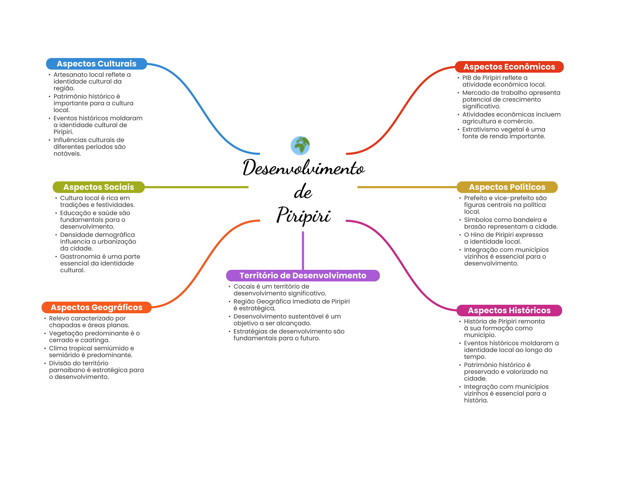 Aspectos Culturais Aspectos Econômicos Artesanato local reflete a identidade cultural da PIB de Piripiri reflete a atividade econômica local. região. Patrimônio histórico é Mercado de trabalho apresenta potencial de crescimento importante para a cultura local. significativo. Atividades econômicas incluem Eventos históricos moldaram a identidade cultural de agricultura e comércio. Piripiri. Extrativismo vegetal é uma Influências culturais de fonte de renda importante. diferentes períodos são notáveis. Desenvolvimento Aspectos Sociais de Aspectos Políticos Cultura local é rica em Prefeito e vice-prefeito são tradições e festividades. figuras centrais na política Educação e saúde são Piripiri local. fundamentais para Símbolos como bandeira e desenvolvimento. brasão representam a cidade. Densidade demográfica Hino de Piripiri expressa influencia a urbanização a identidade local. da cidade. Integração com municípios Gastronomia é uma parte vizinhos é essencial para O essencial da identidade desenvolvimento. cultural. Território de Desenvolvimento Cocais é um território de desenvolvimento significativo. Região Geográfica Imediata de Piripiri Aspectos Geográficos é estratégica. Aspectos Históricos Relevo caracterizado por Desenvolvimento sustentável é um chapadas e áreas planas. objetivo a ser alcançado. História de Piripiri remonta Vegetação predominante é O Estratégias de desenvolvimento são à sua formação como fundamentais para futuro. município. cerrado e caatinga. Eventos históricos moldaram a Clima tropical semiúmido e identidade local ao longo do semiárido é predominante. tempo. Divisão do território Patrimônio histórico é parnaibano é estratégica para preservado e valorizado na desenvolvimento. cidade. Integração com municípios vizinhos é essencial para a história.