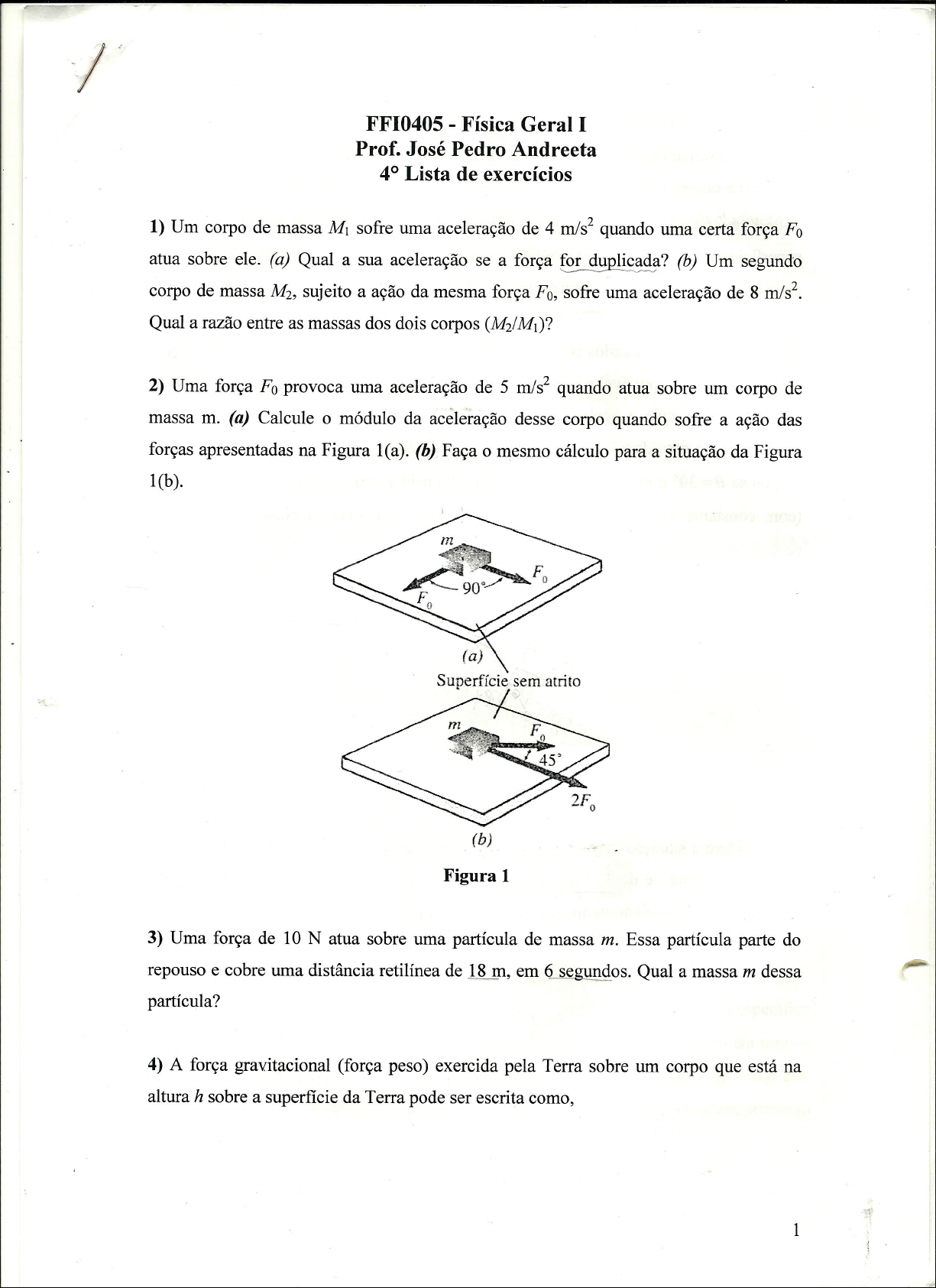 FFI0405 Física Geral I Prof. José Pedro Andreeta 4° Lista de exercícios 1) Um corpo de massa M₁ sofre uma aceleração de 4 m/s² quando uma certa força F₀ atua sobre ele. (a) Qual a sua aceleração se a força for duplicada? (b) Um segundo corpo de massa M₂, sujeito a ação da mesma força F₀, sofre uma aceleração de 8 m/s². Qual a razão entre as massas dos dois corpos (M₂/M₁)? 2) Uma força F₀ provoca uma aceleração de 5 m/s² quando atua sobre um corpo de massa m. (a) Calcule o módulo da aceleração desse corpo quando sofre a ação das forças apresentadas na Figura 1(a). (b) Faça o mesmo cálculo para a situação da Figura 1(b). m 90° (a) Superfície sem atrito m F 45° (b) Figura 1 3) Uma força de 10 N atua sobre uma partícula de massa m. Essa partícula parte do repouso e cobre uma distância retilínea de 18 m, em 6 segundos. Qual a massa m dessa partícula? 4) A força gravitacional (força peso) exercida pela Terra sobre um corpo que está na altura h sobre a superfície da Terra pode ser escrita como, 1onde é o raio da Terra (cerca de 6.370 km) e g é a aceleração da gravidade na superfície da Terra (9,81 Calcule a força peso de uma pessoa de 80 kg na (a) superfície da Terra e (b) em uma altura de 300 km acima da superfície da Terra. 5) Dois blocos estão ligados por uma corda, conforme mostra a Figura 2. Considere a massa da corda desprezível e que não há atrito no plano inclinado e no pino onde passa a corda. (a) Calcule a aceleração dos corpos e a tensão na corda em termos de g (aceleração da gravidade) das massas m₁ e m₂ e do ângulo (b) Qual a aceleração dos corpos se 30° e m₁ = m₂ = 5 kg. (c) Agora considere que exista uma força de atrito (com constante de atrito cinética µ) entre o bloco e o plano inclinado e calcule a aceleração dos corpos em termos de g, m₁, µ. T m, 8 Figura 2 6) Considere a situação apresentada na Figura 3. A aceleração de um bloco no ponto A do plano inclinado é de 3 m/s². Assumindo que o coeficiente de atrito cinético seja o mesmo para todo o plano inclinado, determine a aceleração do bloco no ponto B. A B 15° Figura 3 27) Uma mola AB de constante elástica k esta ligada a um suporte em A e a um dispositivo móvel B de massa m, como mostra a Figura 4. O comprimento da mola não esticada é Sabendo que o dispositivo móvel é liberado a partir do repouso em x = x₀ e considerando que não há atrito entre a haste horizontal e o dispositivo móvel, determine a velocidade com que o dispositivo passa através do ponto C. A C Figura 4 8) Durante a prática esportista do lançamento de martelo, a esfera A de 7,1 kg gira a uma velocidade v em um círculo horizontal, como mostra a Figura 5. Se = 0,93 m e Θ = 60°, determine (a) a tensão no bastão BC, (b) a velocidade da esfera A. C A Figura 5 9) Um bloco, de massa específica e altura H, flutua em um fluido de massa específica Pf como mostra a Figura 6. (a) Qual é a altura h da parte submersa do bloco em termos de p, Pf e H. (b) Considerando que 800 kg/m³, Pf = 1.200 kg/m³ e H = 6,0 cm, calcule a altura h. (Obs.: para os cálculos do volume que o bloco tenha um comprimento C e um largura L). 3H S h Figura 6 10) Uma esfera oca de raio interno 8,0 cm e raio externo 9,0 cm flutua com metade do volume submerso em um líquido de massa específica 800 kg/m³. (a) Qual é a massa da esfera? (b) Calcule a massa específica do material de que é feita a esfera. Gabarito 4) (a) F 784,8 N. (b) 715,8 N. Essa equação também pode ser escrita de forma mais simplificada: 48) (a) T = 80 N. (b) v = 2,3 m/s. 9) (a) h = H. (b) h = 4,0 cm. 10) (a) m = 1,2 kg. (b) 1,3 10³ kg/m³. 5
