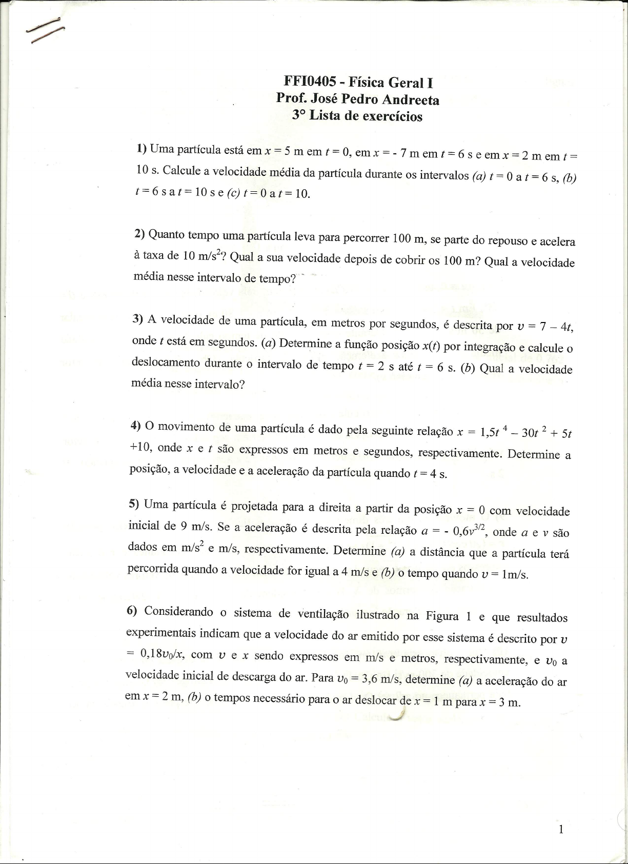 FFI0405 Física Geral I Prof. José Pedro Andreeta 3° Lista de exercícios 1) Uma partícula está em m em t=0, em 7 m em t=6 S e em m em 10 S. Calcule a velocidade média da partícula durante os intervalos (a) t a t 6 S, (b) 2) Quanto tempo uma partícula leva para percorrer 100 m, se parte do repouso e acelera à taxa de 10 m/s²? Qual a sua velocidade depois de cobrir os 100 m? Qual a velocidade média nesse intervalo de tempo? 3) A velocidade de uma partícula, em metros por segundos, é descrita por = 7 4t, onde t está em segundos. (a) Determine a função posição x(t) por integração e calcule o deslocamento durante o intervalo de tempo t=2s = até S. (b) Qual a velocidade média nesse intervalo? 4) O movimento de uma partícula é dado pela seguinte relação x 1,5t 30t + 5t +10, onde x e t são expressos em metros e segundos, respectivamente. Determine a posição, a velocidade e a aceleração da partícula quando t=4 S. 5) Uma partícula é projetada para a direita a partir da posição x = 0 com velocidade inicial de 9 m/s. Se a aceleração é descrita pela relação a onde a e são dados em m/s² e m/s, respectivamente. Determine (a) a distância que a partícula terá percorrida quando a velocidade for igual a 4 m/s e (b) o tempo quando = 1m/s. 6) Considerando o sistema de ventilação ilustrado na Figura 1 e que resultados experimentais indicam que a velocidade do ar emitido por esse sistema é descrito por 0,18v₀/x, com e x sendo expressos em m/s e metros, respectivamente, e a velocidade inicial de descarga do ar. Para = 3,6 m/s, determine (a) a aceleração do ar em x 2 m, (b) o tempos necessário para o ar deslocar de = 1 m para m. 1x Figura 1 7) Em uma partícula está na origem com uma velocidade escalar de 40 m/s e = 45°. Em t=3 S, a partícula está em x = 100 m e y 80 m, com uma velocidade escalar de 30 m/s e = 50°. Durante esse intervalo de tempo calcule (a) o vetor velocidade média e (b) o vetor aceleração média da partícula. (Obs.: ângulo do vetor velocidade com o eixo x). 8) O movimento de um partícula é definido pelas equações x + 5t 15t, onde x e y são expressos em milímetros e t em segundos. Determine: (a) o vetor velocidade e aceleração e (b) calcule a velocidade e a aceleração instantânea quando t= 9) O movimento em três dimensões de uma partícula é descrito pelo vetor posição r = + (Btsen(t))k, onde A e são constantes e r e t são expressos em metros e segundos, respectivamente. (a) Determine os vetores velocidade e aceleração em termos de A, B e t. Considerando determine (b) a velocidade e a aceleração instantânea quando t=0s. 10) Um canhão está com um ângulo de elevação de 45° e dispara uma bala com a velocidade de 300 m/s. (a) Qual a altura máxima que a bala atinge? (b) Quanto tempo a bala permanece no ar? (c) Qual o alcance horizontal? (Obs.: Despreze a resistência do ar) 2t 2t + 211) Um projétil é disparado do topo de um penhasco de 200 m como mostra a figura abaixo. A velocidade inicial é de 60 m/s e faz um ângulo de 60° com a horizontal. Desprezando a resistência do ar, onde o projétil atinge o solo? = 60 m/s 60° Vx 200 m Alcance =? 12) Água flui a partir de uma calha de drenagem com uma velocidade inicial de 0,762 m/s em um ângulo de 15° com a horizontal como mostra a figura abaixo. Determine o intervalo de valores da distância d para os quais a água entrará na balde BC. A 15° 304,8 cm B C 36,6 cm d 30 cm 13) A posição de uma partícula que descreve o movimento circular é dada pela equação r = (4sen(2πt) i + 4cos(2πt) j) m onde t está em segundos. (a) Mostre que o raio do circulo é igual a 4 m. (b) Calcule o vetor velocidade e mostre que = -y/x. (c) Calcule o vetor aceleração, mostre que está na direção radial e tem módulo igual a 314) Uma partícula se desloca no sentido horário, num círculo de raio 1 m, com o centro em (x, y) = (1 m, 0). A partícula parte do repouso, na origem, no instante velocidade aumenta à taxa constante (π/2) m/s². (a) Quanto tempo leva a partícula para percorrer a metade do círculo? (b) Qual a sua velocidade escalar neste instante? (c) Qual o sentido da sua velocidade neste instante? (d) Qual é, então, a sua aceleração radial? E a sua aceleração tangencial? Gabarito 1) (a) -2 m/s. (b) 2,25 m/s. (c) -0,3 m/s. 2) (a) 4,47 S. (b) 44,7 m/s. (c) 22,4 m/s. 3) (a) (b) 36 m. (c) -9 m/s. 4) - 66 m, 149 m/s e 228 m/s². 5) (a) 3,33 m. (b) 2,22 S. 6) (a) 0,05 m/s². (b) 6,17 S. 7) (a) m. (b) 3,00i 1,77j) m/s² 8) (a) [(12t² mm/s, a [(24t + (10)j] mm/s². (b) v a 10) (a) 2.296 m. (b) 43,2 S. (c) 9.164 m. 411) 408 m. 12) 0,23 m ≤ d ≤ 0,53 m. 13) (a) O modulo de r é igual a 4. (b) V = [8π - m/s. (c) a = = 14) (a) t=2s. (b) π m/s. (c) - j. (d) = π² m/s² e aₜ = π/2 m/s².
