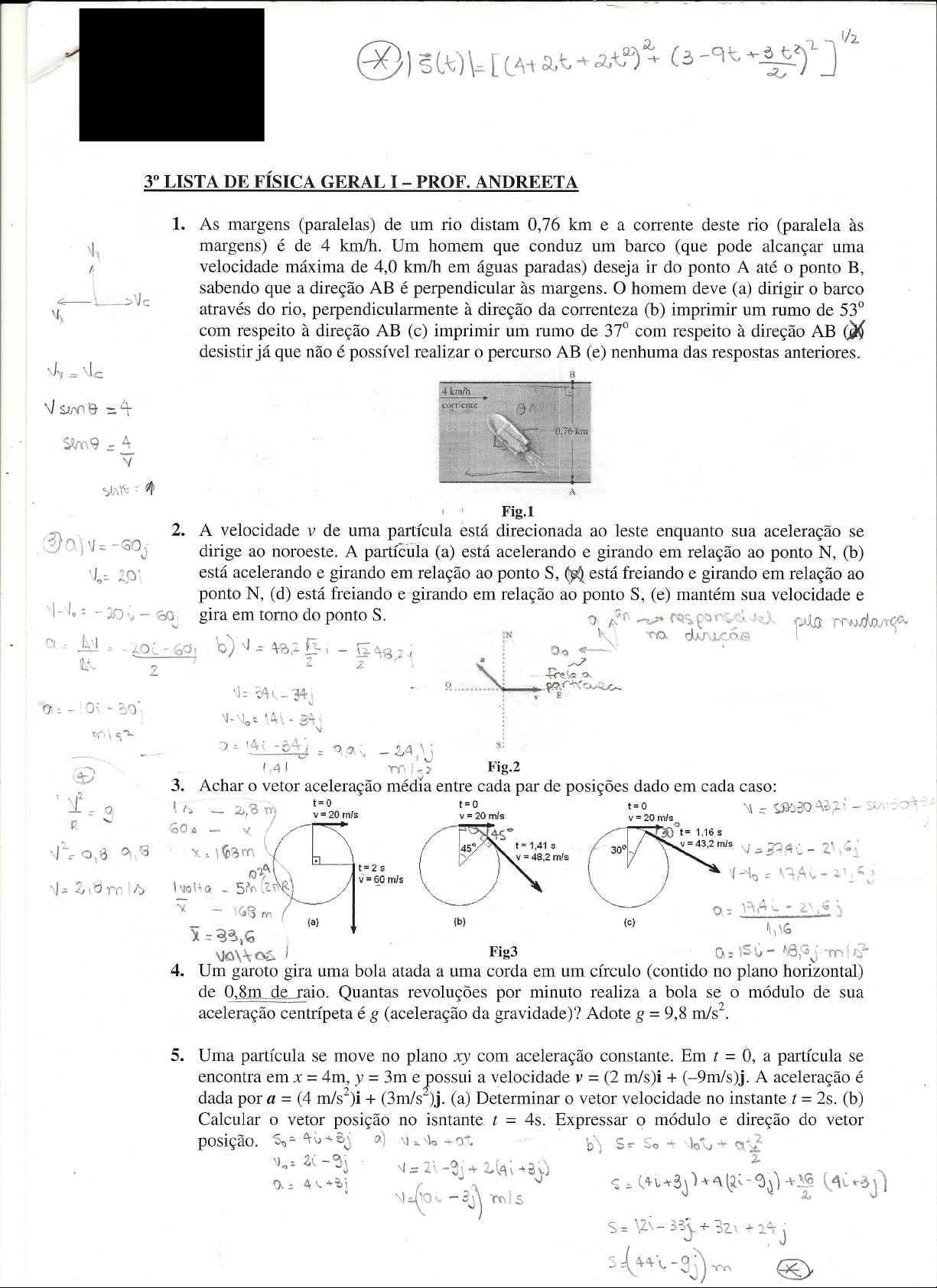 3° LISTA DE FÍSICA GERAL I PROF. ANDREETA 1. As margens (paralelas) de um rio distam 0,76 km e a corrente deste rio (paralela às margens) é de 4 km/h. Um homem que conduz um barco (que pode alcançar uma velocidade máxima de 4,0 km/h em águas paradas) deseja ir do ponto A até o ponto B, sabendo que a direção AB é perpendicular às margens. O homem deve (a) dirigir o barco através do rio, perpendicularmente à direção da correnteza (b) imprimir um rumo de 53° com respeito à direção AB (c) imprimir um rumo de 37° com respeito à direção AB desistir já que não é possível realizar o percurso AB (e) nenhuma das respostas anteriores. B 4 km/h corriente km A Fig.1 2. A velocidade de uma partícula está direcionada ao leste enquanto sua aceleração se dirige ao noroeste. A partícula (a) está acelerando e girando em relação ao ponto N, (b) está acelerando e girando em relação ao ponto S, (c) está freiando e girando em relação ao ponto N, (d) está freiando girando em relação ao ponto S, (e) mantém sua velocidade e gira em torno do ponto S. IN a na 2 1,41 Fig.2 3. Achar o vetor aceleração média entre cada par de posições dado em cada caso: R t=0 t=0 t=0 20 m/s 20 m/s 20 m/s 1,16 45° 30° m/s 48,2 m/s t=2s 60 m/s (a) (b) (c) 1,16 voltas Fig3 4. Um garoto gira uma bola atada a uma corda em um círculo (contido no plano horizontal) de 0,8m de raio. Quantas revoluções por minuto realiza a bola se o módulo de sua aceleração centrípeta (aceleração da gravidade)? Adote g = 9,8 m/s². 5. Uma partícula se move no plano xy com aceleração constante. Em t = 0, a partícula se encontra em x = 4m, y 3m e possui a velocidade = (2 m/s)i + (-9m/s)j. A aceleração é dada por a = = (4 m/s²)i + (a) Determinar o vetor velocidade no instante t = 2s. (b) Calcular o vetor posição no isntante t = 4s. Expressar o módulo e direção do vetor posição. a) 26 dr at dt 6. O vetor posição de uma partícula é dado por r = (30t)i + (40t onde r se expressa em metros e t em segundos. Determine os vetores velocidade instantânea e aceleração instantânea em função do tempo t. tempo de Um jogador está a 4m de uma parede vertical e arremessa uma bola contra ela. A bola sai da mão do jogador a 2m acima do solo, com a velocidade inicial = (10m/s)i + (10m/s)j. Quando a bola atinge a parede, a componente horizontal da sua velocidade se inverte e a componente vertical permanece constante. Onde a bola atinge o solo? tempo de descida 9,8 no ponto A=> 10m/s parede Alcance 10 m/s 4m 10 m/s V=Vo+at ou a bolinha para Fig.7 da 9,8 2,24 8. A partir da Fig. 8a, mostre que o alcance R é dado por: R 2.9,8,200 2.9,8 Depois, calcule o alcance na Fig. 8b. 60 m/s 60° 200 m R Alcance ? (a) (b) Fig.8 9. Na Fig. 9, uma moto fora da estrada sobe uma rampa, com o ângulo de inclinação para saltar um valão de largura x e atingir o outro lado, que está a uma altura H. (a) Dados Θ e x, qual é o limite superior de H para que a moto tenha chance de efetuar a travessia? (b) Com H menor que estre limite superior, qual é a velocidade mínima de partida da rampa inicial necessária para efetuar-se a travessia? (Desprezar o tamanho da moto e admitir que a cobertura da distância horizontal x e a superação da distância vertical H sejam suficientes para o salto do valão.)22 t=0 t=6 I II = 200 rpm 20TT III Wo = t'+5 3 III 5 = 3 1 = 3 d= 18600 3 = rod = 120 3 9 3 = = rad 2 3 20t' 18610 930,5 = = 20 9 Fig.9 935,5 = 10. Um ponto descreve uma circunferência de acordo com a lei = + 2t², onde é medido em metros ao longo da circunferência e t em segundos. Se a aceleração total do ponto é m.s⁻² quando calcular o raio da circunferência. 11. Uma roda, partindo do repouso, é acelerada de tal modo que sua velocidade angular, crescendo uniformemente, atinge 200rpm em 6s. Após girar durante algum tempo com essa velocidade, os freios são aplicados e ela para após 5 segundos. Se o número total de revoluções da roda é 3100, calcular o tempo total de rotação. min a) 8 + = t Vocose seno + 2 h = + h = 2gh = tgo tgo + tgo + It g g g R= = + g of 2g segunds terms é maior Que podemos subtrair sen 20 = 2ah9 do Y= a) (h=0) tgox - tgox - 2 b) (2 h - tgox) ≤ h- - g g x (h- - 2h 10 V = ds = 3t2 + 4t = 20 mls 16112 = atan + acp = + = at = 16 = = 162 + = a(2)cp = 6 mas a = R 16 = R = 100 = 4