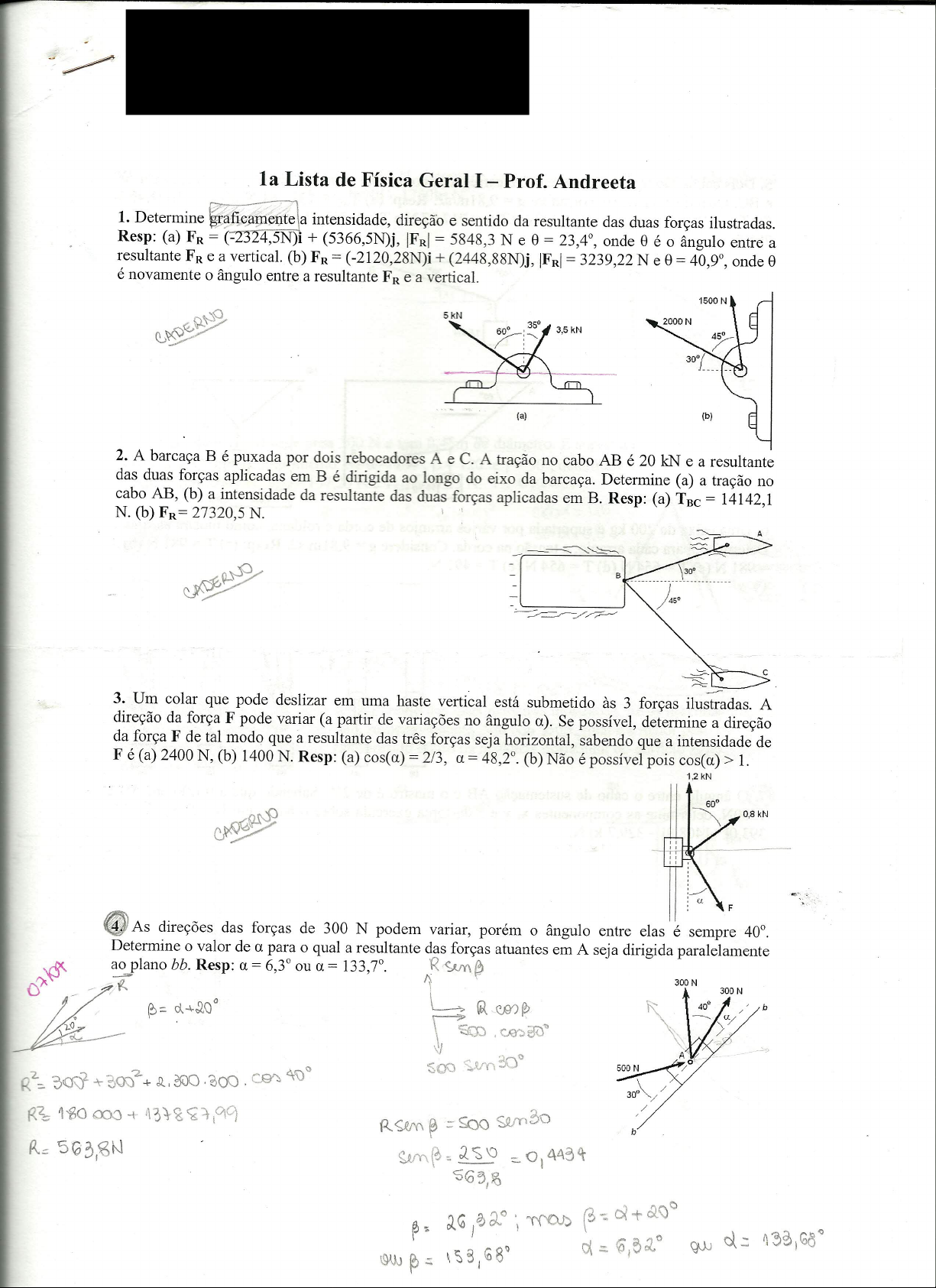 Lista de Física Geral I - Prof. Andreeta 1. Determine graficamente a intensidade, direção e sentido da resultante das duas forças ilustradas. Resp: (a) = (-2324,5N)i + (5366,5N)j, = 5848,3 N e Θ = 23,4°, onde o ângulo entre a resultante e a vertical. (b) = (-2120,28N)i + (2448,88N)j, = 3239,22 N e onde Θ é novamente o ângulo entre a resultante FR e a vertical. 1500 N CADERNO 5kN 35° 2000 N 60° 45° 30° (a) (b) 2. A barcaça B é puxada por dois rebocadores A e C. A tração no cabo AB é 20 kN e a resultante das duas forças aplicadas em é dirigida ao longo do eixo da barcaça. Determine (a) a tração no cabo AB, (b) a intensidade da resultante das duas forças aplicadas em B. Resp: (a) TBC = 14142,1 N. (b) = 27320,5 N. CADERNO 30° 45° 3. Um colar que pode deslizar em uma haste vertical está submetido às 3 forças ilustradas. A direção da força F pode variar (a partir de variações no ângulo α). Se possível, determine a direção da força F de tal modo que a resultante das três forças seja horizontal, sabendo que a intensidade de F é (a) 2400 N, (b) 1400 N. Resp: (a) cos(α) 2/3, 48,2°. (b) Não é possível pois cos(α) > 1. 60° CADERNO F 4. As direções das forças de 300 N podem variar, porém o ângulo entre elas é sempre Determine o valor de α para o qual a resultante das forças atuantes em A seja dirigida paralelamente ao plano bb. Resp: α 6,3° ou α = 133,7°. R 300 N 300 N 40° b A 500 500 N Rsen 500 sen30 b 563,8N 569,8 26,32° mas 133,68°5. Dois cabos são ligados juntos em C e carregados como está indicado. Determine a tração em AC e BC. Quando necessário, considere g = 9,81m/s2. Resp: (a) = 1327,64 N e TBC = 1627,49 N (b) TAC = 981,0 N e TBC = 2354,4 N (c) = 717,07 N e TBC = (d) = 599,6 N e 781,2 N. (a) (b) 1,3m A 40° A B 40° C 1,2m C 0,5m CADERNO 260kg (c) (d) A A 60° 1,2m C of C B 1kN 50 kg 1,5m 0,9m 6. Uma caixa de 200 kg é suportada por vários arranjos de corda e roldana, como mostra as figura. Determine, para cada arranjo, a tensão na corda. Considere g = 9,81m/s2. Resp: (a) T = 981 N (b) T = 981 N (c) T = 654 N (d) T = 654 N (e) T = 491 N. c) d) $ 9,81 . 200 T T 4 T 3 T T T= 1962 3 P (a) (b) (c) (d) (e) 7.0 ângulo entre o cabo de sustentação AB e o mastro é de 20°. Sabendo que a tração em AB é 1500N, determine as componentes X, y e Z da força exercida sobre o barco em B. Resp: = 393,0i +1408,0j 329,7 N. y Ty NY A Ty A T'z T'. 329,7N T'. x 40° C B 40° B Z N8. Sabendo que a tração em AB é 2250 N, determine as componentes da força exercida sobre a placa em A. Resp: T =(- = 1000i + 1000j 1750k) N. y 0,6m B 2,1m C 1,2m 1,2m A 9.0 anel circular uniforme pesa 300 N e tem 0,45m de diâmetro. É suportado por três cabos, cada um com 0,375m de comprimento. Se α = 150°, ß = 120° e γ = 90°, determine a tração em cada cabo. Resp: = 158,5 N, TBD = 137,25 N e = 79,25 N. r= 0,225m D TCD cosd send=0,8 0,375m 0,09 h TAD cost 120° senso 0,225 cosd TAD TBD 150° 90° a A TCD cosd C 10. Um andaime de pintor pode ser suportado das duas maneiras mostradas. Se as máximas trações permitidas nos cabos ABC e BD são, respectivamente, 500 N e 750N, qual é a maior peso que pode ser sustentado em cada arranjo? (Despreze o efeito da distância horizontal do edifício ao elevador.) Resp: (a) 750 N (b) 375 N. (a) (b) D D TBD B B TABC C TABC 150° C 60° TABC TABC A A 30° P 60° P= TABC P= 2TABC ≤ P≤500N TABC= 500 N 2 2 TABC TBP = 2P 2 TABC 6750N 2. P L 750N 25. Dois cabos são ligados juntos em C e carregados como está indicado. Determine a tração em AC e BC. Quando necessário, considere g = 9,81m/s2. Resp: (a) = 1327,64 N e TBC = 1627,49 N (b) = 981,0 N e TBC = 2354,4 N (c) = 717,07 N e TBC = 381,54 N (d) TAC = 599,6 N e N. (a) (b) 1,3m A 40° B A B 40° 20° C 1,2m C 0,5m 260kg (c) (d) A A 60° 1,2m C of C B KN 50 kg 1,5m 6. Uma caixa de 200 kg é suportada por vários arranjos de corda e roldana, como mostra as figura. Determine, para cada arranjo, a tensão na corda. Considere g = 9,81m/s2. Resp: (a) T = 981 N (b) T = 981 N (c) T = 654 N (d) T = 654 N (e) T = 491 N. c) d) 4T=P = 3T = T T 4 3 T T T T= 1962 3 = 4 N P T= 654N (a) (b) (c) (d) (e) 7.0 ângulo entre o cabo de sustentação AB e o mastro é de 20°. Sabendo que a tração em AB é 1500N, determine as componentes X, y e Z da força exercida sobre o barco em B. . Resp: = 393,0i +1408,0j 329,7 k) N. y NY A Ty 1409,5N A 513,0N T'z T'. 329,7N T'. x 40° C 40° B Z8. Sabendo que a tração em AB é 2250 N, determine as componentes da força exercida sobre a placa em A. Resp: T = (- 1000i + 1000j 1750k) N. y 0,6m B C 1,2m A 9. O anel circular uniforme pesa 300 N e tem 0,45m de diâmetro. É suportado por três cabos, cada um com 0,375m de comprimento. Se α = 150°, ß = 120° e γ = 90°, determine a tração em cada cabo. Resp: = 158,5 N, TBD = 137,25 N e = 79,25 N. r= 0,225m D TCD cosd send=0,8 0,8 0,375m 0,09 h TAD cost 0pm 120° cosd TAD senso 0,225 TBD a TPD. TCD cosd C 10. Um andaime de pintor pode ser suportado das duas maneiras mostradas. Se as máximas trações permitidas nos cabos ABC e BD são, respectivamente, 500 N e 750N, qual é a maior peso que pode ser sustentado em cada arranjo? (Despreze o efeito da distância horizontal do edifício ao elevador.) Resp: (a) 750 N (b) 375 N. (a) (b) D D TBD TBD B B TABC ABC C TABC 150° C 60° TABC TABC A A 30° P 60° TABC P= 2TABC P≤500N TABC= 2 2 TABC 1000N TBP = 2P 2 TABC 750N 2 P L 750N 2