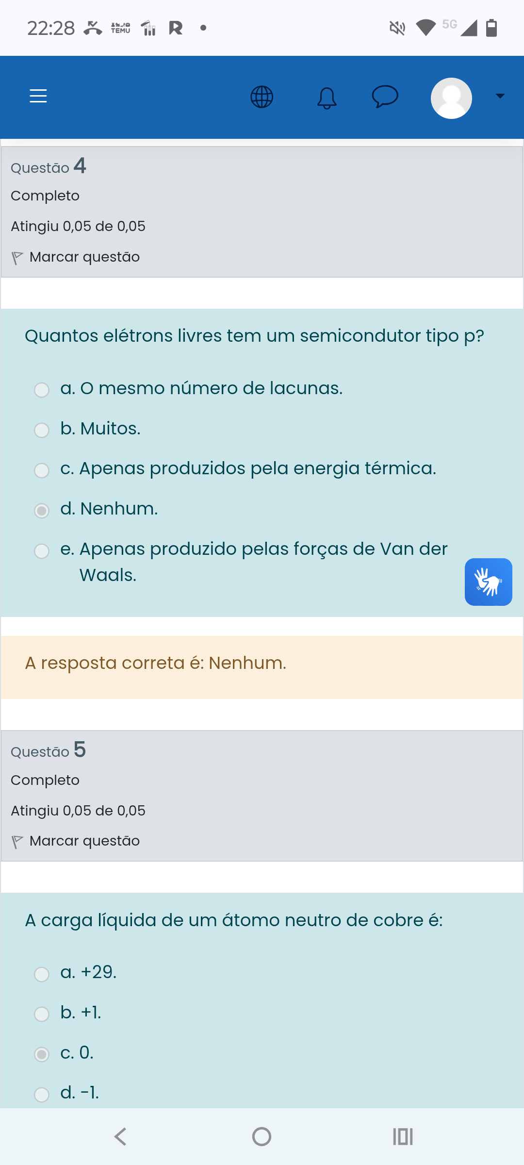 22:28 TEMU R 5G Questão 4 Completo Atingiu 0,05 de 0,05 Marcar questão Quantos elétrons livres tem um semicondutor tipo a. mesmo número de lacunas. b. Muitos. Apenas produzidos pela energia térmica. d. Nenhum. e. Apenas produzido pelas forças de Van der Waals. resposta correta é: Nenhum. Questão 5 Completo Atingiu 0,05 de 0,05 Marcar questão carga líquida de um átomo neutro de cobre é: a. +29. b. +1.