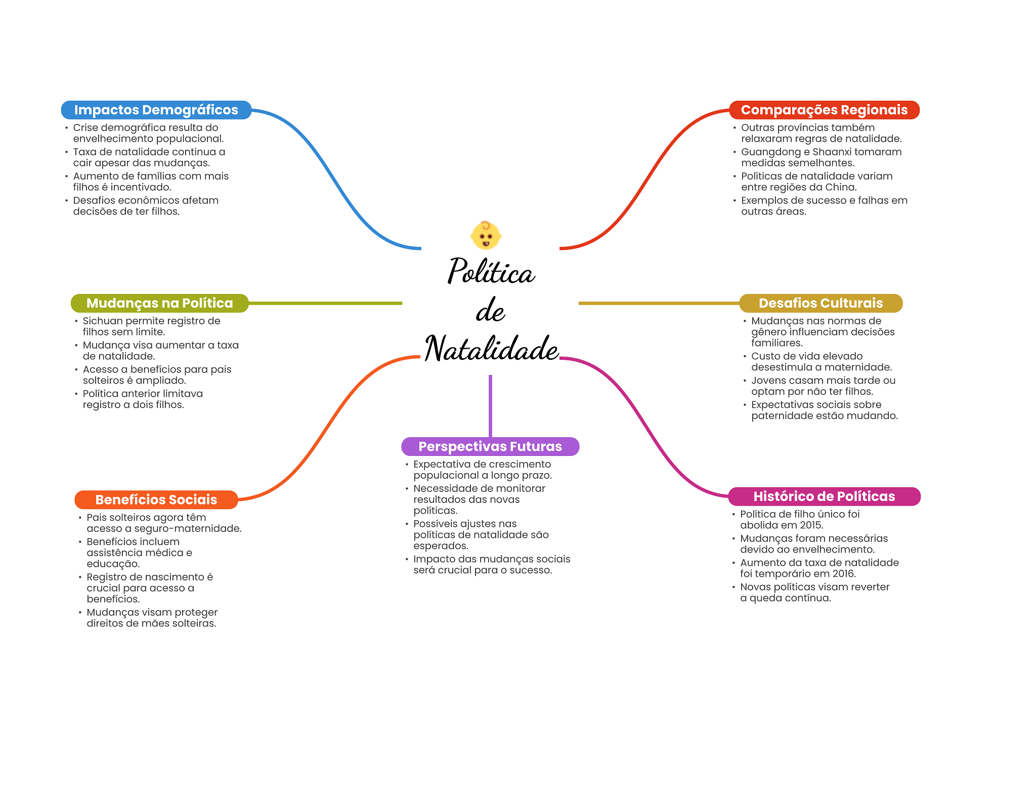 Impactos Demográficos Comparações Regionais Crise demográfica resulta do Outras províncias também envelhecimento populacional. relaxaram regras de natalidade. Taxa de natalidade continua a Guangdong e Shaanxi tomaram cair apesar das mudanças. medidas semelhantes. Aumento de famílias com mais Políticas de natalidade variam filhos é incentivado. entre regiões da China. Desafios econômicos afetam Exemplos de sucesso e falhas em decisões de ter filhos. outras áreas. Política Mudanças na Política de Desafios Culturais Sichuan permite registro de Mudanças nas normas de filhos sem limite. gênero influenciam decisões Mudança visa aumentar a taxa de natalidade. Natalidade familiares. Custo de vida elevado Acesso a benefícios para pais desestimula a maternidade. solteiros é ampliado. Jovens casam mais tarde ou Política anterior limitava optam por não ter filhos. registro a dois filhos. Expectativas sociais sobre paternidade estão mudando. Perspectivas Futuras Expectativa de crescimento populacional a longo prazo. Necessidade de monitorar Benefícios Sociais resultados das novas Histórico de Políticas políticas. Pais solteiros agora têm Política de filho único foi acesso a seguro-maternidade. Possíveis ajustes nas abolida em 2015. políticas de natalidade são Benefícios incluem Mudanças foram necessárias esperados. assistência médica e devido ao envelhecimento. educação. Impacto das mudanças sociais Aumento da taxa de natalidade será crucial para sucesso. Registro de nascimento é foi temporário em 2016. crucial para acesso a Novas políticas visam reverter benefícios. a queda contínua. Mudanças visam proteger direitos de mães solteiras.