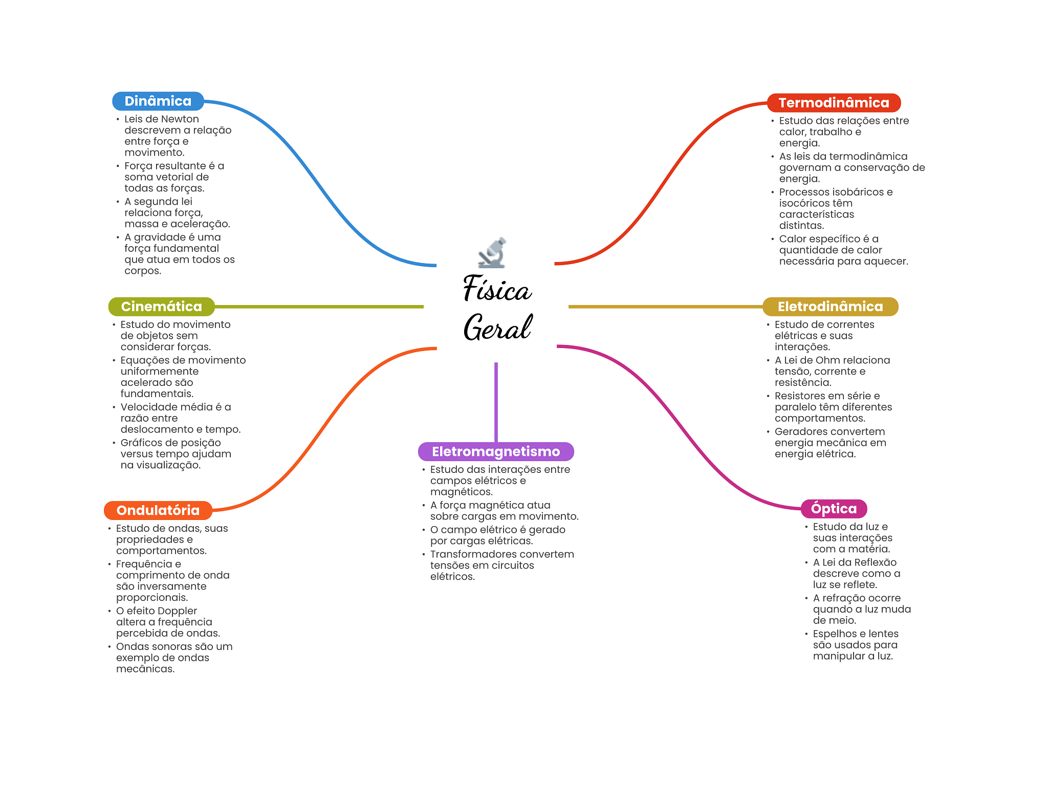 Dinâmica Termodinâmica Leis de Newton Estudo das relações entre descrevem a relação calor, trabalho e entre força e energia. movimento. As leis da termodinâmica Força resultante é a governam a conservação de soma vetorial de energia. todas as forças. Processos isobáricos e A segunda lei isocóricos têm relaciona força, características massa e aceleração. distintas. A gravidade é uma Calor específico é a força fundamental quantidade de calor que atua em todos necessária para aquecer. corpos. Física Cinemática Eletrodinâmica Estudo do movimento de objetos sem Geral Estudo de correntes elétricas e suas considerar forças. interações. Equações de movimento A Lei de Ohm relaciona uniformemente tensão, corrente e acelerado são resistência. fundamentais. Resistores em série e Velocidade média é a paralelo têm diferentes razão entre comportamentos. deslocamento e tempo. Geradores convertem Gráficos de posição energia mecânica em versus tempo ajudam Eletromagnetismo energia elétrica. na visualização. Estudo das interações entre campos elétricos e magnéticos. Ondulatória A força magnética atua Óptica sobre cargas em movimento. Estudo de ondas, suas O campo elétrico é gerado Estudo da luz e propriedades e por cargas elétricas. suas interações comportamentos. com a matéria. Transformadores convertem Frequência e tensões em circuitos A Lei da Reflexão comprimento de onda elétricos. descreve como a são inversamente luz se reflete. proporcionais. A refração ocorre efeito Doppler quando a luz muda altera a frequência de meio. percebida de ondas. Espelhos e lentes Ondas sonoras são um são usados para exemplo de ondas manipular a luz. mecânicas.