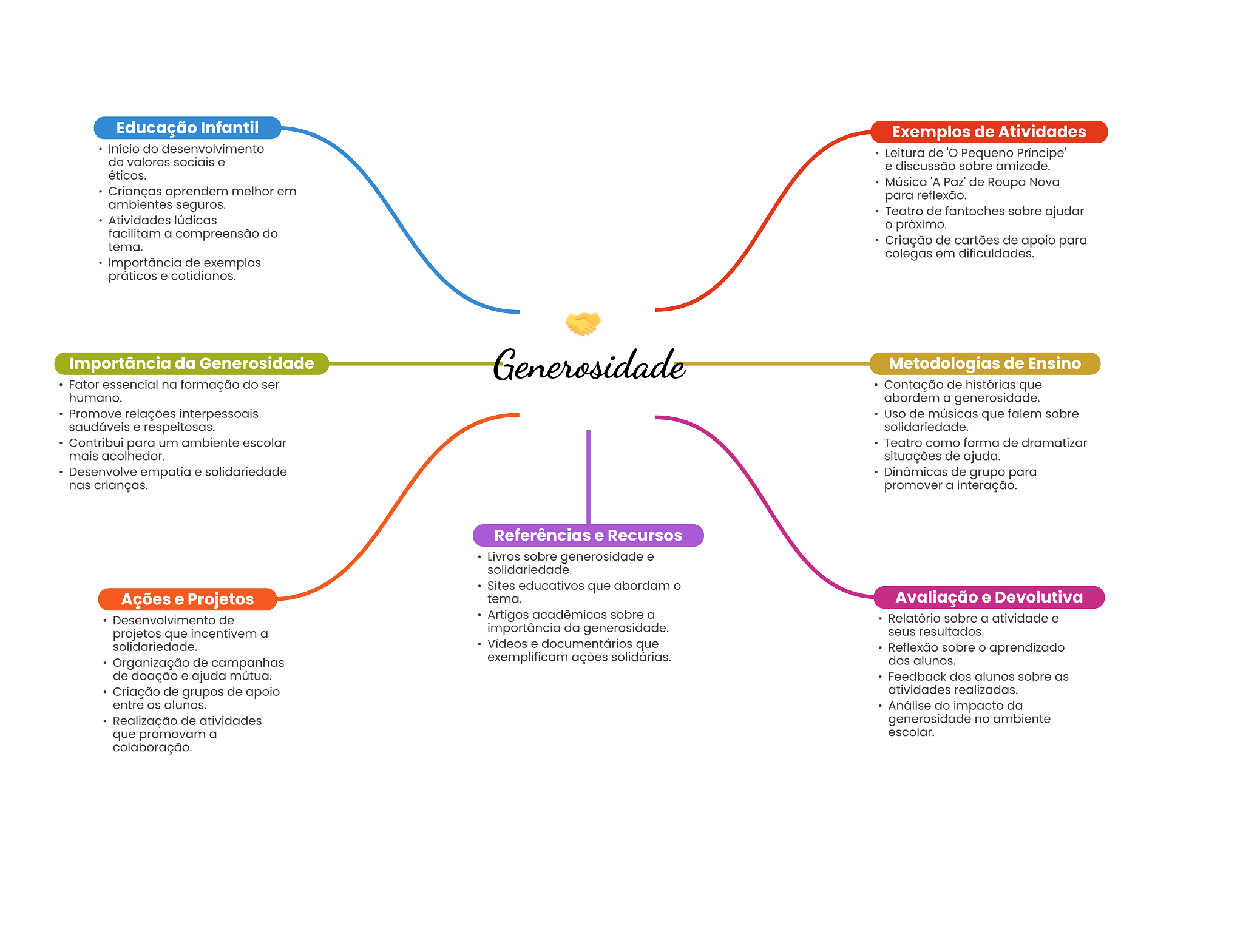 Educação Infantil Exemplos de Atividades Início do desenvolvimento Leitura de 'O Pequeno de valores sociais e e discussão sobre amizade. éticos. Música 'A Paz' de Roupa Nova Crianças aprendem melhor em para reflexão. ambientes seguros. Teatro de fantoches sobre ajudar Atividades lúdicas próximo. facilitam a compreensão do tema. de cartões de apoio para colegas em dificuldades. Importância de exemplos práticos e cotidianos. Importância da Generosidade Generosidade Metodologias de Ensino Fator essencial na formação do ser Contação de histórias que humano. abordem a generosidade. Promove relações interpessoais Uso de músicas que falem sobre saudáveis e respeitosas. solidariedade. Contribui para um ambiente escolar Teatro como forma de dramatizar mais acolhedor. situações de ajuda. Desenvolve empatia e solidariedade Dinâmicas de grupo para nas crianças. promover a interação. Referências e Recursos Livros sobre generosidade e solidariedade. Sites educativos que abordam Ações e Projetos tema. Avaliação e Devolutiva Desenvolvimento de Artigos acadêmicos sobre a Relatório sobre a atividade e projetos que incentivem a importância da generosidade. seus resultados. solidariedade. Vídeos e documentários que Reflexão sobre aprendizado Organização de campanhas exemplificam ações solidárias. dos alunos. de doação e ajuda mútua. Feedback dos alunos sobre as Criação de grupos de apoio atividades realizadas. entre alunos. Análise do impacto da Realização de atividades generosidade no ambiente que promovam a escolar. colaboração.
