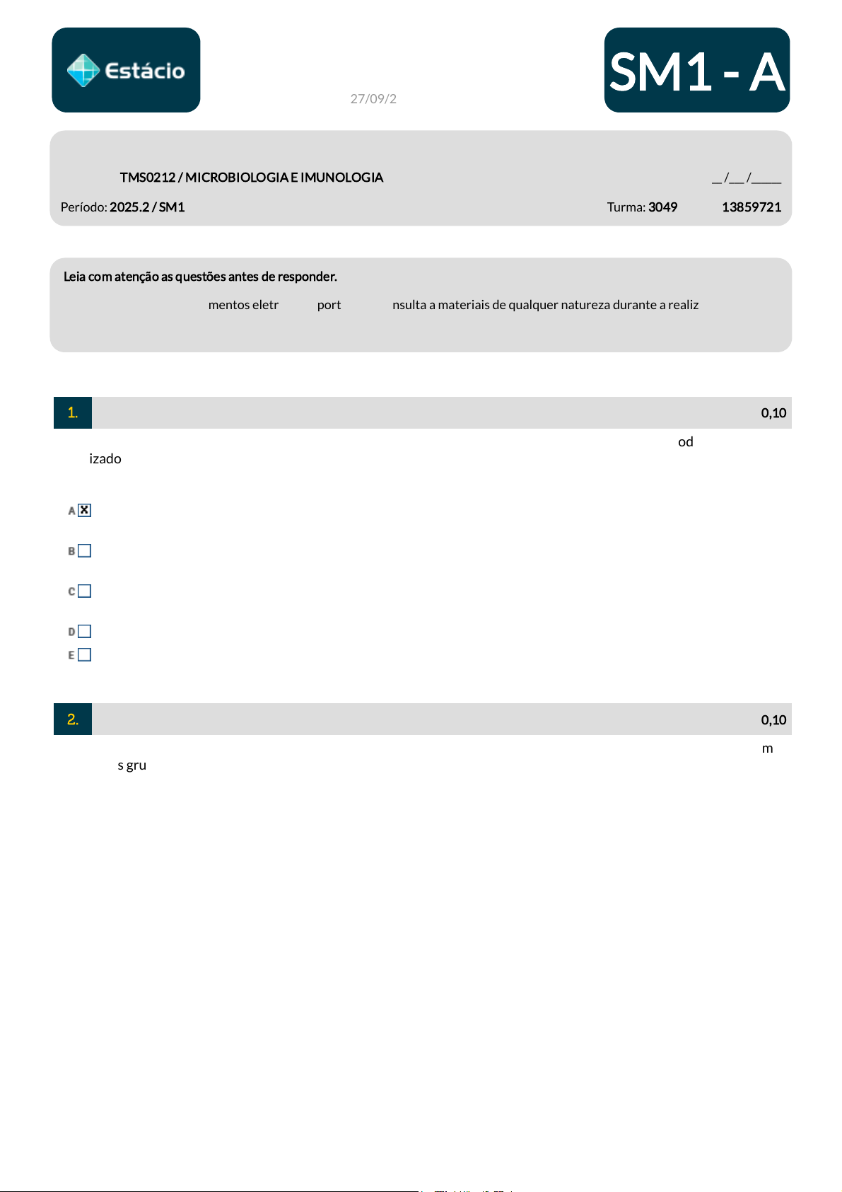7064527293 SM1 - A 27/09/2025 15:19 Nome: Matrícula: ____________________ Disciplina: TMS0212 / MICROBIOLOGIA E IMUNOLOGIA Data: ___ /___ /______ Período: 2025.2 / SM1 Turma: 3049 NSQ: 13859721 Leia com atenção as questões antes de responder. É proibido o uso de equipamentos eletrônicos portáteis e consulta a materiais de qualquer natureza durante a realização da prova. Boa prova. 1. _______ de 0,10 A microbiologia é definida como " a ciência que estuda os micro-organismos, ou seja, organismos que só podem ser visualizados com a ajuda de equipamentos, como o microscópio" e portanto tem como um dos seus alvos de estudo, as bactérias. Sobre este grupo de microrganismos, marque a resposta correta: A estrutura de uma bactéria é formada basicamente por plasmídeo, nucleoide, citoplasma, ribossomos, membrana plasmática e parede celular. A célula bacteriana se reproduz por divisão binária e sendo dependente de um mecanismo assexuado de reprodução, nas bactérias não há possibilidade de variabilidade genética. Bactérias podem crescer em aerofilia, microaerofilia ou anaerobiose mas todas apresentam o mesmo padrão de crescimento quando submetidas ao meio de cultura líquido. Bactérias são organismos eucariontes, unicelulares dotados de capacidade reprodutiva. As bactérias são seres procariotos como as archaeas e os representantes dos dois grupos, por serem metabolicamente muito simples, não possuem exigências nutricionais para crescimento in vitro. 2. _______ de 0,10 Considerando os diferentes grupos de microrganismos, associe as características descritas na segunda coluna com os respectivos grupos citados na primeira coluna. (1) Bactérias (2) Fungos (3) Vírus (4) Protozoários ( ) São seres unicelulares eucariontes amplamente distribuídos na natureza, apresentam motilidade por cílios, flagelos e emissão de pseudópodes - ex: amebas. ( ) São seres eucariontes uni ou pluricelulares, apresentam parede celular rígida, alguns dos indivíduos desse grupo apresentam estruturas filamentosas (hifas) e outros como leveduras. São amplamente utilizados na indústria para produção de antibióticos e de alimentos ( ) São seres procariontes unicelulares, apresentam DNA circular (cromossomo único) e muitas espécies estão relacionadas a doenças ( ) São parasitas intracelulares obrigatórios (replicam-se dentro das células de seus hospedeiros) pois não apresentam a célula como unidade estrutural básica. Seu genoma pode ser DNA ou RNA. Assinale abaixo a alternativa correta: 4,1,2,3 1,2,4,3 1,2,3,4 4,2,1,3 4,3,2, 1 3. _______ de 0,10 A teoria da abiogênese, também chamada de teoria da geração espontânea, foi derrubada após experimentos de pesquisadores como Louis Pasteur, que realizou um trabalho considerado conclusivo para vários estudiosos. Louis Pasteur utilizou em seu experimento: roupas sujas de suor como forma de atrair formas de vida. um balão de vidro com gargalo alongado e caldo nutritivo em seu interior. um microscópio no qual foi possível identificar micro-organismos. alguns frascos, abertos e fechados, contendo carne em seu interior. uma mistura de metano, amônia, hidrogênio e vapor de água no interior de um balão de vidro. 4. _______ de 0,10 A estrutura de uma bactéria é formada basicamente por plasmídeo, nucleoide, citoplasma, ribossomos, membrana plasmática e parede celular. Esses componentes na imagem acima correspondem, nessa ordem, aos números: nenhuma das alternativas C) 1, 2, 8, 3, 7 e 6 D) 1, 2, 8, 3, 7 e 6 B) 3, 2, 5, 1, 4 e 8 a) 2, 3, 4, 5, 9 e 7 5. _______ de 0,10 Os órgãos linfoides desempenham papéis essenciais na geração e na resposta do sistema imunológico. Qual das alternativas a seguir descreve corretamente o tipo de órgão linfoide e sua respectiva função? Órgãos linfoides primários incluem a medula óssea e o timo, onde ocorre a produção e maturação dos linfócitos T e B. Órgãos linfoides secundários incluem a medula óssea e o timo, onde os linfócitos T se ativam e proliferam. Órgãos linfoides primários incluem as amígdalas e as placas de Peyer, onde ocorre a produção de anticorpos IgA. Órgãos linfoides primários incluem o baço e os linfonodos, onde ocorre a produção e maturação dos linfócitos T e B. Órgãos linfoides secundários incluem os linfonodos e as amígdalas, onde os linfócitos T amadurecem e produzem anticorpos. 6. _______ de 0,10 Os microrganismos são encontrados na natureza nos mais variados ambientes, com variações nas condições físicas que podem comprometer ou potencializar o crescimento. Dentre os principais fatores físicos se pode citar a temperatura, o pH, a disponibilidade de água e O2. Com relação à classificação dos microrganismos segundo o crescimento ótimo nas faixas de temperatura, assinale a alternativa correta: Mesófilos são aqueles que possuem crescimento ótimo em faixas de temperaturas baixas Hipertermófilos são aqueles que apresentam crescimento ótimo em faixas de temperatura altas Mesófilos são aqueles que possuem crescimento ótimo em temperaturas medianas Termófilos são aqueles que tem crescimento ótimo em temperaturas extramamente elevadas Psicrófilos são aqueles que tem crescimento ótimo em temperaturas medianas 7. _______ de 0,10 A figura abaixo representa uma curva de crescimento típica de uma população bacteriana. Conhecendo as fases do crescimento bacteriano, indicadas pelos números 1, 2, 3 e 4, pode se afirmar que: Campus: MARACANÃ Prova Impressa em 27/09/2025 por AMANDA MARIA DA SILVA SANTOS Ref.: 7064527293 Prova Montada em 27/09/2025 C) Na fase 2 ocorre o crescimento exponencial das células, o tempo de geração é constante e caracterizada por ser um período onde as células estão mais ¿saudáveis¿. B) A fase 2 é caracterizada por ser uma fase em que as células estão mais ¿saudáveis¿ e são utilizadas para estudos enzimáticos e de outros componentes celulares. E) A fase 3 é conhecida co