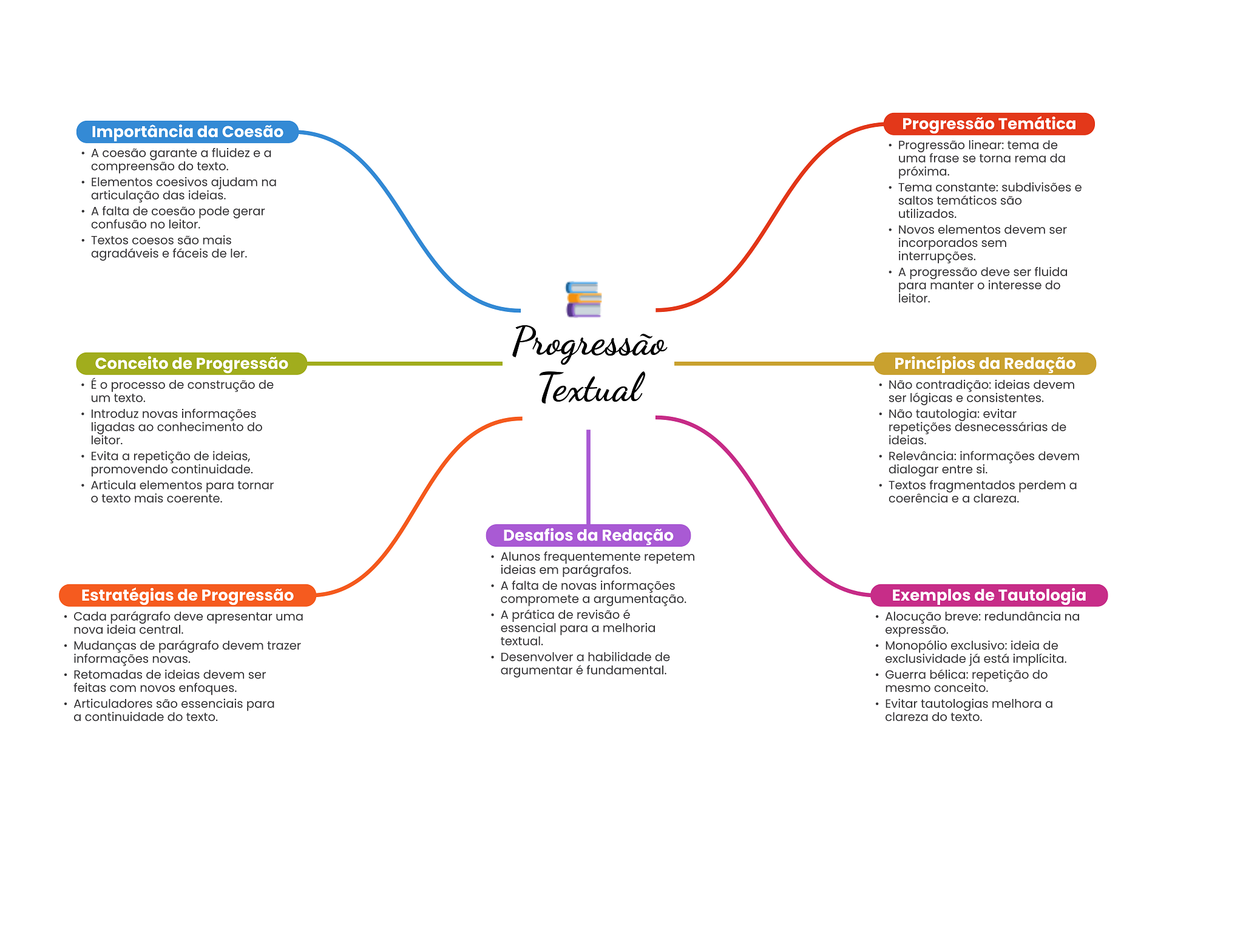 Importância da Coesão Progressão Temática Progressão linear: tema de A coesão garante a fluidez e a uma frase se torna rema da compreensão do texto. próxima. Elementos coesivos ajudam na Tema constante: subdivisões e articulação das ideias. saltos temáticos são A falta de coesão pode gerar utilizados. confusão no leitor. Novos elementos devem ser Textos coesos são mais incorporados sem agradáveis e fáceis de ler. interrupções. A progressão deve ser fluida para manter O interesse do leitor. Progressão Conceito de Progressão Princípios da Redação É processo de construção de um texto. Textual Não contradição: ideias devem ser lógicas e consistentes. Introduz novas informações Não tautologia: evitar ligadas ao conhecimento do repetições desnecessárias de leitor. ideias. Evita a repetição de ideias, Relevância: informações devem promovendo continuidade. dialogar entre si. Articula elementos para tornar Textos fragmentados perdem a texto mais coerente. coerência e a clareza. Desafios da Redação Alunos frequentemente repetem ideias em parágrafos. A falta de novas informações Estratégias de Progressão compromete a argumentação. Exemplos de Tautologia Cada parágrafo deve apresentar uma A prática de revisão é Alocução breve: redundância na nova ideia central. essencial para a melhoria expressão. Mudanças de parágrafo devem trazer textual. Monopólio exclusivo: ideia de informações novas. Desenvolver a habilidade de exclusividade já está implícita. Retomadas de ideias devem ser argumentar é fundamental. Guerra bélica: repetição do feitas com novos enfoques. mesmo conceito. Articuladores são essenciais para Evitar tautologias melhora a a continuidade do texto. clareza do texto.