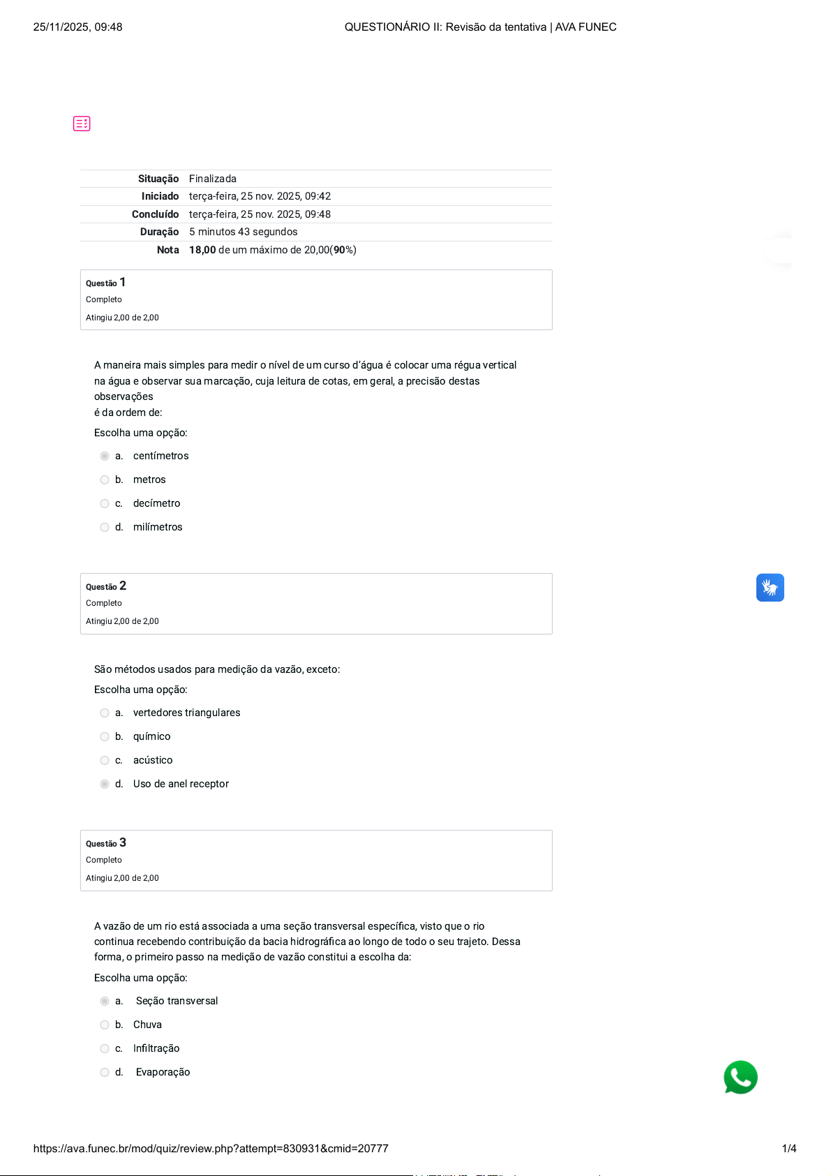 Situação Finalizada Iniciado terça-feira, 25 nov. 2025, 09:42 Concluído terça-feira, 25 nov. 2025, 09:48 Duração 5 minutos 43 segundos Nota 18,00 de um máximo de 20,00(90%) Questão 1 Completo Atingiu 2,00 de 2,00 Questão 2 Completo Atingiu 2,00 de 2,00 Questão 3 Completo Atingiu 2,00 de 2,00 A maneira mais simples para medir o nível de um curso d’água é colocar uma régua vertical na água e observar sua marcação, cuja leitura de cotas, em geral, a precisão destas observações é da ordem de: Escolha uma opção: a. centímetros b. metros c. decímetro d. milímetros São métodos usados para medição da vazão, exceto: Escolha uma opção: a. vertedores triangulares b. químico c. acústico d. Uso de anel receptor A vazão de um rio está associada a uma seção transversal específica, visto que o rio continua recebendo contribuição da bacia hidrográfica ao longo de todo o seu trajeto. Dessa forma, o primeiro passo na medição de vazão constitui a escolha da: Escolha uma opção: a. Seção transversal b. Chuva c. Infiltração d. Evaporação 25/11/2025, 09:48 QUESTIONÁRIO II: Revisão da tentativa | AVA FUNEC https://ava.funec.br/mod/quiz/review.php?attempt=830931&cmid=20777 1/4 Questão 4 Completo Atingiu 2,00 de 2,00 Questão 5 Completo Atingiu 0,00 de 2,00 Questão 6 Completo Atingiu 2,00 de 2,00 Para a caracterização do regime fluvial de um curso d’água é de fundamental importância por ocasião da escolha da seção se observar os seguintes fatores: I. Natureza do leito, sendo preferível leito rochoso que não sofre alterações; II. Margens bem definidas e livres de pontos singulares que possam perturbar o escoamento; III. Seção localizada em um trecho mais ou menos retilíneo; IV. Obras hidráulicas existentes; Assinale a alternativa correta Escolha uma opção: a. Somente as alternativas III e IV são verdadeiras b. Somente as alternativas I e II são verdadeiras c. Todas as alternativas são verdadeiras d. Somente as alternativas II e III são verdadeiras Em alguns casos a consideração de uma relação única entre o nível da água e a vazão em uma seção transversal do rio é aceitável, constituindo o que se chama de: Escolha uma opção: a. Flutuador. b. Evaporação. c. Curva-chave. d. Vazão. Qual o método mais comum de medição com molinete? Escolha uma opção: a. Com teleférico. b. Com barco fixo c. Sobre pontes. d. A vau. 25/11/2025, 09:48 QUESTIONÁRIO II: Revisão da tentativa | AVA FUNEC https://ava.funec.br/mod/quiz/review.php?attempt=830931&cmid=20777 2/4 Questão 7 Completo Atingiu 2,00 de 2,00 Questão 8 Completo Atingiu 2,00 de 2,00 Questão 9 Completo Atingiu 2,00 de 2,00 Esse método consiste simplesmente em determinar a velocidade de deslocamento de um objeto flutuante, medindo o tempo necessário para que ele percorra um trecho de rio de comprimento conhecido. Este é o método: Escolha uma opção: a. Com flutuadores. b. A vau. c. Acústico d. Molinete. São placas de metal inoxidável ou de madeira colocadas de maneira que o elemento inferior fique na água mesmo em caso de estiagem excepcional. A essa definição dá-se o nome de: Escolha uma opção: a. Régua plástica. b. Flutuador. c. Limnígrafo. d. Limnímetro. O método químico geralmente é adotado para rios de pouca profundidade e com leito rochoso, onde o uso de molinete é dificultado, e consiste em injetar uma substância concentrada e medir a concentração em um certo ponto: Escolha uma opção: a. Precipitado. b. A montante. c. Evaporado. d. A jusante. 25/11/2025, 09:48 QUESTIONÁRIO II: Revisão da tentativa | AVA FUNEC https://ava.funec.br/mod/quiz/review.php?attempt=830931&cmid=20777 3/4 Questão 10 Completo Atingiu 2,00 de 2,00 --> É possível calcular usando o método de molinete, exceto: Escolha uma opção: a. velocidade do escoamento em diversos pontos da seção do curso d’água b. vazão c. profundidade d. área da seção transversal do curso d’água 25/11/2025, 09:48 QUESTIONÁRIO II: Revisão da tentativa | AVA FUNEC https://ava.funec.br/mod/quiz/review.php?attempt=830931&cmid=20777 4/4