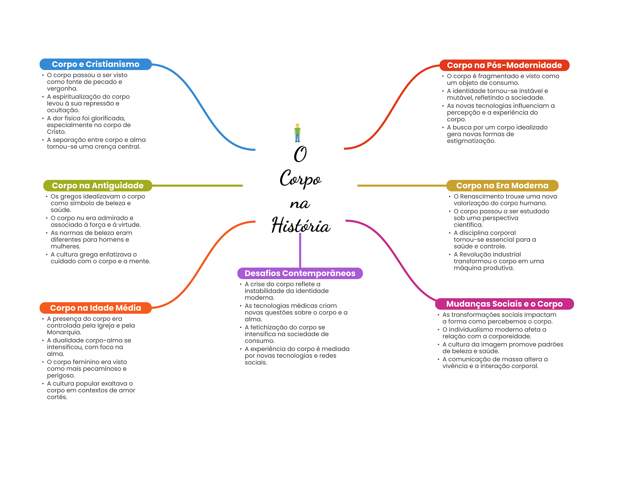 Corpo e Cristianismo Corpo na Pós-Modernidade corpo passou a ser visto corpo é fragmentado e visto como como fonte de pecado e um objeto de consumo. vergonha. A identidade tornou-se instável e A espiritualização do corpo mutável, refletindo a sociedade. levou à sua repressão e As novas tecnologias influenciam a ocultação. percepção e a experiência do A dor física foi glorificada, corpo. especialmente no corpo de A busca por um corpo idealizado Cristo. gera novas formas de A separação entre corpo e alma estigmatização. tornou-se uma crença central. Corpo na Antiguidade Corpo Corpo na Era Moderna Os gregos idealizavam corpo Renascimento trouxe uma nova como símbolo de beleza e na valorização do corpo humano. saúde. corpo passou a ser estudado corpo nu era admirado e associado à força e à virtude. História sob uma perspectiva científica. As normas de beleza eram A disciplina corporal diferentes para homens e tornou-se essencial para a mulheres. saúde e controle. A cultura grega enfatizava A Revolução Industrial cuidado com corpo e a mente. transformou O corpo em uma máquina produtiva. Desafios Contemporâneos A crise do corpo reflete a instabilidade da identidade moderna. Corpo na Idade Média As tecnologias médicas criam Mudanças Sociais e Corpo novas questões sobre O corpo e a As transformações sociais impactam A presença do corpo era alma. a forma como percebemos corpo. controlada pela Igreja e pela A fetichização do corpo se O individualismo moderno afeta a Monarquia. intensifica na sociedade de relação com a corporeidade. A dualidade corpo-alma se consumo. intensificou, com foco na A cultura da imagem promove padrões A experiência do corpo é mediada alma. de beleza e saúde. por novas tecnologias e redes corpo feminino era visto sociais. A comunicação de massa altera a como mais pecaminoso e vivência e a interação corporal. perigoso. A cultura popular exaltava corpo em contextos de amor cortês.