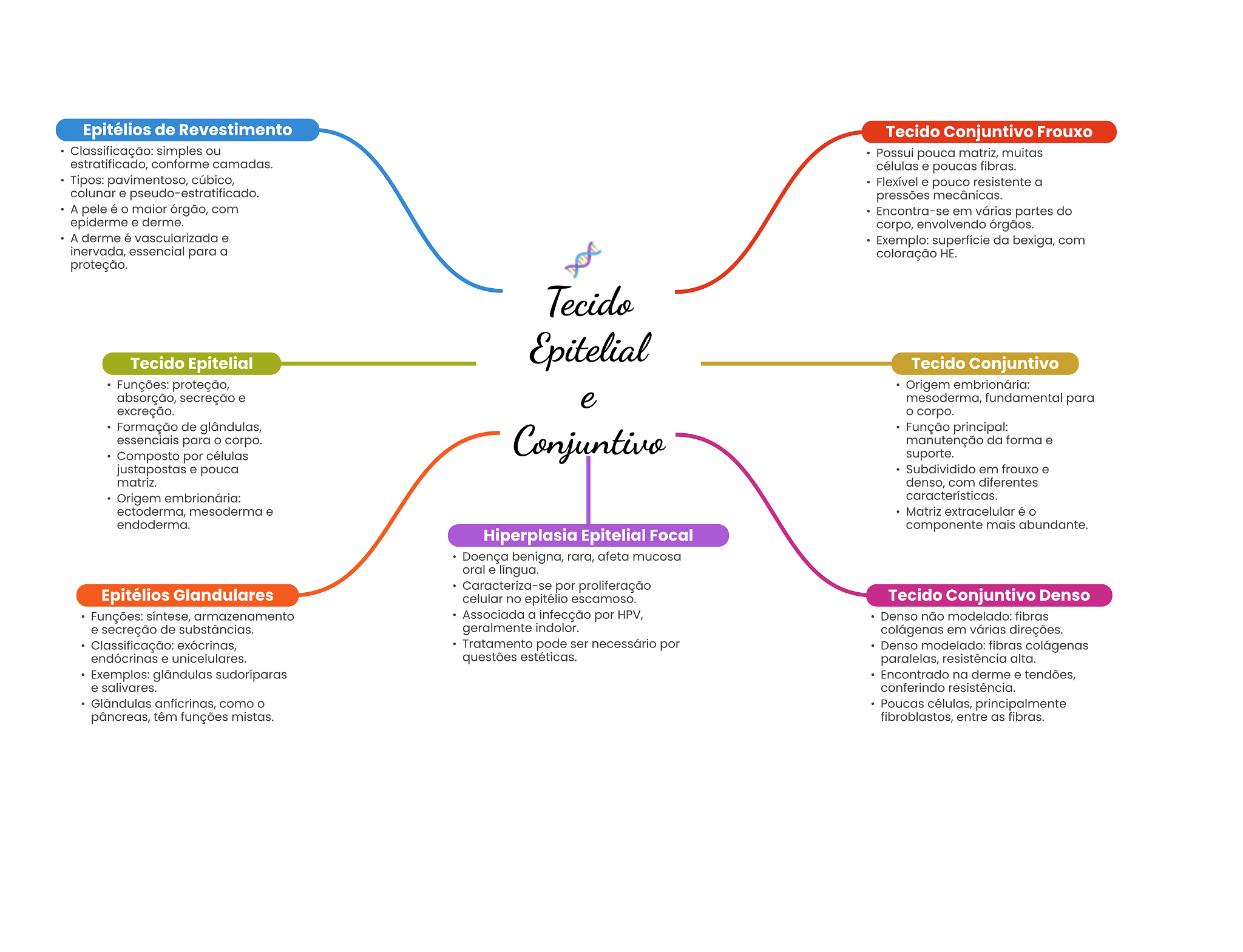 Epitélios de Revestimento Tecido Conjuntivo Frouxo Classificação: simples ou Possui pouca matriz, muitas estratificado, conforme camadas. células e poucas fibras. Tipos: pavimentoso, cúbico, Flexível e pouco resistente a colunar e pseudo-estratificado. pressões mecânicas. A pele é maior órgão, com Encontra-se em várias partes do epiderme e derme. corpo, envolvendo órgãos. A derme é vascularizada e Exemplo: superfície da bexiga, com inervada, essencial para a coloração HE. proteção. Tecido Tecido Epitelial Epitelial Tecido Conjuntivo Funções: proteção, Origem embrionária: absorção, secreção e e mesoderma, fundamental para excreção. O corpo. Formação de glândulas, Função principal: essenciais para O corpo. Conjuntivo manutenção da forma e Composto por células suporte. justapostas e pouca Subdividido em frouxo e matriz. denso, com diferentes Origem embrionária: características. ectoderma, mesoderma e Matriz extracelular é endoderma. componente mais abundante. Hiperplasia Epitelial Focal Doença benigna, rara, afeta mucosa oral e língua. Caracteriza-se por proliferação Epitélios Glandulares celular no epitélio escamoso. Tecido Conjuntivo Denso Funções: síntese, armazenamento Associada a infecção por HPV, Denso não modelado: fibras e secreção de substâncias. geralmente indolor. colágenas em várias direções. Classificação: exócrinas, Tratamento pode ser necessário por Denso modelado: fibras colágenas endócrinas e unicelulares. questões estéticas. paralelas, resistência alta. Exemplos: glândulas Encontrado na derme e tendões, e salivares. conferindo resistência. Glândulas anfícrinas, como Poucas células, principalmente pâncreas, têm funções mistas. fibroblastos, entre as fibras.