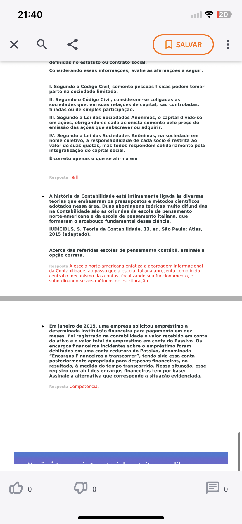 21:40 20 X SALVAR definidas no estatuto ou contrato social. Considerando essas informações, avalie as afirmações a seguir. Segundo Código Civil, somente pessoas físicas podem tomar parte na sociedade limitada. II. Segundo Código Civil, consideram-se coligadas as sociedades que, em suas relações de capital, são controladas, filiadas ou de simples participação. III. Segundo a Lei das Sociedades Anônimas, capital divide-se em ações, obrigando-se cada acionista somente pelo preço de emissão das ações que subscrever ou adquirir. IV. Segundo a Lei das Sociedades Anônimas, na sociedade em nome coletivo, a responsabilidade de cada sócio é restrita ao valor de suas quotas, mas todos respondem solidariamente pela integralização do capital social. É correto apenas que se afirma em Resposta I e II. A história da Contabilidade está intimamente ligada às diversas teorias que embasaram os pressupostos e métodos científicos adotados nessa área. Duas abordagens teóricas muito difundidas na Contabilidade são as oriundas da escola de pensamento norte-americana e da escola de pensamento italiana, que formaram arcabouço fundamental dessa ciência. IUDÍCIBUS, S. Teoria da Contabilidade. 13. ed. São Paulo: Atlas, 2015 (adaptado). Acerca das referidas escolas de pensamento contábil, assinale a opção correta. Resposta A escola enfatiza a abordagem informacional da Contabilidade, ao passo que a escola italiana apresenta como ideia central mecanismo das contas, focalizando seu funcionamento, e subordinando-se aos métodos de escrituração. Em janeiro de 2015, uma empresa solicitou empréstimo a determinada instituição financeira para pagamento em dez meses. Foi registrado na contabilidade valor recebido em conta do ativo e valor total do empréstimo em conta do Passivo. Os encargos financeiros incidentes sobre empréstimo foram debitados em uma conta redutora do Passivo, denominada "Encargos Financeiros a transcorrer", tendo sido essa conta posteriormente apropriada para despesas financeiras, no resultado, à medido do tempo transcorrido. Nessa situação, esse registro contábil dos encargos financeiros tem por base: Assinale a alternativa que corresponde a situação evidenciada. Resposta Competência. 0 0 0