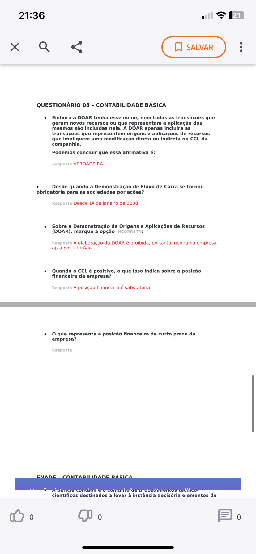21:36 21 X SALVAR QUESTIONÁRIO 08 CONTABILIDADE BÁSICA Embora a DOAR tenha esse nome, nem todas as transações que geram novos recursos ou que representam a aplicação dos mesmos são incluídas nela. A DOAR apenas incluirá as transações que representem origens e aplicações de recursos que impliquem uma modificação direta ou indireta no CCL da companhia. Podemos concluir que essa afirmativa é: Resposta VERDADEIRA. Desde quando a Demonstração de Fluxo de Caixa se tornou obrigatória para as sociedades por ações? Resposta Desde de janeiro de 2008. Sobre a Demonstração de Origens e Aplicações de Recursos (DOAR), marque a opção INCORRETA: Resposta A elaboração da DOAR é proibida, portanto, nenhuma empresa opta por utilizá-la. Quando CCL é positivo, que isso indica sobre a posição financeira da empresa? Resposta A posição financeira é satisfatória. o que representa a posição financeira de curto prazo da empresa? Resposta ENADE IDADE BÁSICA pericia de procedimentos científicos destinados a levar à instância decisória elementos de 0 0 0