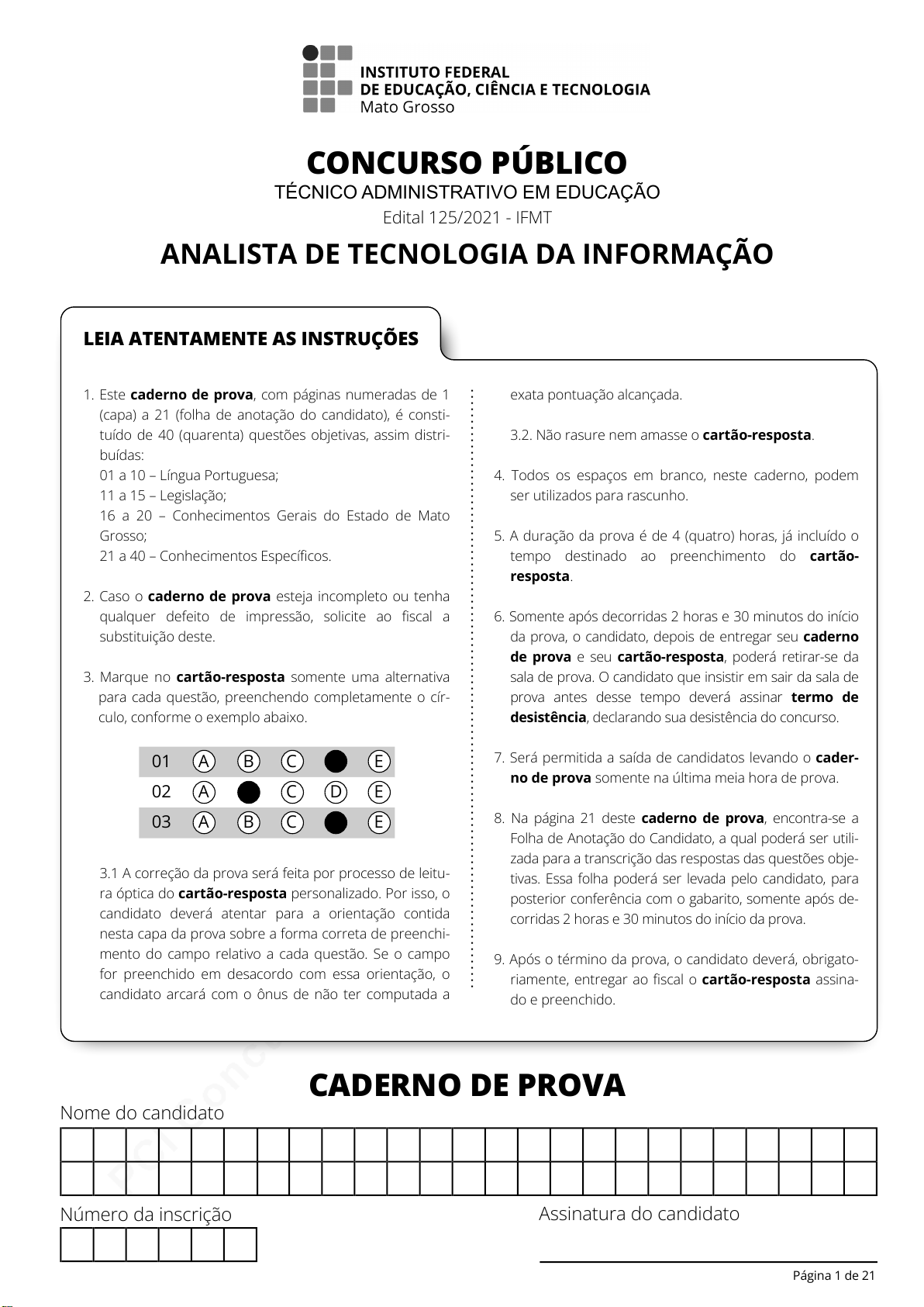 pcimarkpci MDAwMDowMDAwOjAwMDA6MDAwMDowMDAwOmZmZmY6YjEzNjpmNjgy:VHVlLCAyNSBOb3YgMjAyNSAxMTo0MjowOCAtMDMwMA== www.pciconcursos.com.br CADERNO DE PROVA Nome do candidato Número da inscrição Assinatura do candidato 1. Este caderno de prova, com páginas numeradas de 1 (capa) a 21 (folha de anotação do candidato), é consti- tuído de 40 (quarenta) questões objetivas, assim distri- buídas: 01 a 10 – Língua Portuguesa; 11 a 15 – Legislação; 16 a 20 – Conhecimentos Gerais do Estado de Mato Grosso; 21 a 40 – Conhecimentos Específicos. 2. Caso o caderno de prova esteja incompleto ou tenha qualquer defeito de impressão, solicite ao fiscal a substituição deste. 3. Marque no cartão-resposta somente uma alternativa para cada questão, preenchendo completamente o cír- culo, conforme o exemplo abaixo. 01 A B C D E 02 A B C D E 03 A B C D E 3.1 A correção da prova será feita por processo de leitu- ra óptica do cartão-resposta personalizado. Por isso, o candidato deverá atentar para a orientação contida nesta capa da prova sobre a forma correta de preenchi- mento do campo relativo a cada questão. Se o campo for preenchido em desacordo com essa orientação, o candidato arcará com o ônus de não ter computada a exata pontuação alcançada. 3.2. Não rasure nem amasse o cartão-resposta. 4. Todos os espaços em branco, neste caderno, podem ser utilizados para rascunho. 5. A duração da prova é de 4 (quatro) horas, já incluído o tempo destinado ao preenchimento do cartão- resposta. 6. Somente após decorridas 2 horas e 30 minutos do início da prova, o candidato, depois de entregar seu caderno de prova e seu cartão-resposta, poderá retirar-se da sala de prova. O candidato que insistir em sair da sala de prova antes desse tempo deverá assinar termo de desistência, declarando sua desistência do concurso. 7. Será permitida a saída de candidatos levando o cader- no de prova somente na última meia hora de prova. 8. Na página 21 deste caderno de prova, encontra-se a Folha de Anotação do Candidato, a qual poderá ser utili- zada para a transcrição das respostas das questões obje- tivas. Essa folha poderá ser levada pelo candidato, para posterior conferência com o gabarito, somente após de- corridas 2 horas e 30 minutos do início da prova. 9. Após o término da prova, o candidato deverá, obrigato- riamente, entregar ao fiscal o cartão-resposta assina- do e preenchido. Página 1 de 21 LEIA ATENTAMENTE AS INSTRUÇÕES CONCURSO PÚBLICO TÉCNICO ADMINISTRATIVO EM EDUCAÇÃO Edital 125/2021 - IFMT ANALISTA DE TECNOLOGIA DA INFORMAÇÃO pcimarkpci MDAwMDowMDAwOjAwMDA6MDAwMDowMDAwOmZmZmY6YjEzNjpmNjgy:VHVlLCAyNSBOb3YgMjAyNSAxMTo0MjowOCAtMDMwMA== www.pciconcursos.com.br Página 2 de 21 CONCURSO PÚBLICO — TÉCNICO ADMINISTRATIVO EM EDUCAÇÃO — EDITAL 125/2021 - IFMT ANALISTA DE TECNOLOGIA DA INFORMAÇÃO pcimarkpci MDAwMDowMDAwOjAwMDA6MDAwMDowMDAwOmZmZmY6YjEzNjpmNjgy:VHVlLCAyNSBOb3YgMjAyNSAxMTo0MjowOCAtMDMwMA== www.pciconcursos.com.br Página 3 de 21 CONCURSO PÚBLICO — TÉCNICO ADMINISTRATIVO EM EDUCAÇÃO — EDITAL 125/2021 - IFMT ANALISTA DE TECNOLOGIA DA INFORMAÇÃO pcimarkpci MDAwMDowMDAwOjAwMDA6MDAwMDowMDAwOmZmZmY6YjEzNjpmNjgy:VHVlLCAyNSBOb3YgMjAyNSAxMTo0MjowOCAtMDMwMA== www.pciconcursos.com.br Página 4 de 21 CONCURSO PÚBLICO — TÉCNICO ADMINISTRATIVO EM EDUCAÇÃO — EDITAL 125/2021 - IFMT ANALISTA DE TECNOLOGIA DA INFORMAÇÃO pcimarkpci MDAwMDowMDAwOjAwMDA6MDAwMDowMDAwOmZmZmY6YjEzNjpmNjgy:VHVlLCAyNSBOb3YgMjAyNSAxMTo0MjowOCAtMDMwMA== www.pciconcursos.com.br Página 5 de 21 CONCURSO PÚBLICO — TÉCNICO ADMINISTRATIVO EM EDUCAÇÃO — EDITAL 125/2021 - IFMT ANALISTA DE TECNOLOGIA DA INFORMAÇÃO pcimarkpci MDAwMDowMDAwOjAwMDA6MDAwMDowMDAwOmZmZmY6YjEzNjpmNjgy:VHVlLCAyNSBOb3YgMjAyNSAxMTo0MjowOCAtMDMwMA== www.pciconcursos.com.br Página 6 de 21 CONCURSO PÚBLICO — TÉCNICO ADMINISTRATIVO EM EDUCAÇÃO — EDITAL 125/2021 - IFMT ANALISTA DE TECNOLOGIA DA INFORMAÇÃO pcimarkpci MDAwMDowMDAwOjAwMDA6MDAwMDowMDAwOmZmZmY6YjEzNjpmNjgy:VHVlLCAyNSBOb3YgMjAyNSAxMTo0MjowOCAtMDMwMA== www.pciconcursos.com.br Página 7 de 21 CONCURSO PÚBLICO — TÉCNICO ADMINISTRATIVO EM EDUCAÇÃO — EDITAL 125/2021 - IFMT ANALISTA DE TECNOLOGIA DA INFORMAÇÃO pcimarkpci MDAwMDowMDAwOjAwMDA6MDAwMDowMDAwOmZmZmY6YjEzNjpmNjgy:VHVlLCAyNSBOb3YgMjAyNSAxMTo0MjowOCAtMDMwMA== www.pciconcursos.com.br Página 8 de 21 CONCURSO PÚBLICO — TÉCNICO ADMINISTRATIVO EM EDUCAÇÃO — EDITAL 125/2021 - IFMT ANALISTA DE TECNOLOGIA DA INFORMAÇÃO pcimarkpci MDAwMDowMDAwOjAwMDA6MDAwMDowMDAwOmZmZmY6YjEzNjpmNjgy:VHVlLCAyNSBOb3YgMjAyNSAxMTo0MjowOCAtMDMwMA== www.pciconcursos.com.br Página 9 de 21 CONCURSO PÚBLICO — TÉCNICO ADMINISTRATIVO EM EDUCAÇÃO — EDITAL 125/2021 - IFMT ANALISTA DE TECNOLOGIA DA INFORMAÇÃO pcimarkpci MDAwMDowMDAwOjAwMDA6MDAwMDowMDAwOmZmZmY6YjEzNjpmNjgy:VHVlLCAyNSBOb3YgMjAyNSAxMTo0MjowOCAtMDMwMA== www.pciconcursos.com.br Página 10 de 21 CONCURSO PÚBLICO — TÉCNICO ADMINISTRATIVO EM EDUCAÇÃO — EDITAL 125/2021 - IFMT ANALISTA DE TECNOLOGIA DA INFORMAÇÃO pcimarkpci MDAwMDowMDAwOjAwMDA6MDAwMDowMDAwOmZmZmY6YjEzNjpmNjgy:VHVlLCAyNSBOb3YgMjAyNSAxMTo0MjowOCAtMDMwMA== www.pciconcursos.com.br Página 11 de 21 CONCURSO PÚBLICO — TÉCNICO ADMINISTRATIVO EM EDUCAÇÃO — EDITAL 125/2021 - IFMT ANALISTA DE TECNOLOGIA DA INFORMAÇÃO pcimarkpci MDAwMDowMDAwOjAwMDA6MDAwMDowMDAwOmZmZmY6YjEzNjpmNjgy:VHVlLCAyNSBOb3YgMjAyNSAxMTo0MjowOCAtMDMwMA== www.pciconcursos.com.br Página 12 de 21 CONCURSO PÚBLICO — TÉCNICO ADMINISTRATIVO EM EDUCAÇÃO — EDITAL 125/2021 - IFMT ANALISTA DE TECNOLOGIA DA INFORMAÇÃO CONHECIMENTOS ESPECÍFICOS QUESTÃO 21 Analise as afirmativas abaixo a respeito de padrões de projeto: I - A abordagem MVC permite mudar a maneira como uma visão responde às entradas do usuário sem mudar sua apresentação visual; para fazer isso, a MVC encapsula o mecanismo de resposta em um objeto Controlador. II - O relacionamento View-Controller é 