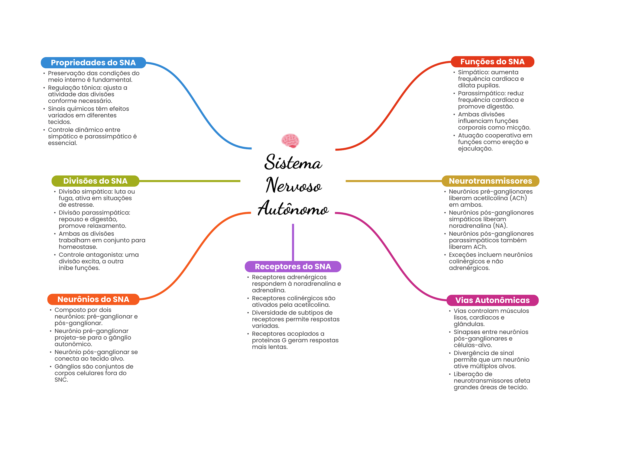 Propriedades do SNA Funções do SNA Preservação das condições do Simpático: aumenta meio interno é fundamental. frequência cardíaca e Regulação tônica: ajusta a dilata pupilas. atividade das divisões Parassimpático: reduz conforme necessário. frequência cardíaca e Sinais químicos têm efeitos promove digestão. variados em diferentes Ambas divisões tecidos. influenciam funções Controle dinâmico entre corporais como micção. simpático e parassimpático é Atuação cooperativa em essencial. funções como ereção e ejaculação. Sistema Divisões do SNA Nervoso Neurotransmissores Divisão simpática: luta ou Neurônios pré-ganglionares fuga, ativa em situações liberam acetilcolina (ACh) de estresse. Autônomo em ambos. Divisão parassimpática: Neurônios pós-ganglionares repouso e digestão, simpáticos liberam promove relaxamento. noradrenalina (NA). Ambas as divisões Neurônios pós-ganglionares trabalham em conjunto para parassimpáticos também homeostase. liberam ACh. Controle antagonista: uma Exceções incluem neurônios divisão excita, a outra colinérgicos e não inibe funções. Receptores do SNA adrenérgicos. Receptores adrenérgicos respondem à noradrenalina e adrenalina. Neurônios do SNA Receptores colinérgicos são Vias Autonômicas ativados pela acetilcolina. Composto por dois Diversidade de subtipos de Vias controlam músculos neurônios: pré-ganglionar e receptores permite respostas lisos, cardíacos e pós-ganglionar. variadas. glândulas. Neurônio pré-ganglionar Receptores acoplados a Sinapses entre neurônios projeta-se para gânglio autonômico. proteínas G geram respostas pós-ganglionares e mais lentas. células-alvo. Neurônio pós-ganglionar se Divergência de sinal conecta ao tecido alvo. permite que um neurônio Gânglios são conjuntos de ative múltiplos alvos. corpos celulares fora do Liberação de SNC. neurotransmissores afeta grandes áreas de tecido.