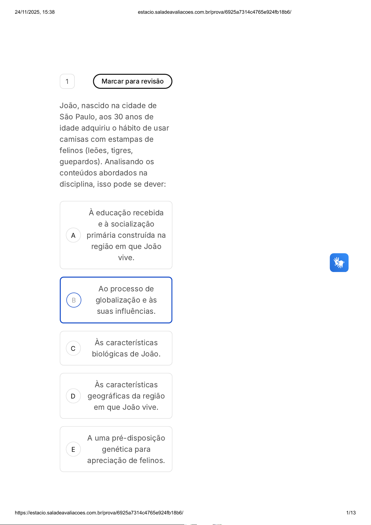 A B C D E 1 Marcar para revisão João, nascido na cidade de São Paulo, aos 30 anos de idade adquiriu o hábito de usar camisas com estampas de felinos (leões, tigres, guepardos). Analisando os conteúdos abordados na disciplina, isso pode se dever: À educação recebida e à socialização primária construída na região em que João vive. Ao processo de globalização e às suas influências. Às características biológicas de João. Às características geográficas da região em que João vive. A uma pré-disposição genética para apreciação de felinos. 24/11/2025, 15:38 estacio.saladeavaliacoes.com.br/prova/6925a7314c4765e924fb18b6/ https://estacio.saladeavaliacoes.com.br/prova/6925a7314c4765e924fb18b6/ 1/13 A B C 2 Marcar para revisão Durante uma reunião de pais e professores, a professora Ana percebe que os pais de Felipe, um aluno, estão preocupados com a dificuldade de seu filho em fazer amigos na escola. Como a professora Ana pode ajudar Felipe a desenvolver habilidades sociais e se sentir mais acolhido? Sugerir que Felipe seja colocado em um programa de tutoria para alunos com dificuldades sociais. Incentivar Felipe a se juntar a clubes e atividades extracurriculares onde ele possa encontrar alunos com interesses similares. Aconselhar os pais de Felipe a procurarem terapia para ele sem envolver a escola. 24/11/2025, 15:38 estacio.saladeavaliacoes.com.br/prova/6925a7314c4765e924fb18b6/ https://estacio.saladeavaliacoes.com.br/prova/6925a7314c4765e924fb18b6/ 2/13 D E A B Ignorar a preocupação dos pais, considerando que é normal crianças terem dificuldades em fazer amigos. Organizar atividades de grupo obrigatórias para forçar Felipe a interagir com seus colegas. 3 Marcar para revisão (AMEOSC/2021 - Adaptada) Os Direitos Humanos são uma categoria de direitos básicos que devem ser garantidos a todos os cidadãos e cidadãs, sendo considerados fundamentais. Podemos afirmar que entre os direitos fundamentais é correto incluir o direito: I. a auxílios financeiros. II. à vida. III. à saúde. IV. à liberdade. Estão corretos os itens: II, III e IV, apenas. III e IV, apenas. 24/11/2025, 15:38 estacio.saladeavaliacoes.com.br/prova/6925a7314c4765e924fb18b6/ https://estacio.saladeavaliacoes.com.br/prova/6925a7314c4765e924fb18b6/ 3/13 C D E A B C D E I, II e III, apenas. I, II, III e IV. II e IV, apenas. 4 Marcar para revisão A ideia por trás da cidadania significa que ao indivíduo se reconhece direitos e deveres. Há um documento histórico, em particular, que celebra a cidadania em seu sentido pleno. A qual documento se está referindo? Carta de Direitos das Organizações das Nações Unidas de 1948. Lei Áurea de 1888. Bill of Rigths de 1689. Carta Magna de 1215. Lei do Ventre Livre de 1871. 24/11/2025, 15:38 estacio.saladeavaliacoes.com.br/prova/6925a7314c4765e924fb18b6/ https://estacio.saladeavaliacoes.com.br/prova/6925a7314c4765e924fb18b6/ 4/13 A B C 5 Marcar para revisão Maria e João são membros de uma equipe de trabalho que está enfrentando problemas de comunicação. Eles percebem que muitos conflitos surgem devido a mal-entendidos e falta de clareza nas instruções. Como Maria e João podem melhorar a comunicação dentro da equipe? Continuar a agir da mesma forma, pois os problemas de comunicação são inevitáveis em qualquer equipe. Organizar reuniões regulares para discutir os objetivos do projeto e garantir que todos entendam suas responsabilidades. Culpar uns aos outros pelos problemas de comunicação, aumentando a tensão dentro da equipe. 24/11/2025, 15:38 estacio.saladeavaliacoes.com.br/prova/6925a7314c4765e924fb18b6/ https://estacio.saladeavaliacoes.com.br/prova/6925a7314c4765e924fb18b6/ 5/13 D E A B C Deixar de comunicar informações importantes para criar um ambiente mais leve e descontraído. Ignorar os problemas de comunicação e esperar que se resolvam por conta própria. 6 Marcar para revisão São, entre outros, direitos sociais previstos na Constituição Federal: A segurança, a previdência social, a alimentação e a sindicalização. A previdência social, o transporte, a moradia e a reunião. A educação, a saúde, a alimentação e o trabalho. 00 hora : 24 min : 01 seg Ocultar Questão 10 de 10 Respondidas (10) Em branco (0) Finalizar prova 1 2 3 4 5 6 7 8 9 10 SM1 Educacao e Direitos Humanos 24/11/2025, 15:38 estacio.saladeavaliacoes.com.br/prova/6925a7314c4765e924fb18b6/ https://estacio.saladeavaliacoes.com.br/prova/6925a7314c4765e924fb18b6/ 6/13 D E A B C D E A sindicalização, a greve, a reunião e o trabalho. A greve, a segurança, a saúde e a reunião. 7 Marcar para revisão Nos termos constitucionais, a previdência social é um: Direito social. Dos fundamentos da República Federativa do Brasil. Dos objetivos fundamentais da República Federativa do Brasil. Remédio constitucional. Direito de nacionalidade. 8 Marcar para revisão 24/11/2025, 15:38 estacio.saladeavaliacoes.com.br/prova/6925a7314c4765e924fb18b6/ https://estacio.saladeavaliacoes.com.br/prova/6925a7314c4765e924fb18b6/ 7/13 A B C Acerca do direito de reunião, marque a alternativa correta: Todos podem se reunir em locais públicos, mesmo que estejam com armas, desde que pacificamente. É permitida a reunião em locais públicos, mesmo com armas, desde que haja autorização da autoridade competente. A liberdade de reunião protege as manifestações em locais públicos, mas não as passeatas. 24/11/2025, 15:38 estacio.saladeavaliacoes.com.br/prova/6925a7314c4765e924fb18b6/ https://estacio.saladeavaliacoes.com.br/prova/6925a7314c4765e924fb18b6/ 8/13 D E São permitidas passeatas e manifestações pacíficas, sem armas, desde que autorizadas pela autoridade competente. Todos podem reunir- se pacificamente, sem armas, em locais abertos ao público, independentemente de autorização, desde que não frustrem outra reunião anteriormente convocada para o mesmo local. 9 Marcar para revisão Leia as afirmativas a seguir e marque a opção CORRETA: 24/11