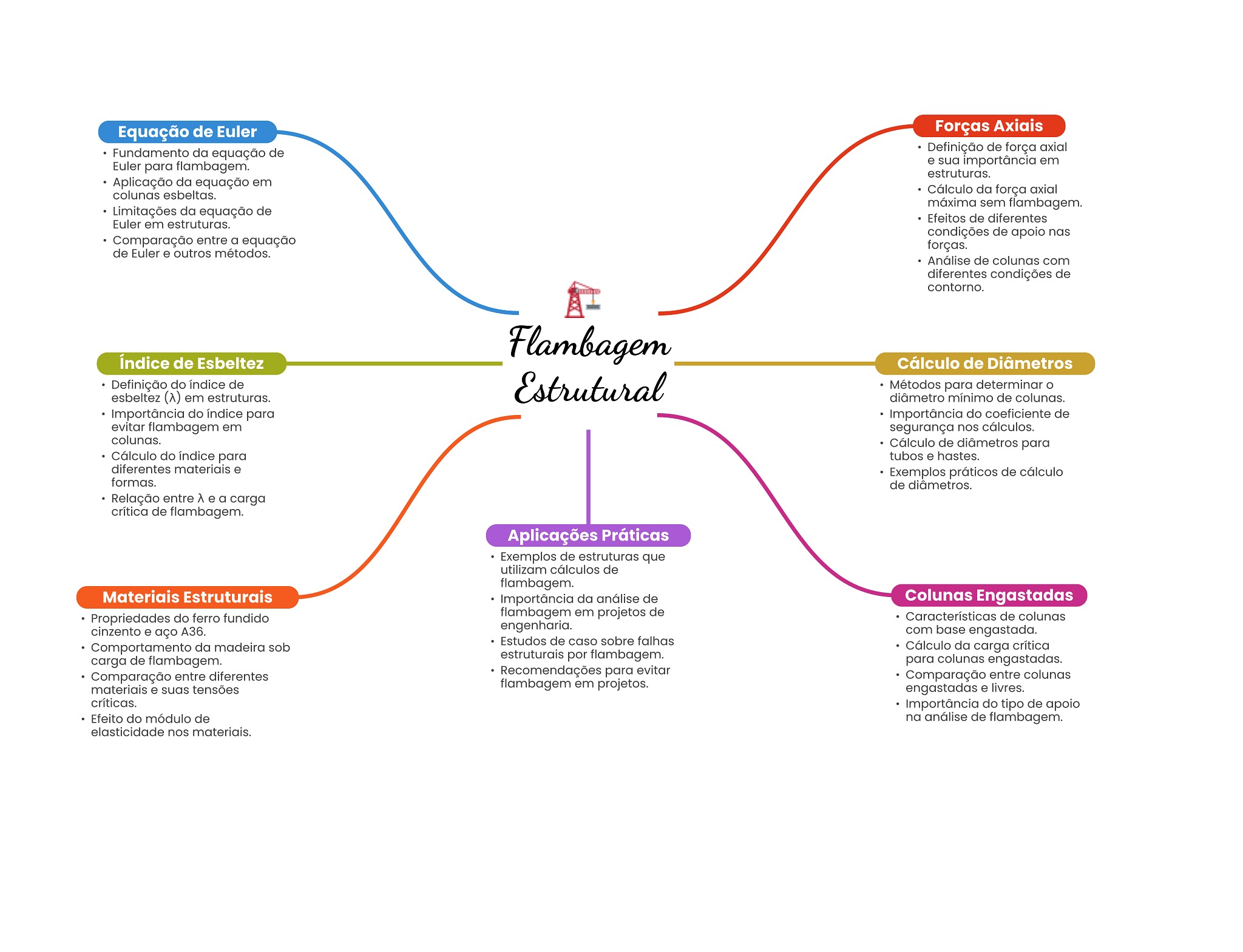 Equação de Euler Forças Axiais Fundamento da equação de Definição de força axial Euler para flambagem. e sua importância em estruturas. Aplicação da equação em colunas esbeltas. Cálculo da força axial máxima sem flambagem. Limitações da equação de Efeitos de diferentes Euler em estruturas. condições de apoio nas Comparação entre a equação forças. de Euler e outros métodos. Análise de colunas com diferentes condições de contorno. Flambagem Indice de Esbeltez Cálculo de Diâmetros do índice de Estrutural Métodos para determinar O esbeltez em estruturas. diâmetro mínimo de colunas. Importância do índice para Importância do coeficiente de evitar flambagem em segurança nos cálculos. colunas. Cálculo de diâmetros para Cálculo do índice para tubos e hastes. diferentes materiais e Exemplos práticos de cálculo formas. de diâmetros. Relação entre e a carga crítica de flambagem. Aplicações Práticas Exemplos de estruturas que utilizam cálculos de flambagem. Materiais Estruturais Importância da análise de Colunas Engastadas Propriedades do ferro fundido flambagem em projetos de Características de colunas cinzento e aço A36. engenharia. com base engastada. Estudos de caso sobre falhas Comportamento da madeira sob Cálculo da carga crítica carga de flambagem. estruturais por flambagem. para colunas engastadas. Comparação entre diferentes Recomendações para evitar Comparação entre colunas materiais e suas tensões flambagem em projetos. engastadas e livres. críticas. Importância do tipo de apoio Efeito do módulo de na análise de flambagem. elasticidade nos materiais.