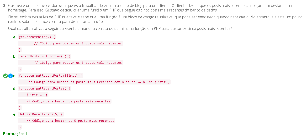 2 Gustavo é um desenvolvedor web que está trabalhando em um projeto de blog para um cliente. 0 cliente deseja que os posts mais recentes apareçam em destaque na homepage. Para isso, Gustavo decidiu criar uma função em PHP que pegue os cinco posts mais recentes do banco de dados. Ele se lembra das aulas de PHP que teve e sabe que uma função é um bloco de código reutilizável que pode ser executado quando necessário. No entanto, ele está um pouco confuso sobre a sintaxe correta para definir uma função. Qual das alternativas a seguir apresenta a maneira correta de definir uma função em PHP para buscar cinco posts mais recentes? a getRecentPosts (5) { // Código para buscar os 5 posts mais recentes } b recentPosts = function (5) { // Código para buscar os 5 posts mais recentes } function getRecentPosts ($limit) { // Código para buscar os posts mais recentes com base no valor de $limit } d function getRecentPosts { $limit 5; // Código para buscar os posts mais recentes } e def getRecentPosts (5) { // Código para buscar os 5 posts mais recentes } Pontuação: 1