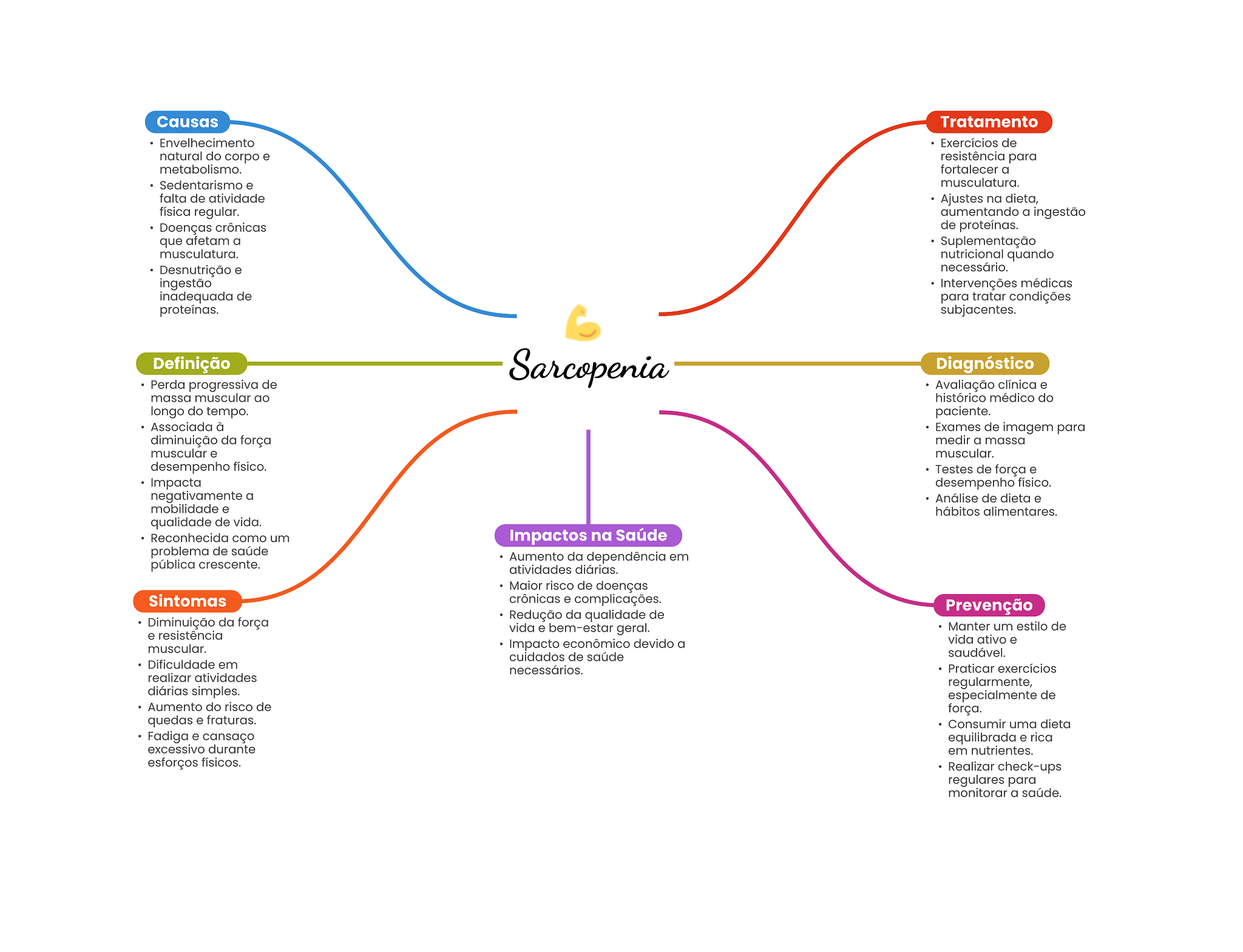 Causas Tratamento Envelhecimento Exercícios de natural do corpo e resistência para metabolismo. fortalecer a Sedentarismo e musculatura. falta de atividade Ajustes na dieta, física regular. aumentando a ingestão Doenças crônicas de proteínas. que afetam a Suplementação musculatura. nutricional quando Desnutrição e necessário. ingestão Intervenções médicas inadequada de para tratar condições proteínas. subjacentes. Definição Sarcopenia Diagnóstico Perda progressiva de Avaliação clínica e massa muscular ao histórico médico do longo do tempo. paciente. Associada à Exames de imagem para diminuição da força medir a massa muscular e muscular. desempenho físico. Testes de força e Impacta desempenho físico. negativamente a Análise de dieta e mobilidade e hábitos alimentares. qualidade de vida. Reconhecida como um Impactos na Saúde problema de saúde Aumento da dependência em pública crescente. atividades diárias. Maior risco de doenças Sintomas crônicas e complicações. Prevenção Redução da qualidade de Diminuição da força e resistência vida e bem-estar geral. Manter um estilo de Impacto econômico devido a vida ativo e muscular. cuidados de saúde saudável. Dificuldade em necessários. Praticar exercícios realizar atividades regularmente, diárias simples. especialmente de Aumento do risco de força. quedas e fraturas. Consumir uma dieta Fadiga e cansaço equilibrada e rica excessivo durante em nutrientes. esforços físicos. Realizar check-ups regulares para monitorar a saúde.