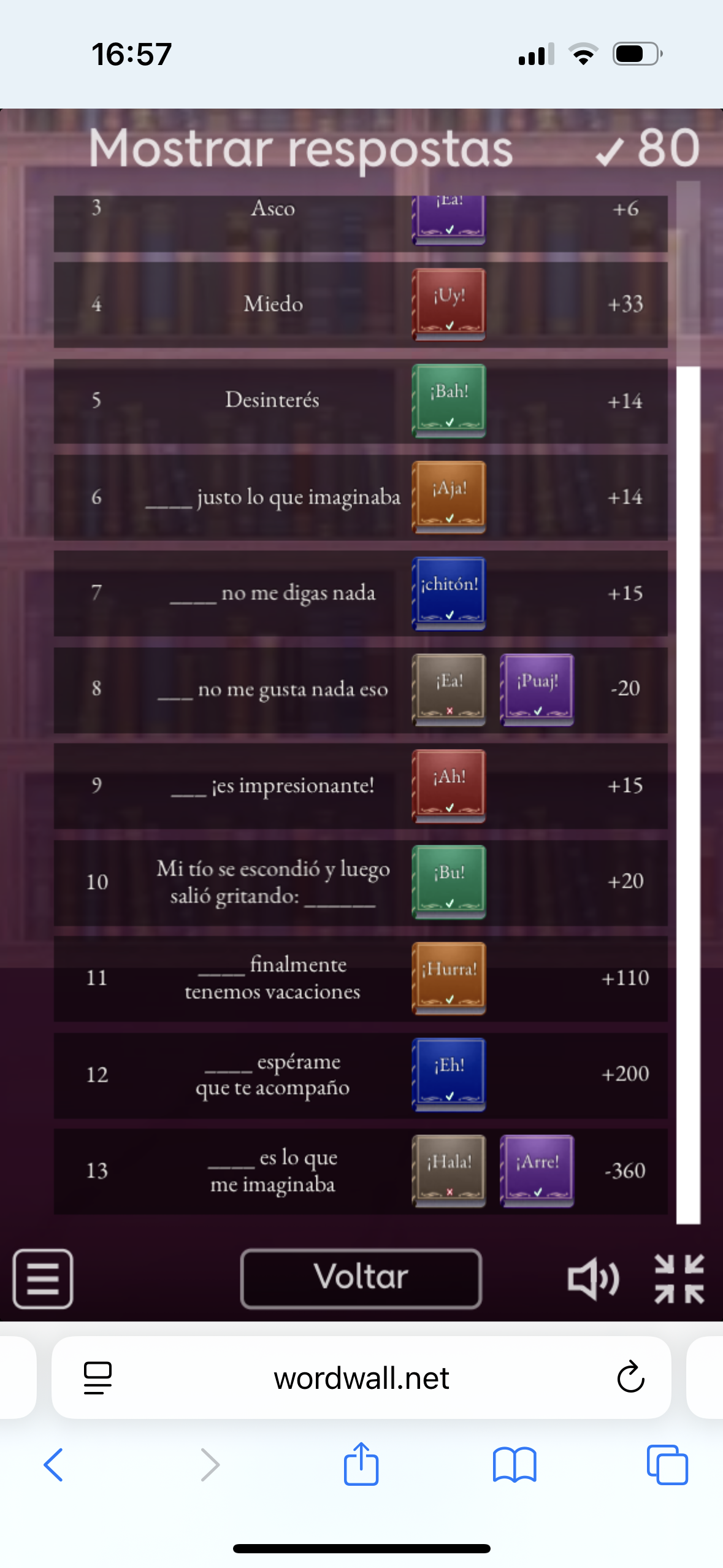 16:57 Mostrar respostas 80 3 Asco ¡Ea! +6 4 Miedo ¡Uy! +33 5 Desinterés Bah! +14 6 justo lo que imaginaba ¡Aja! +14 7 no me digas nada ¡chitón! +15 8 no me gusta nada eso ¡Ea! ¡Puaj! -20 9 impresionante! ¡Ah! +15 10 Mi tío se escondió y luego ¡Bu! +20 salió gritando: finalmente 11 Hurra! +110 tenemos vacaciones 12 espérame ¡Eh! +200 que te acompaño 13 es lo que Hala! ¡Arre! -360 me imaginaba Voltar K wordwall.net