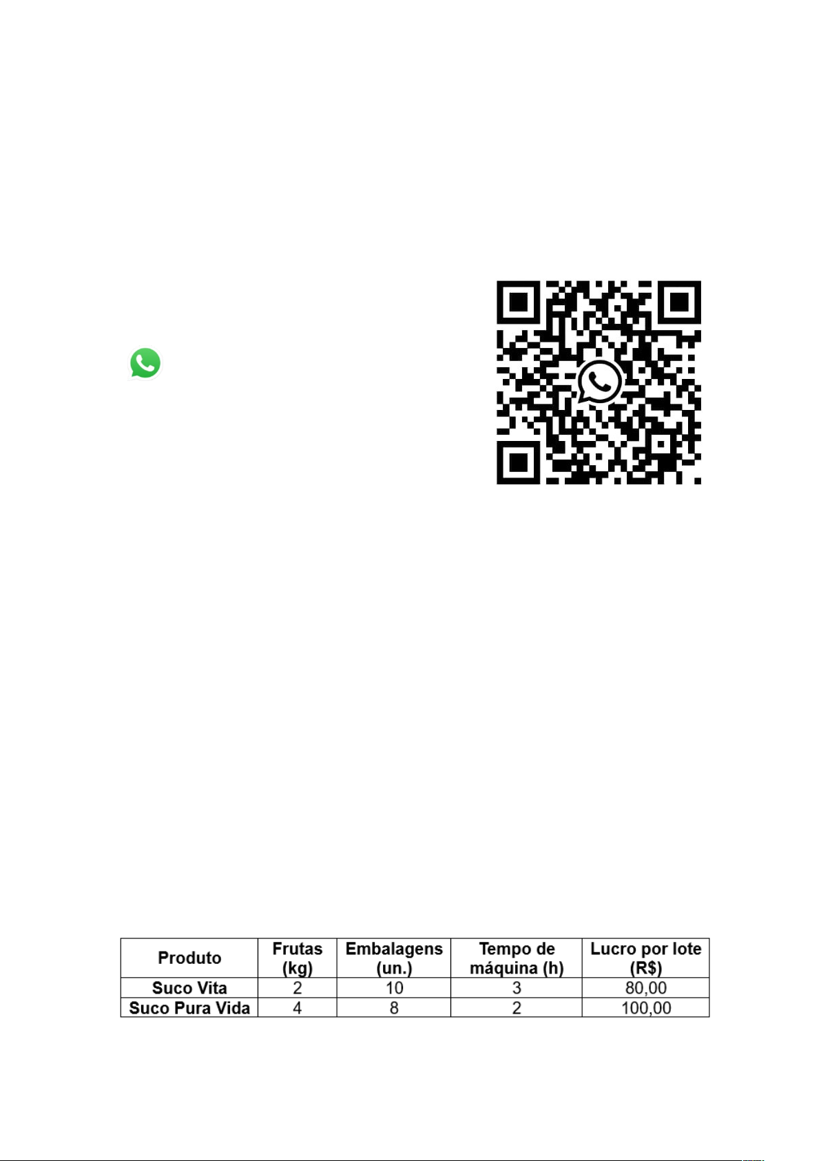 MAPA - EPROD - PESQUISA OPERACIONAL - 54_2025 Entre em contato com a nossa equipe que vamos assessorar com esse trabalho Mais de 10 anos no mercado acadêmico CONTATO (15) 98170-8778 Tele gram.:( 15) 98170-8778 E-MAIL: Mvf5system@gmail.com MAPA – Material de Avaliação Prática da Aprendizagem A Pesquisa Operacional é um campo essencial da Engenharia de Produção, voltado ao apoio à tomada de decisão em cenários que envolvem múltiplas variáveis e restrições (Arenales et al., 2023). Entre as diversas técnicas dessa área, a Programação Linear destaca-se por permitir a otimização de resultados — como maximizar lucros ou minimizar custos — considerando recursos limitados (Hillier; Lieberman, 2021). Quando os problemas se apresentam com várias variáveis e restrições, o Método Simplex, descrito de forma detalhada por Taha (2017), aliado a ferramentas computacionais como o Solver do Microsoft Excel (Microsoft Corporation, 2025), constitui uma abordagem eficiente para encontrar a solução ótima. Neste estudo, analisaremos o caso da Sabor&Saúde Alimentos, empresa que fabrica dois tipos de sucos naturais: Suco Vita e Suco PuraVida. A produção de cada lote requer recursos limitados mensalmente — frutas, embalagens e tempo de máquina — com algumas características, conforme quadro abaixo: A disponibilidade mensal de recursos é: - Frutas: 1.200 kg. - Embalagens: 5.000 unidades. - Tempo de máquina: 800 horas. O desafio é determinar a quantidade ideal de lotes de cada tipo de suco a serem produzidos, maximizando o lucro total mensal, sem ultrapassar a capacidade disponível de recursos. Tarefas: a) Formular o modelo de Programação Linear que represente o problema. b) Resolva o modelo utilizando o Método Simplex no Excel. Insira imagens da sua resolução e deixe as fórmulas utilizadas em evidência. c) Justifique, de forma clara e objetiva, a solução obtida. Importante incluir: quantidade de lotes de cada produto a ser produzida; lucro máximo alcançado; consumo efetivo de cada recurso (frutas, embalagens e tempo de máquina). Entre em contato com a nossa equipe que vamos assessorar com esse trabalho Mais de 10 anos no mercado acadêmico CONTATO (15) 98170-8778 Tele gram.:( 15) 98170-8778 E-MAIL: Mvf5system@gmail.com image1.jpeg image2.png image3.png
