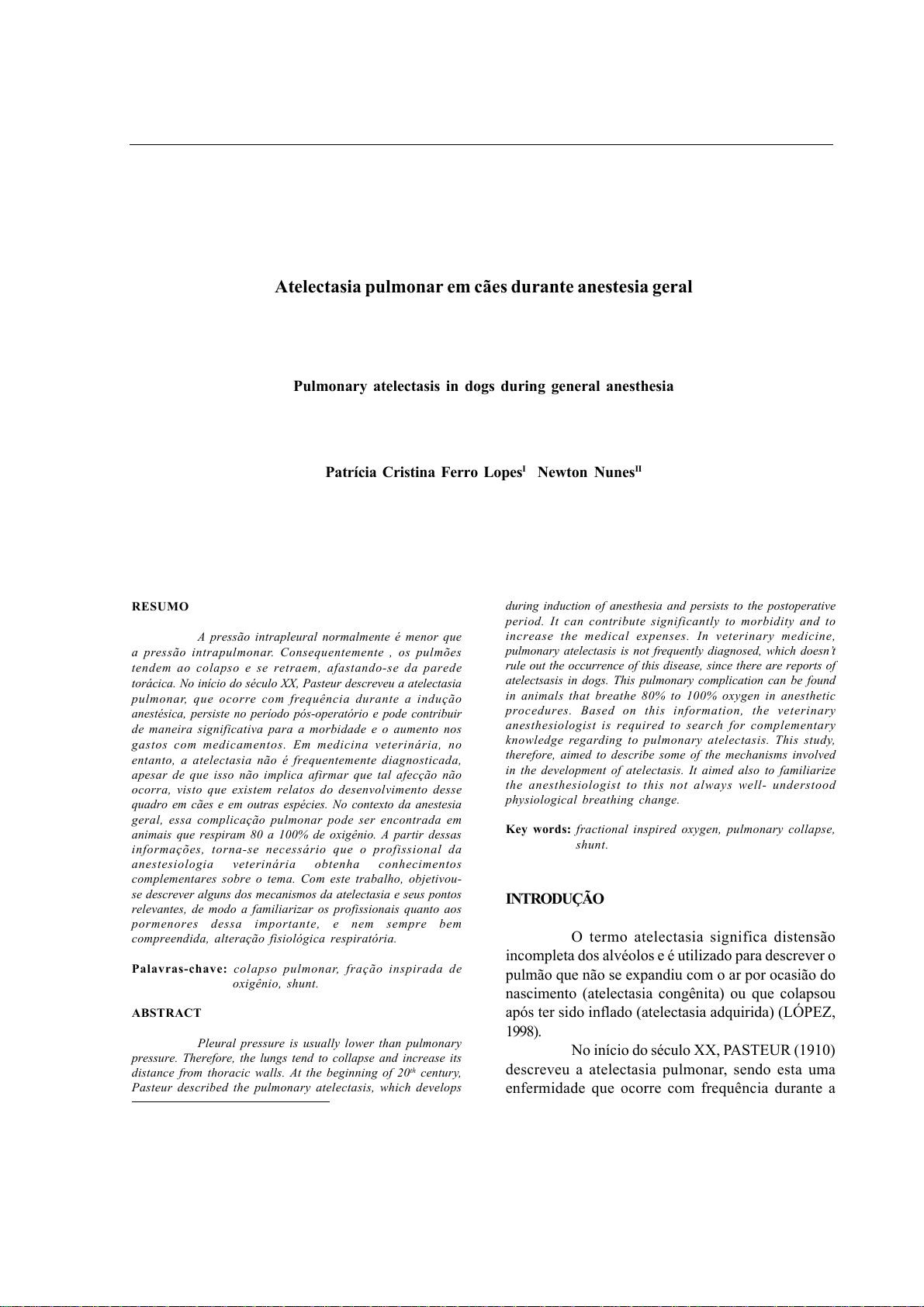 1Atelectasia pulmonar em cães durante anestesia geral.Ciência Rural, Santa Maria, Online ISSN 0103-8478 Patrícia Cristina Ferro LopesI Newton NunesII Atelectasia pulmonar em cães durante anestesia geral Pulmonary atelectasis in dogs during general anesthesia RESUMO A pressão intrapleural normalmente é menor que a pressão intrapulmonar. Consequentemente , os pulmões tendem ao colapso e se retraem, afastando-se da parede torácica. No início do século XX, Pasteur descreveu a atelectasia pulmonar, que ocorre com frequência durante a indução anestésica, persiste no período pós-operatório e pode contribuir de maneira significativa para a morbidade e o aumento nos gastos com medicamentos. Em medicina veterinária, no entanto, a atelectasia não é frequentemente diagnosticada, apesar de que isso não implica afirmar que tal afecção não ocorra, visto que existem relatos do desenvolvimento desse quadro em cães e em outras espécies. No contexto da anestesia geral, essa complicação pulmonar pode ser encontrada em animais que respiram 80 a 100% de oxigênio. A partir dessas informações, torna-se necessário que o profissional da anestesiologia veterinária obtenha conhecimentos complementares sobre o tema. Com este trabalho, objetivou- se descrever alguns dos mecanismos da atelectasia e seus pontos relevantes, de modo a familiarizar os profissionais quanto aos pormenores dessa importante, e nem sempre bem compreendida, alteração fisiológica respiratória. Palavras-chave: colapso pulmonar, fração inspirada de oxigênio, shunt. ABSTRACT Pleural pressure is usually lower than pulmonary pressure. Therefore, the lungs tend to collapse and increase its distance from thoracic walls. At the beginning of 20th century, Pasteur described the pulmonary atelectasis, which develops during induction of anesthesia and persists to the postoperative period. It can contribute significantly to morbidity and to increase the medical expenses. In veterinary medicine, pulmonary atelectasis is not frequently diagnosed, which doesn’t rule out the occurrence of this disease, since there are reports of atelectsasis in dogs. This pulmonary complication can be found in animals that breathe 80% to 100% oxygen in anesthetic procedures. Based on this information, the veterinary anesthesiologist is required to search for complementary knowledge regarding to pulmonary atelectasis. This study, therefore, aimed to describe some of the mechanisms involved in the development of atelectasis. It aimed also to familiarize the anesthesiologist to this not always well- understood physiological breathing change. Key words: fractional inspired oxygen, pulmonary collapse, shunt. INTRODUÇÃO O termo atelectasia significa distensão incompleta dos alvéolos e é utilizado para descrever o pulmão que não se expandiu com o ar por ocasião do nascimento (atelectasia congênita) ou que colapsou após ter sido inflado (atelectasia adquirida) (LÓPEZ, 1998). No início do século XX, PASTEUR (1910) descreveu a atelectasia pulmonar, sendo esta uma enfermidade que ocorre com frequência durante a IPrograma de Pós-graduação em Cirurgia Veterinária, Faculdade de Ciências Agrárias e Veterinárias (FCAV), Universidade Estadual Paulista (UNESP), Jaboticabal, SP, Brasil. IIDepartamento de Clínica e Cirurgia Veterinária, FCAV, UNESP. Via de Acesso Prof. Paulo Donato Castellane, s/n, Zona Rural, 14884-900, Jaboticabal, SP, Brasil. E-mail: newton@fcav.unesp.br. Autor para correspondência. Recebido para publicação 03.07.08 Aprovado em 09.09.09 Mobile User 2 Lopes & Nunes indução anestésica (LORING & BUTLER, 1987), persiste no período pós-operatório (LAWRENCE et al., 1995) e pode contribuir de maneira significativa para a morbidade (ROTHEN et al., 1993) e o aumento do período de recuperação, com consequente elevação nos custos do tratamento do paciente (LAM et al., 1998). Em seu trabalho clássico, BENDIXEN et al. (1963) propuseram que a atelectasia seria uma das causas de prejuízo da oxigenação durante a anestesia. Esses autores observaram sucessiva diminuição da complacência do sistema respiratório e coincidente redução da oxigenação arterial em humanos e animais anestesiados, fato interpretado como formação de atelectasia, a qual pode ser encontrada em diferentes níveis de acordo com a área pulmonar, existindo correlação entre a presença de shunt e a área de colapso pulmonar (BRISMAR et al., 1985; GUNNARSSON et al., 1991). Por volta de 1980, com a utilização da tomografia computadorizada, áreas de atelectasia foram diagnosticadas em pacientes humanos anestesiados (BRISMAR et al., 1985), sendo observado o rápido desenvolvimento de densidades diferentes nos pulmões durante o procedimento anestésico. Estudos morfológicos de densidades pulmonares iguais, observadas em várias ovelhas, puderam confirmar o diagnóstico de atelectasia (HEDENSTIERNA et al., 1989). AKÇA et al. (1999), estudando seres humanos anestesiados recebendo 30 ou 80% de oxigênio (O2), utilizaram a radiografia torácica como um dos meios de diagnóstico de atelectasia, enquanto ALDRICH et al. (2002), por meio da broncoscopia, detectaram severo colapso das vias aéreas durante procedimento anestésico em um cão. Áreas de atelectasias ainda podem ser diagnosticadas por ressonância magnética, ultrasonografia, perfil de citocinas e microscopia intravital. Suspeitas características do desenvolvimento de colapso pulmonar, quando ocorrem alterações na fisiologia pulmonar como diminuição da complacência ou prejuízo na oxigenação, são descritas por DUGGAN & KAVANAGH (2005). Durante a anestesia geral, em animais respirando frações inspiradas de oxigênio (FiO2) de 1,0 ou 0,8, pode-se observar a ocorrência de atelectasia (HEDENSTIERNA et al., 1989; JEFFERIES, 1994), que também foi sugerida em cães submetidos à infusão contínua de propofol e mantidos em ventilação espontânea com as mesmas FiO2 supraci