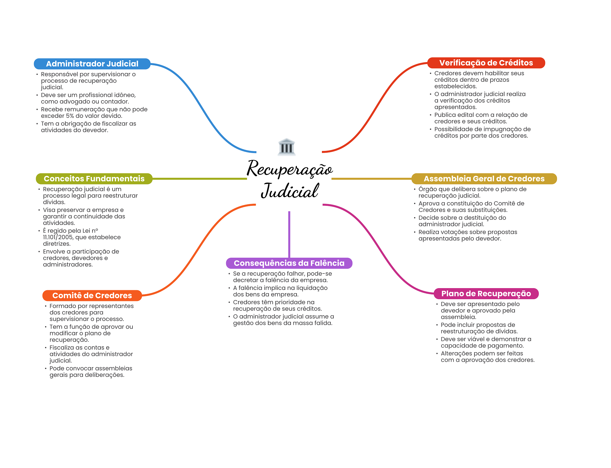 Administrador Judicial Verificação de Créditos Responsável por supervisionar Credores devem habilitar seus processo de recuperação créditos dentro de prazos judicial. estabelecidos. Deve ser um profissional idôneo, administrador judicial realiza como advogado ou contador. a verificação dos créditos Recebe remuneração que não pode apresentados. exceder 5% do valor devido. Publica edital com a relação de Tem a obrigação de fiscalizar as credores e seus créditos. atividades do devedor. Possibilidade de impugnação de créditos por parte dos credores. Recuperação Conceitos Fundamentais Assembleia Geral de Credores Recuperação judicial é um Judicial Órgão que delibera sobre O plano de processo legal para reestruturar recuperação judicial. dívidas. Aprova a constituição do Comitê de Visa preservar a empresa e Credores e suas substituições. garantir a continuidade das Decide sobre a destituição do atividades. administrador judicial. É regido pela Lei n° Realiza votações sobre propostas 11.101/2005, que estabelece apresentadas pelo devedor. diretrizes. Envolve a participação de credores, devedores e administradores. Consequências da Falência Se a recuperação falhar, pode-se decretar a falência da empresa. A falência implica na liquidação Comitê de Credores dos bens da empresa. Plano de Recuperação Credores têm prioridade na Formado por representantes Deve ser apresentado pelo recuperação de seus créditos. dos credores para devedor e aprovado pela supervisionar processo. administrador judicial assume a assembleia. Tem a função de aprovar ou gestão dos bens da massa falida. Pode incluir propostas de modificar plano de reestruturação de dívidas. recuperação. Deve ser viável e demonstrar a Fiscaliza as contas e capacidade de pagamento. atividades do administrador Alterações podem ser feitas judicial. com a aprovação dos credores. Pode convocar assembleias gerais para deliberações.