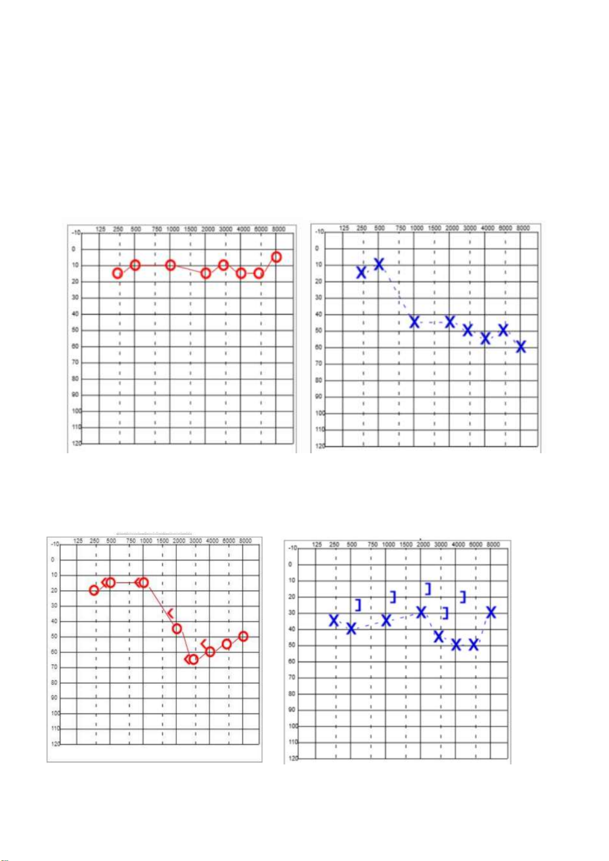 ATIVIDADE – AUDIÇÃO CRUZADA; ATENUAÇÃO INTERAURAL E NÍVEL DE SENSAÇÃO 1. Analise os audiogramas abaixo e verifique cada frequência para saber se está ocorrendo audição cruzada. a. Verifique cada frequência para saber se está ocorrendo audição cruzada. Descreve os resultados. b. Nas frequência que identificar audição cruzada, descreva o quanto essa orelha está ouvido do som apresentado na orelha testada (nível de sensação). 2. Analise cada audiograma e descreva o tipo de perda, o grau da perda auditiva e qual ou quais estruturas anatômicas estão alteradas? Paciente 1 Paciente 2