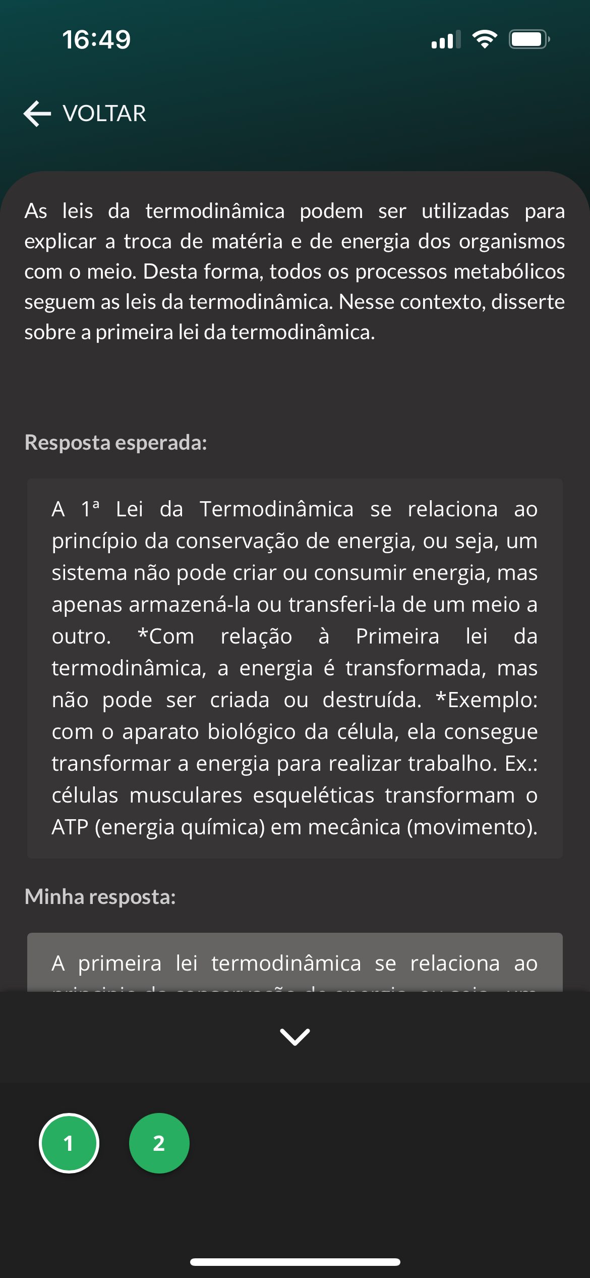 16:49 VOLTAR As leis da termodinâmica podem ser utilizadas para explicar a troca de matéria e de energia dos organismos com meio. Desta forma, todos os processos metabólicos seguem as leis da termodinâmica. Nesse contexto, disserte sobre a primeira lei da termodinâmica. Resposta esperada: A Lei da Termodinâmica se relaciona ao princípio da conservação de energia, ou seja, um sistema não pode criar ou consumir energia, mas apenas armazená-la ou transferi-la de um meio a outro. *Com relação à Primeira lei da termodinâmica, a energia é transformada, mas não pode ser criada ou destruída. *Exemplo: com aparato biológico da célula, ela consegue transformar a energia para realizar trabalho. Ex.: células musculares esqueléticas transformam ATP (energia química) em mecânica (movimento). Minha resposta: A primeira lei termodinâmica se relaciona ao 1 2