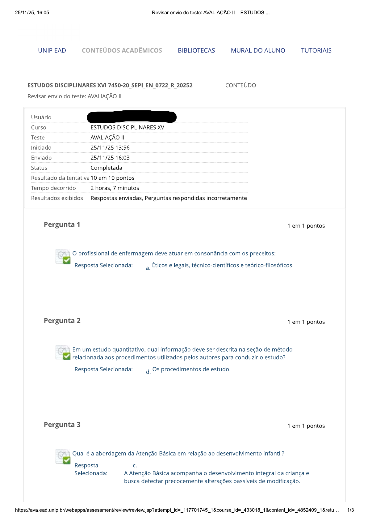25/11/25, 16:05 Revisar envio do teste: AVALIAÇÃO ESTUDOS UNIP EAD CONTEÚDOS ACADÊMICOS BIBLIOTECAS MURAL DO ALUNO TUTORIAIS ESTUDOS DISCIPLINARES XVI 7450-20_SEPI_EN_0722_R_20252 CONTEÚDO Revisar envio do teste: AVALIAÇÃO Usuário Curso ESTUDOS DISCIPLINARES XVI Teste AVALIAÇÃO Iniciado 25/11/25 13:56 Enviado 25/11/25 16:03 Status Completada Resultado da tentativa 10 em 10 pontos Tempo decorrido 2 horas, 7 minutos Resultados exibidos Respostas enviadas, Perguntas respondidas incorretamente Pergunta 1 1 em 1 pontos profissional de enfermagem deve atuar em consonância com os preceitos: Resposta Selecionada: Éticos e legais, técnico-científicos e teórico-filosóficos. a. Pergunta 2 1 em 1 pontos Em um estudo quantitativo, qual informação deve ser descrita na seção de método relacionada aos procedimentos utilizados pelos autores para conduzir estudo? Resposta Selecionada: d. Os procedimentos de estudo. Pergunta 3 1 em 1 pontos Qual é a abordagem da Atenção Básica em relação ao desenvolvimento infantil? Resposta C. Selecionada: A Atenção Básica acompanha desenvolvimento integral da criança e busca detectar precocemente alterações passíveis de modificação. 1/325/11/25, 16:05 Revisar envio do teste: AVALIAÇÃO ESTUDOS Pergunta 4 1 em 1 pontos Qual é termo utilizado para descrever a abordagem de cuidado em saúde que integra a melhor evidência científica, as preferências do paciente e a expertise do profissional de saúde? Resposta Selecionada: b. Cuidado baseado em evidência. Pergunta 5 1 em 1 pontos Entre os dois meses de idade de uma criança, quais habilidades motoras ela não deve apresentar? Resposta Selecionada: C. Capacidade de se arrastar. Pergunta 6 1 em 1 pontos Qual das seguintes afirmativas é uma orientação correta para o uso da camisinha masculina? Resposta d. Selecionada: A camisinha oferece proteção contra todas as doenças sexualmente transmissíveis. Pergunta 7 1 em 1 pontos De acordo com a Norma Regulamentadora NR 17, qual é a finalidade das condições de trabalho estabelecidas? Resposta a. Selecionada: Proporcionar máximo de conforto e segurança aos trabalhadores. 2/325/11/25, 16:05 Revisar envio do teste: AVALIAÇÃO ESTUDOS Pergunta 8 1 em 1 pontos De acordo com guia do Ministério da Saúde, qual sistema de distribuição de medicamentos é considerado mais eficaz na redução de erros de medicação? Resposta Selecionada: d. Sistema de distribuição de medicamentos por dose unitária. Pergunta 9 1 em 1 pontos Observe as afirmações a seguir e responda ao que se pede: I. Produzir informações inverídicas ou de conteúdo duvidoso. II. Utilizar imagens que identifiquem pessoas ou instituições sem prévia autorização. III. Fazer referência a casos, situações ou fatos. Assinale a alternativa que apresenta apenas que é proibido ao profissional da enfermagem em relação à produção de informações e imagens relacionadas à sua área profissional, de acordo com Resposta Selecionada: I, e III. e. Pergunta 10 1 em 1 pontos Qual faixa etária apresenta uma maior ocorrência de suicídio? Resposta Selecionada: Entre 25 e 44 anos. OK Terça-feira, 25 de Novembro de 2025 16h03min53s GMT-03:00 3/3