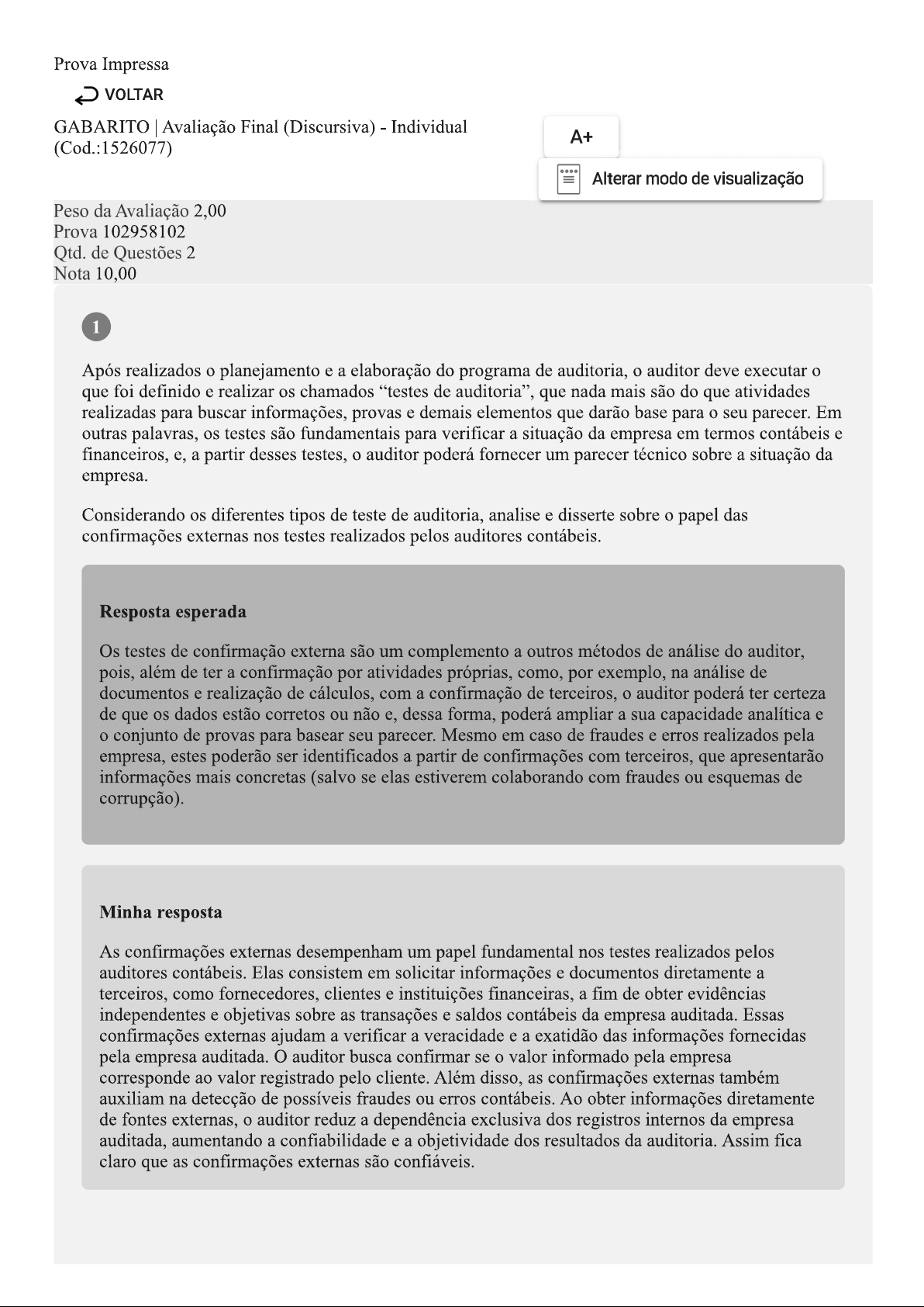 Prova Impressa VOLTAR GABARITO Avaliação Final (Discursiva) Individual A+ :1526077) Alterar modo de visualização Peso da Avaliação 2,00 Prova 102958102 Qtd. de Questões 2 Nota 10,00 1 Após realizados o planejamento e a elaboração do programa de auditoria, o auditor deve executar o que foi definido e realizar os chamados "testes de que nada mais são do que atividades realizadas para buscar informações, provas e demais elementos que darão base para o seu parecer. Em outras palavras, os testes são fundamentais para verificar a situação da empresa em termos contábeis e financeiros, e, a partir desses testes, o auditor poderá fornecer um parecer técnico sobre a situação da empresa. Considerando os diferentes tipos de teste de auditoria, analise e disserte sobre o papel das confirmações externas nos testes realizados pelos auditores contábeis. Resposta esperada Os testes de confirmação externa são um complemento a outros métodos de análise do auditor, pois, além de ter a confirmação por atividades próprias, como, por exemplo, na análise de documentos e realização de cálculos, com a confirmação de terceiros, o auditor poderá ter certeza de que os dados estão corretos ou não e, dessa forma, poderá ampliar a sua capacidade analítica e o conjunto de provas para basear seu parecer. Mesmo em caso de fraudes e erros realizados pela empresa, estes poderão ser identificados a partir de confirmações com terceiros, que apresentarão informações mais concretas (salvo se elas estiverem colaborando com fraudes ou esquemas de corrupção). Minha resposta As confirmações externas desempenham um papel fundamental nos testes realizados pelos auditores contábeis. Elas consistem em solicitar informações e documentos diretamente a terceiros, como fornecedores, clientes e instituições financeiras, a fim de obter evidências independentes e objetivas sobre as transações e saldos contábeis da empresa auditada. Essas confirmações externas ajudam a verificar a veracidade e a exatidão das informações fornecidas pela empresa auditada. O auditor busca confirmar se o valor informado pela empresa corresponde ao valor registrado pelo cliente. Além disso, as confirmações externas também auxiliam na detecção de possíveis fraudes ou erros contábeis. Ao obter informações diretamente de fontes externas, o auditor reduz a dependência exclusiva dos registros internos da empresa auditada, aumentando a confiabilidade e a objetividade dos resultados da auditoria. Assim fica claro que as confirmações externas são confiáveis.Retorno da correção Parabéns, acadêmico, sua resposta atingiu os objetivos da questão e você contemplou o esperado, demonstrando a competência da análise e síntese do assunto abordado, apresentando excelentes argumentos próprios, com base nos materiais disponibilizados. 2 A Auditoria Contábil é uma área muito importante da Contabilidade. A partir das práticas da Auditoria Contábil, as empresas podem ter ganhos significativos na condução das rotinas envolvendo o controle patrimonial e financeiro. Em relação às finalidades, podemos, ainda, dividir a Auditoria em Interna e Independente (ou Externa). Considerando a divisão apresentada, discorra sobre as principais diferenças entre ambas as áreas da Auditoria, incluindo as finalidades e os benefícios delas a uma empresa. Resposta esperada A Auditoria Interna é a responsável pelos controles internos e pelos processos de elaboração dos demonstrativos contábeis, atendendo primariamente à alta diretoria/administração de uma empresa. Por outro lado, a Auditoria Independente é realizada por alguém externo à empresa. O foco é verificar a correta execução dos demonstrativos contábeis, com o intuito de atender aos acionistas e aos investidores, por exemplo, não diretamente à alta administração. Apesar de diferentes, ambas se complementam e permitem grandes melhorias, internas e externas, a uma empresa. Referência bibliográfica: MODESTO, J.L. Auditoria Contábil. Indaial: Arqué, 2023. MODALIDADES DA AUDITORIA CONTÁBIL. Minha resposta Em relação a Auditoria Interna a mesma pode ser conduzida pelos próprios funcionários da empresa, podendo ser semanal, mensal, trimestral ou como a empresa definir, sendo o seu foco principal as melhorias de processos internos da empresa e seus controles. Já a Auditoria Externa só poderá ser efetuada por um profissional habilitado, sendo contratado pela empresa para efetuar uma análise minuciosa de alguma área especifica da empresa como: financeiro, para que seja apontada qualquer irregularidade, sendo esse profissional totalmente imparcial no seu parecer.Retorno da correção Parabéns, acadêmico, sua resposta atingiu os objetivos da questão e você contemplou o esperado, demonstrando a competência da análise e síntese do assunto abordado, apresentando excelentes argumentos próprios, com base nos materiais disponibilizados. Imprimir