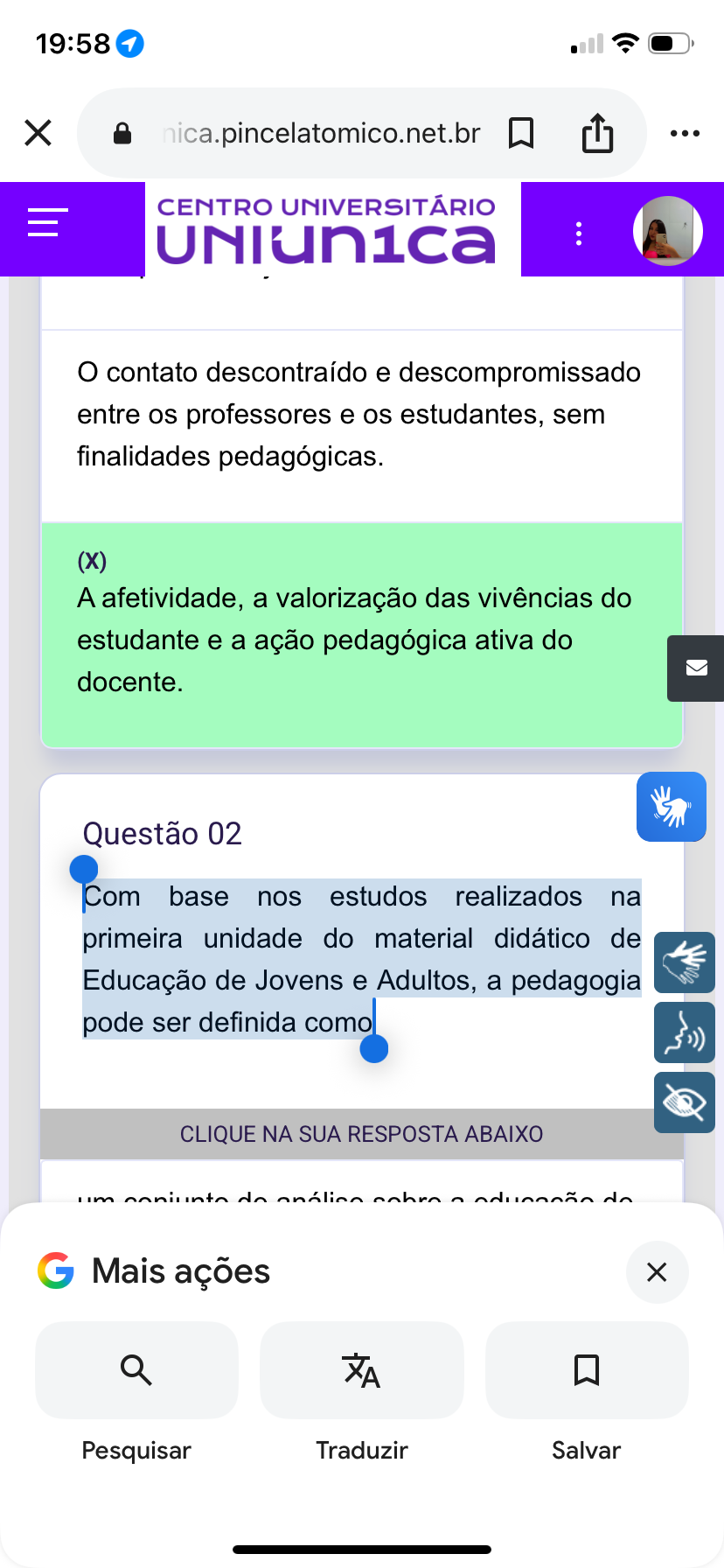 19:58 1 X nica.pincelatomico.net.br CENTRO UNIVERSITÁRIO O contato descontraído e descompromissado entre os professores e os estudantes, sem finalidades pedagógicas. (X) A afetividade, a valorização das vivências do estudante e a ação pedagógica ativa do docente. Questão 02 Com base nos estudos realizados na primeira unidade do material didático de Educação de Jovens e Adultos, a pedagogia pode ser definida como CLIQUE NA SUA RESPOSTA ABAIXO do do G Mais ações X Pesquisar Traduzir Salvar