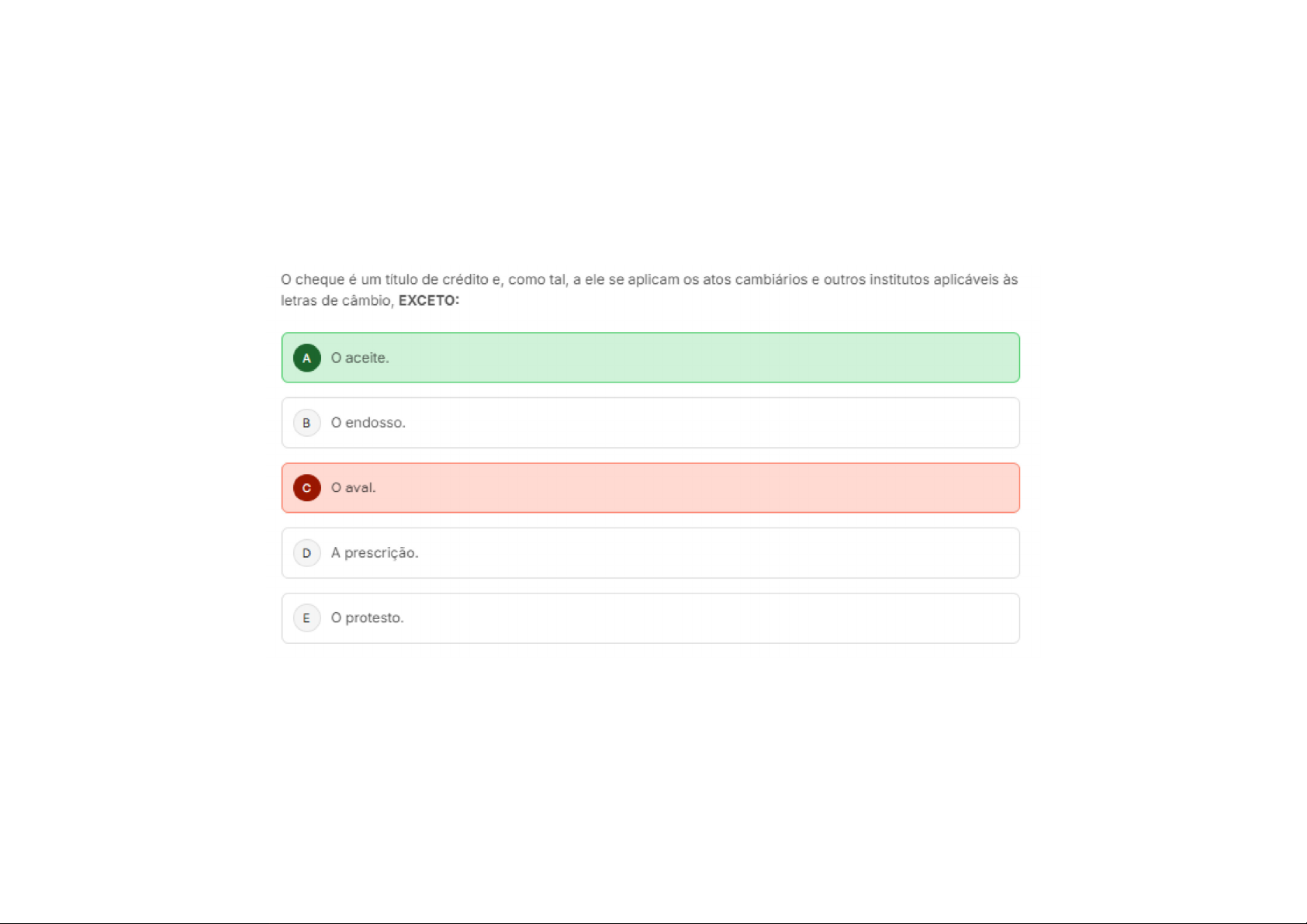 cheque é um título de crédito e, como tal, a ele se aplicam os atos cambiários e outros institutos aplicáveis às letras de câmbio, EXCETO: A aceite. B endosso. aval. D A prescrição. E protesto.