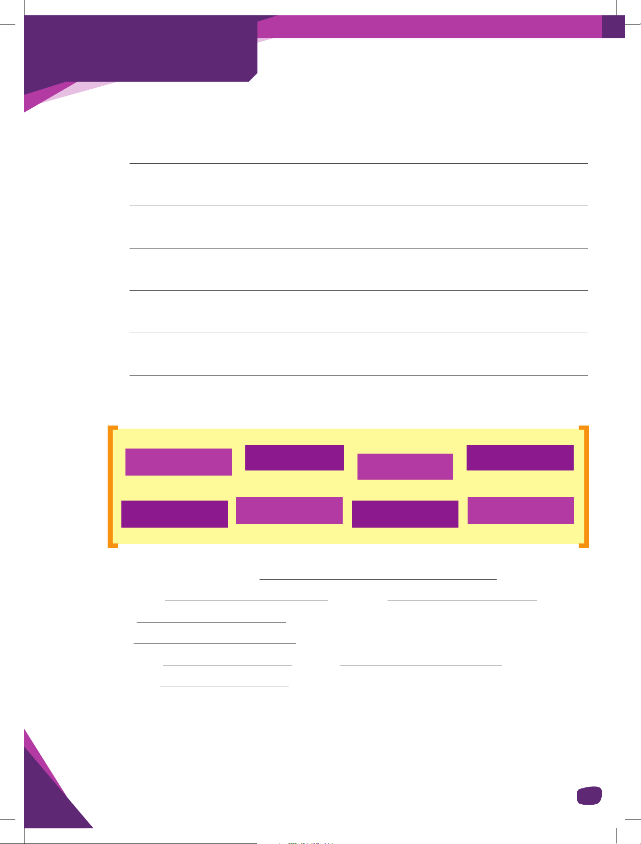 1. Write the sentences in English. a. Eu estudo inglês com meus amigos. b. Eu não falo francês na escola. c. Como se escreve “classmate”? d. Eu falo espanhol com meus irmãos. e. Você estuda português e inglês. f. Você fala com seus amigos na escola. 2. Complete the sentences with the words from the box. thank you good night Excuse me how are you meet borrow What about you What’s a. I speak English and Spanish. ? b. - Hello, ? - I’m fine, . And you? c. - your name? - My name is Allan. d. - May I come in? – Sure, come in. e. Nice to you, too, . f. - Can I your book? – Yes, here you are. 3 Lesson 1 WIZARD_T2_EXTRA_PRACTICE.indb 3 14/12/2015 09:06:27 3. Take a look at the pictures from Useful Language on pages 6 and 7 in your Student’s Book. Write the words that represent these images: a c eb d f 4. Change into negative. a. You speak Spanish. b. I speak with my parents at school. c. I study French with your sister. d. You speak English and Spanish. e. I speak Portuguese with my classmates. f. You speak English with your mother. 5. Link the sentences. - Good morning Jessie, how are you? I speak Portuguese with I study Spanish with my classmates - How do you spell “sibling”? Hello, - Can I borrow your pen? at school. - It’s S-I-B-L-I-N-G. - I’m fine, what about you? - Yes, here you are. my mother and my father. what’s your name? 4 WIZARD_T2_EXTRA_PRACTICE.indb 4 14/12/2015 09:06:29 1. Write the sentences in English. a. Eu como pão com geleia caseira na escola. b. O que você come no café da manhã? c. Eu bebo leite com chocolate com meus amigos. d. Eu não bebo refrigerante. Eu bebo um copo de suco. e. Você bebe uma xícara de chá no café da manhã? f. Você come biscoitos salgados ou doces? 2. Change into interrogative. a. I eat pancakes and cereal for breakfast. b. I study with my siblings. c. I drink soda with my classmates at school. d. You have breakfast with your mother. e. I eat eggs and ham. f. I speak Portuguese and English. 5 Lesson 2 WIZARD_T2_EXTRA_PRACTICE.indb 5 14/12/2015 09:06:29 3. Complete with: of and a for have or with about a. I breakfast my parents. b. I don’t drink cup coffee, I drink tea. c. You eat bread and cheese breakfast. d. Do you eat pancakes cereal? e. I don’t drink soda. What you? f. I eat jelly I drink chocolate milk. 4. Answer according to the model. Do you eat cookies? Yes, I do. I eat cookies. / No, I don’t. I don’t eat cookies. a. Do you eat pancakes and jelly? b. Do you eat cookies at school? c. Do you speak English with your teacher? d. Do you eat cereal and eggs for breakfast? e. Do you have breakfast with your parents? f. Do you drink a cup of coffee? 5. Read and put the dialogue in order. Yes, I do. I eat bread and jam with my friends. Do you have breakfast at school, too? Hi Bonnie, I’m fine, and you? I’m fine, too. Do you have breakfast at school? Hello Peter, what’s up? I eat pancakes and I drink juice. No, I don’t. I have breakfast with my parents. What do you eat and drink? 6 WIZARD_T2_EXTRA_PRACTICE.indb 6 14/12/2015 09:06:29 1. Write the sentences in English. a. Eu quero comer um pouco de doce agora. E você? b. Eu toco guitarra e eu jogo futebol Americano. c. Eu quero sorvete de baunilha, por favor. Que gostoso! d. - Você fala espanhol, certo? - Eu também. e. Eu bebo chá, mas eu não bebo café. f. Você quer jogar voleibol na escola? 2. Unscramble. a. eat – you – want – What – do – to - ? b. play – piano – but – the – not – guitar – I – the c. want – flavor – you – do – What - ? d. in - classroom – the – sports – play – I – don’t e. play – I – chess – you – with – want - to f. English – I – study – don’t – French – but – I – study 7 Lesson 3 WIZARD_T2_EXTRA_PRACTICE.indb 7 14/12/2015 09:06:29 3. Match the questions to the answers. a. Do you speak Portuguese? b. What do you want to drink? c. What do you eat for breakfast? d. Do you play soccer here? e. Do you want to play with the kids? f. Do you want some bubble gum? No, don’t. I want to play alone. I want a glass of water. Thank you. I eat pancakes and jelly. Yes, I want some bubble gum. Yum! No, I don’t speak Portuguese, but I speak English. No, I don’t. I play soccer there. 4. Complete with not or don’t. a. I play the piano, but the electric guitar. b. I drink soda, I drink juice. c. I study English, but I study French. d. I want to play alone. I want to play with my siblings. e. I study guitar, but piano. f. I want to play basketball now. 5. Pick the right word. a. - You play football ! – Thank you. yum very well please b. Do you want ice cream? flavor eat some c. What do you eat and drink breakfast? for some in the d. I play chess classroom with my teacher. at in the in e. I don’t want to study . What about you? alone very well please f. You study English there, ? me too or right 8 WIZARD_T2_EXTRA_PRACTICE.indb 8 14/12/2015 09:06:29 1. Write the sentences in English. a. Eu jogo este jogo na escola com meus colegas de classe. b. Eu não tenho tempo para falar com você agora. c. Está chovendo lá. Você quer um guarda-chuva? d. Eu tenho um bom livro de inglês. E você? e. Estou com sono, mas eu tenho que estudar. f. Eu não tenho aulas de inglês de manhã. Eu quero dormir agora. 2. Write questions for. a. No, I don’t have a new car. b. Yes, I do. I have good teachers. c. No, I don’t want to play that game, I want to sleep in the afternoon. d. Yes, I have an umbrella and a raincoat. e. No, I don’t have time to play games on my computer. f. Yes, I want to have breakfast at school. 9 Lesson 5 WIZARD_T2_EXTRA_PRACTICE.indb 9 14/12/2015 09:06:29 3. Read and put the dialogue in order. Hey Mark, do you have time to play computer games in the afternoon? Do you have a piano in your house? Great idea! Yes, I do. I have a new piano and a guitar, too. Hi Jonathan! Sorry, I don’t. I have piano classes in the afternoon. Nice! I have an old guitar, do you w