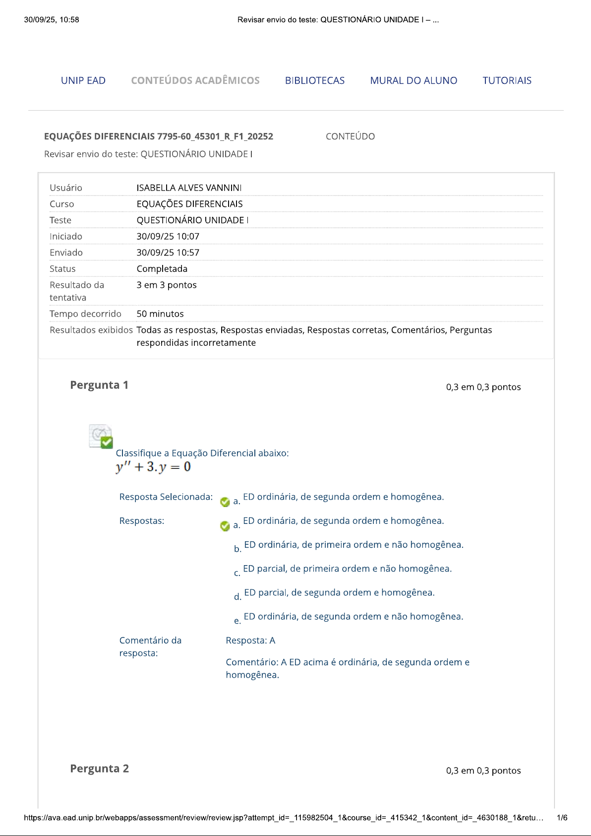 30/09/25, 10:58 Revisar envio do teste: QUESTIONÁRIO UNIDADE UNIP EAD CONTEÚDOS ACADÊMICOS BIBLIOTECAS MURAL DO ALUNO TUTORIAIS EQUAÇÕES DIFERENCIAIS 7795-60_45301_R_F1_20252 CONTEÚDO Revisar envio do teste: QUESTIONÁRIO UNIDADE Usuário ISABELLA ALVES VANNINI Curso EQUAÇÕES DIFERENCIAIS Teste QUESTIONÁRIO UNIDADE I Iniciado 30/09/25 10:07 Enviado 30/09/25 10:57 Status Completada Resultado da 3 em 3 pontos tentativa Tempo decorrido 50 minutos Resultados exibidos Todas as respostas, Respostas enviadas, Respostas corretas, Comentários, Perguntas respondidas incorretamente Pergunta 1 0,3 em 0,3 pontos Classifique a Equação Diferencial abaixo: Resposta Selecionada: a. ED ordinária, de segunda ordem e homogênea. Respostas: ED ordinária, de segunda ordem e homogênea. a. b. ED ordinária, de primeira ordem e não homogênea. ED parcial, de primeira ordem e não homogênea. d. ED parcial, de segunda ordem e homogênea. ED ordinária, de segunda ordem e não homogênea. e. Comentário da Resposta: A resposta: Comentário: A ED acima é ordinária, de segunda ordem e homogênea. Pergunta 2 0,3 em 0,3 pontos 1/630/09/25, 10:58 Revisar envio do teste: QUESTIONÁRIO UNIDADE Classifique a Equação Diferencial abaixo: du dx Resposta Selecionada: b. ED ordinária, de primeira ordem e não homogênea. Respostas: ED ordinária, de segunda ordem e homogênea. a. b. ED ordinária, de primeira ordem e não homogênea. ED parcial, de primeira ordem e não homogênea. d. ED parcial, de segunda ordem e homogênea. e. ED ordinária, de segunda ordem e não homogênea. Comentário da Resposta: B resposta: Comentário: A ED acima é ordinária, de primeira ordem e não homogênea. Pergunta 3 0,3 em 0,3 pontos Classifique a Equação Diferencial abaixo: Resposta Selecionada: d. ED parcial, de segunda ordem e homogênea. Respostas: ED ordinária, de segunda ordem e homogênea. a. b. ED ordinária, de primeira ordem e não homogênea. ED parcial, de primeira ordem e não homogênea. d. ED parcial, de segunda ordem e homogênea. e. ED ordinária, de segunda ordem e não homogênea. Comentário da Resposta: D resposta: Comentário: A ED acima é parcial, de segunda ordem e homogênea. Pergunta 4 0,3 em 0,3 pontos 2/630/09/25, 10:58 Revisar envio do teste: QUESTIONÁRIO UNIDADE Considere as seguintes equações diferenciais. São equações diferenciais exatas, apenas: Resposta Selecionada: Apenas le III. Respostas: Apenas e II. a. b. Apenas II e III. Apenas le III. d. Apenas III. e. I, e III. Comentário da Resposta: resposta: Comentário: Para que a equação diferencial seja exata, devemos ter = Apenas as funções le III obedecem ao critério acima. дх Pergunta 5 0,3 em 0,3 pontos Considere as seguintes equações diferenciais. dx São equações diferenciais de variáveis separáveis, apenas: Resposta Selecionada: d. Apenas I e III. Respostas: a. Apenas I. b. Apenas II. Apenas III. d. Apenas le III. Apenas e III. e. Comentário da Resposta: D resposta: Comentário: É possível separar as variáveis somente nas EDs le III. 3/630/09/25, 10:58 Revisar envio do teste: QUESTIONÁRIO UNIDADE Pergunta 6 0,3 em 0,3 pontos Determine a solução da equação diferencial Resposta Selecionada: Respostas: Comentário da Resposta: A resposta: Comentário: Separando as variáveis da equação diferencial, temos que a solução é a dada na alternativa onde k é uma constante arbitrária. Pergunta 7 0,3 em 0,3 pontos Qual alternativa apresenta uma solução para a Equação diferencial abaixo: dt Resposta Selecionada: Respostas: 4/630/09/25, 10:58 Revisar envio do teste: QUESTIONÁRIO UNIDADE Comentário da Resposta: resposta: Comentário: A solução da ED é dada na alternativa a menos de uma constante arbitrária (no caso, c=2 nos dá uma solução particular para a ED). Pergunta 8 0,3 em 0,3 pontos Qual alternativa apresenta uma solução para a Equação diferencial abaixo? dt Resposta Selecionada: Respostas: Comentário da Resposta: E resposta: Comentário: A solução da ED é dada na alternativa a menos de uma constante arbitrária (no caso, C=5 nos dá uma solução particular para a ED). Pergunta 9 0,3 em 0,3 pontos Qual das alternativas a seguir é solução da equação diferencial (x + y) dx + dy com constante? Resposta Selecionada: Respostas: 5/630/09/25, 10:58 Revisar envio do teste: QUESTIONÁRIO UNIDADE Comentário da Resposta: D resposta: Comentário: Primeiramente, devemos verificar se a equação diferencia é exata. Nesse caso, temos y' como др = a equação diferencial é exata. Resolvendo essa equação дх diferencial, obtemos a alternativa D como resposta, onde é uma constante arbitrária. Pergunta 10 0,3 em 0,3 pontos Qual valor da constante k faz com que a equação y = k. seja solução da equação diferencial = 10? Resposta Selecionada: 5 d. Respostas: b. 10 20 5 d. 9 e. Comentário da Alternativa: D resposta: Comentário: Para que y = k. seja solução da equação diferencial y = necessário que a função e suas derivadas satisfaçam a equação diferencial. Ao realizar a substituição a solução só é satisfeita se k=5. Terça-feira, 30 de Setembro de 2025 10h58min05s GMT-03:00 OK 6/6
