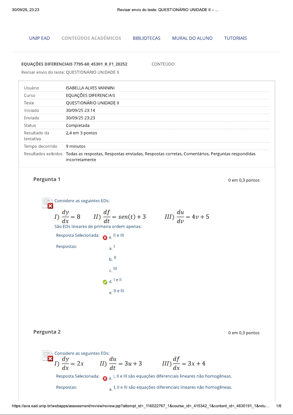 30/09/25, 23:23 Revisar envio do teste: QUESTIONÁRIO UNIDADE UNIP EAD CONTEÚDOS ACADÊMICOS BIBLIOTECAS MURAL DO ALUNO TUTORIAIS EQUAÇÕES DIFERENCIAIS 7795-60_45301_R_F1_20252 CONTEÚDO Revisar envio do teste: QUESTIONÁRIO UNIDADE Usuário ISABELLA ALVES VANNINI Curso EQUAÇÕES DIFERENCIAIS Teste QUESTIONÁRIO UNIDADE Iniciado 30/09/25 23:14 Enviado 30/09/25 23:23 Status Completada Resultado da 2,4 em 3 pontos tentativa Tempo decorrido 9 minutos Resultados exibidos Todas as respostas, Respostas enviadas, Respostas corretas, Comentários, Perguntas respondidas incorretamente Pergunta 1 0 em 0,3 pontos Considere as seguintes EDs: du dx São EDs lineares de primeira ordem apenas: Resposta Selecionada: e III e. Respostas: a. d. e e. e III Pergunta 2 0 em 0,3 pontos Considere as seguintes EDs: dx Resposta Selecionada: I, e III são equações diferenciais lineares não homogêneas. a. Respostas: I, e III são equações diferenciais lineares não homogêneas. a. 1/630/09/25, 23:23 Revisar envio do teste: QUESTIONÁRIO UNIDADE b. Apenas I e são equações diferenciais lineares não homogêneas. C. Apenas e III são equações diferenciais lineares não homogêneas. d. Apenas e III são equações diferenciais lineares não homogêneas. e. Apenas III é equação diferencial linear não homogênea. Pergunta 3 0,3 em 0,3 pontos Considere as seguintes EDs: dy du I) dx 3x dx Resposta Selecionada: e. Apenas lé equação diferencial linear não homogênea. Respostas: a. I, e III são equações diferenciais lineares não homogêneas. b. Apenas le são equações diferenciais lineares não homogêneas. Apenas le III são equações diferenciais lineares não homogêneas. d. Apenas e III são equações diferenciais lineares não homogêneas. e. Apenas I é equação diferencial linear não homogênea. Comentário da Resposta: E resposta: Comentário: Para que a equação diferencial linear seja homogênea, deve ser possível escrevê-la na forma dy com 0. Para que dx equação diferencial linear seja não homogênea, ela deve ter g(x) # Apenas é não homogênea. Pergunta 4 0,3 em 0,3 pontos Considerando a equação ( -t + 5' qual valor da constante "k" se soubermos que no instante inicial (t=0) valor da função é x(t=0)=10? Resposta Selecionada: b. 5 Respostas: b. 5 10 d. 15 20 e. 2/630/09/25, 23:23 Revisar envio do teste: QUESTIONÁRIO UNIDADE Comentário da Resposta: B resposta: Comentário: Aplicando a condição inicial, obtemos que 10=k.1+5, ou seja, alternativa Pergunta 5 0,3 em 0,3 pontos 5t² Considerando a equação и ( = t+k, qual valor da constante "k" se soubermos que no 2 instante inicial (t=0) o valor da função é u(t=0)=0? Resposta Selecionada: 0 a. Respostas: 0 a. b. 5 C. 10 d. 1/5 -1/5 e. Comentário da Resposta: A resposta: 50² Comentário: Aplicando a condição inicial, obtemos que 0+k, 2 ou seja, alternativa Pergunta 6 0,3 em 0,3 pontos Considere um circuito formado por um capacitor de capacitância = inicialmente carregado com tensão = ligado em série com um resistor de resistência R = Qual é a equação da tensão do circuito em função do tempo? Resposta Selecionada: Respostas: Comentário da Resposta: A resposta: Comentário: A equação diferencial que rege circuito é 3/630/09/25, 23:23 Revisar envio do teste: QUESTIONÁRIO UNIDADE dV dt Na expressão, a tensão (volts) e t é tempo (segundo)s. Reescrevendo a equação diferencial do problema para deixá-la na forma de uma equação diferencial linear de primeira ordem, ficamos com: dV V dt RC Substituindo os valores de resistência e capacitância na equação, temos que dV V dt 0,0005 Resolvendo esta equação obtemos a alternativa Pergunta 7 0,3 em 0,3 pontos Considere uma amostra de certo material radioativo. Sabendo que o decaimento radioativo segue a equação diferencial linear dQ kQ determine a constante k para que a quantidade de material dt caia pela metade em 2 anos. Resposta Selecionada: 0,35 ano⁻¹ Respostas: a. 0,69 ano⁻¹ b. -0,69 ano⁻¹ 0,35 ano⁻¹ d. -0,35 ano⁻¹ e. 0,28 ano⁻¹ Comentário da Resposta: resposta: Comentário: decaimento radioativo segue a equação diferencial linear dada por dt Ao se resolver a ED e aplicar a definição de tempo de meia vida, podemos mostrar que: Pergunta 8 0,3 em 0,3 pontos Considere a equação diferencial: dx 4/630/09/25, 23:23 Revisar envio do teste: QUESTIONÁRIO UNIDADE Uma solução possível é dada por: Resposta Selecionada: b. Respostas: b. d. Comentário da Resposta: resposta: Comentário: Através da resolução da ED linear de primeira ordem obtemos a alternativa B, onde "k" é uma constante arbitrária. Pergunta 9 0,3 em 0,3 pontos Considere a equação diferencial: dt Uma solução possível é dada por: Resposta Selecionada: d. Respostas: 5/630/09/25, 23:23 Revisar envio do teste: QUESTIONÁRIO UNIDADE Comentário da Resposta: D resposta: Comentário: Através da resolução da ED linear de primeira ordem obtemos a alternativa D, onde "k" é uma constante arbitrária. Pergunta 10 0,3 em 0,3 pontos Um corpo à temperatura inicial de 50°C é colocado em ambiente à temperatura de 0°C. Determine a equação que dá a temperatura do corpo em função do tempo, admitindo que resfriamento ocorra de acordo com a lei de resfriamento de Newton. Resposta Selecionada: e. Respostas: b. d. Comentário da Resposta: E resposta: Comentário: Segundo a lei de resfriamento de Newton, temos dT(t) dt = sendo T(t) a temperatura de um corpo em função do tempo t, a temperatura do ambiente onde o corpo se encontra e a uma constante de proporcionalidade. No caso desse exemplo, temos = 0 e, como condição inicial, T(t = 0) = 30, com a temperatura em graus Celsius, logo resolvendo a ED obtemos a alternativa E. Terça-feira, 30 de Setembro de 2025 23h23min36s GMT-03:00 OK 6/6