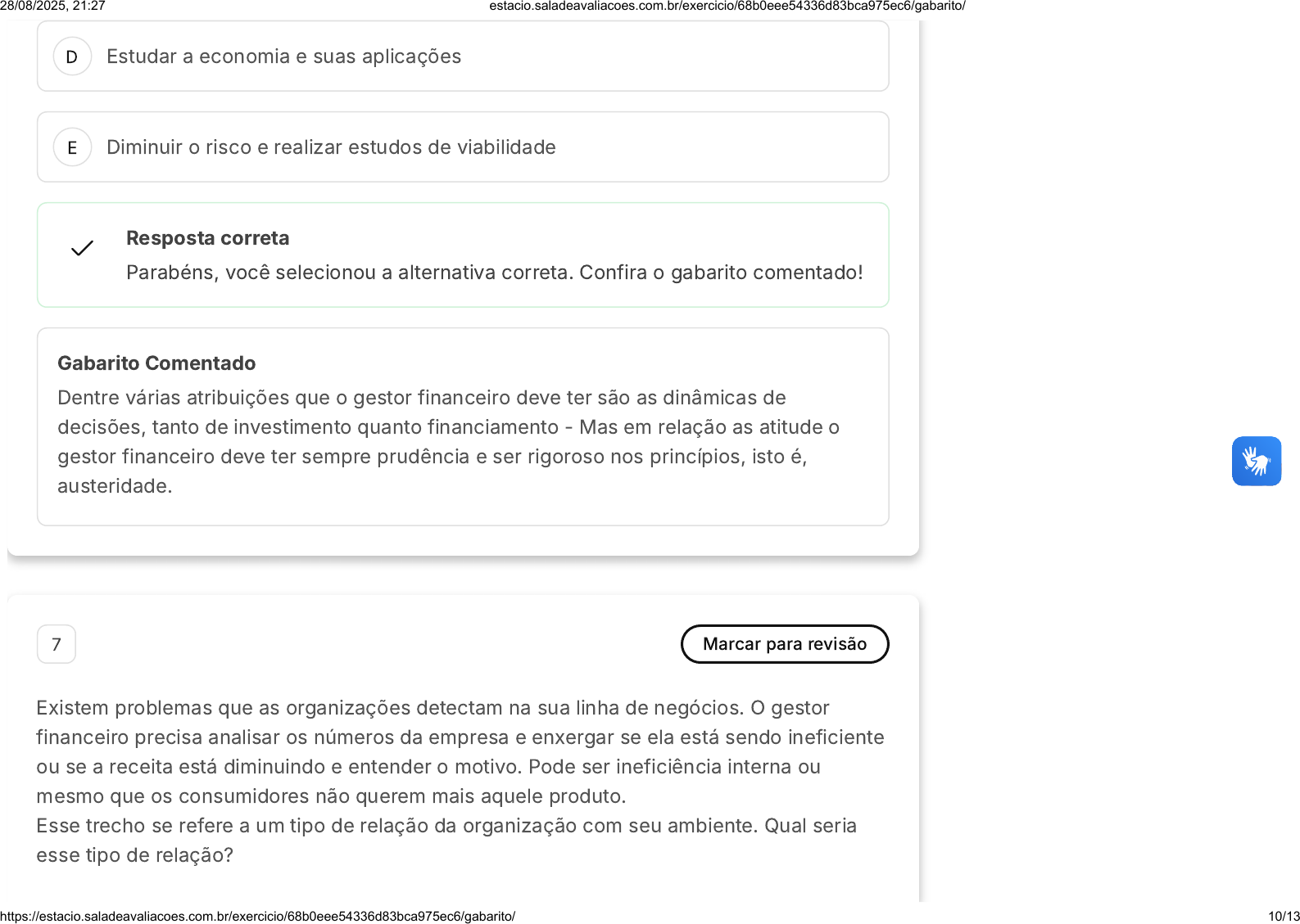 28/08/2025, 21:27 D Estudar a economia e suas aplicações E Diminuir risco e realizar estudos de viabilidade Resposta correta Parabéns, você selecionou a alternativa correta. Confira gabarito comentado! Gabarito Comentado Dentre várias atribuições que o gestor financeiro deve ter são as dinâmicas de decisões, tanto de investimento quanto financiamento Mas em relação as atitude gestor financeiro deve ter sempre prudência e ser rigoroso nos princípios, isto é, austeridade. 7 Marcar para revisão Existem problemas que as organizações detectam na sua linha de negócios. gestor financeiro precisa analisar números da empresa e enxergar se ela está sendo ineficiente ou se a receita está diminuindo e entender motivo. Pode ser ineficiência interna ou mesmo que os consumidores não querem mais aquele produto. Esse trecho se refere a um tipo de relação da organização com seu ambiente. Qual seria esse tipo de relação? 10/13