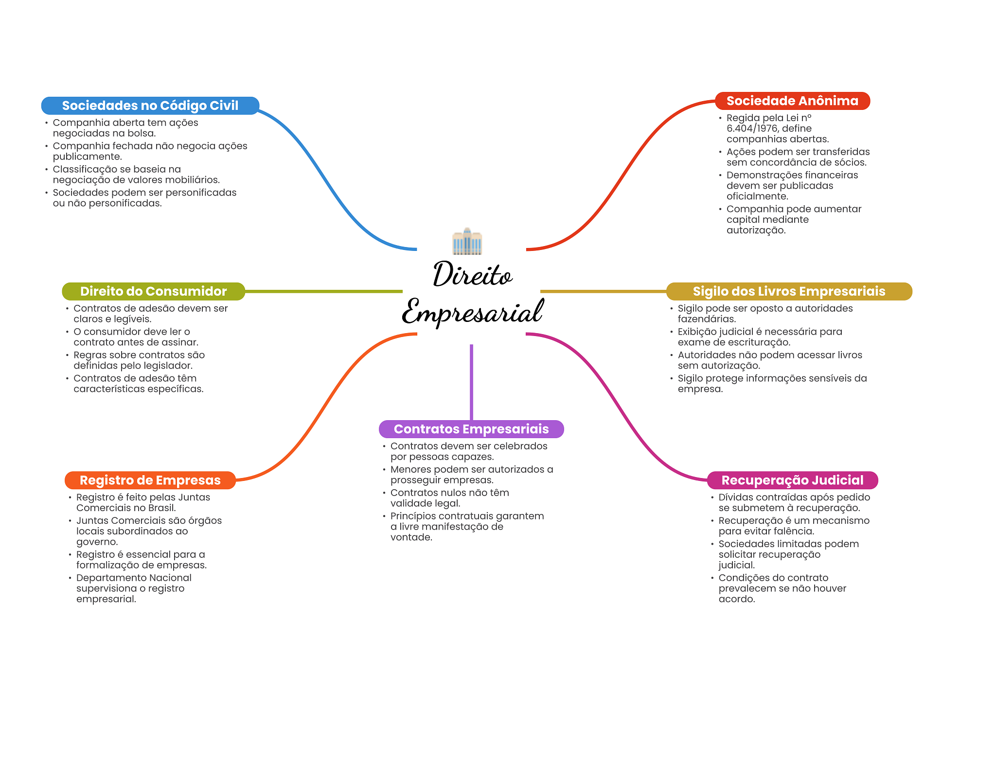 Sociedades no Código Civil Sociedade Anônima Companhia aberta tem ações Regida pela Lei n° negociadas na bolsa. 6.404/1976, define companhias abertas. Companhia fechada não negocia ações publicamente. Ações podem ser transferidas sem concordância de sócios. Classificação se baseia na negociação de valores mobiliários. Demonstrações financeiras devem ser publicadas Sociedades podem ser personificadas oficialmente. ou não personificadas. Companhia pode aumentar capital mediante autorização. Direito Direito do Consumidor Sigilo dos Livros Empresariais Contratos de adesão devem ser Empresarial Sigilo pode ser oposto a autoridades claros e legíveis. fazendárias. consumidor deve ler Exibição judicial é necessária para contrato antes de assinar. exame de escrituração. Regras sobre contratos são Autoridades não podem acessar livros definidas pelo legislador. sem autorização. Contratos de adesão têm Sigilo protege informações sensíveis da características específicas. empresa. Contratos Empresariais Contratos devem ser celebrados por pessoas capazes. Menores podem ser autorizados a Registro de Empresas prosseguir empresas. Recuperação Judicial Registro é feito pelas Juntas Contratos nulos não têm Dívidas contraídas após pedido Comerciais no Brasil. validade legal. se submetem à recuperação. Juntas Comerciais são órgãos Princípios contratuais garantem locais subordinados ao a livre manifestação de Recuperação é um mecanismo para evitar falência. vontade. governo. Sociedades limitadas podem Registro é essencial para a solicitar recuperação formalização de empresas. judicial. Departamento Nacional Condições do contrato supervisiona registro prevalecem se não houver empresarial. acordo.
