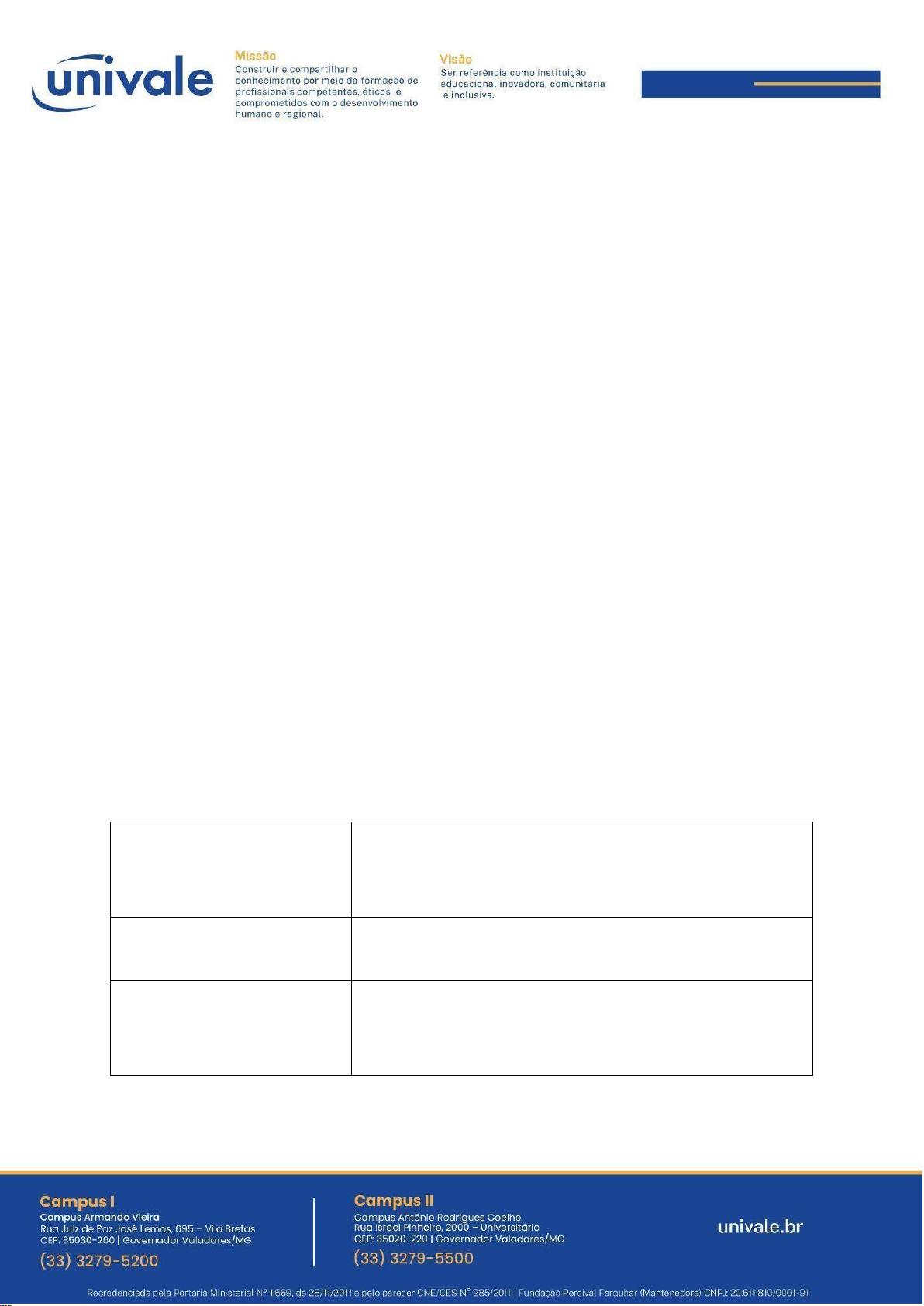 UNIVERSIDADE VALE DO RIO DOCE – UNIVALE Fundação Percival Farquhar – Entidade Mantenedora EDITAL UNIVALE Nº 093/2025 Processo Seletivo para ingresso no Programa de Pós-graduação Stricto sensu em Gestão Integrada do Território, nível de Mestrado Acadêmico Interdisciplinar, da Universidade Vale do Rio Doce – GIT/UNIVALE A Universidade Vale do Rio Doce – UNIVALE, mantida pela Fundação Percival Farquhar, inscrita no CNPJ sob o nº 20.611.810/0001-91, com sede no município de Governador Valadares/MG, faz saber aos interessados que, no período de 21 de outubro de 2025 a 04 de dezembro de 2025, estarão abertas as inscrições para o Processo Seletivo destinado ao preenchimento de vagas do Programa de Pós- graduação Stricto sensu em Gestão Integrada do Território – GIT (nível Mestrado Acadêmico Interdisciplinar), reconhecido pela CAPES, conforme calendário abaixo: CALENDÁRIO DO PROCESSO SELETIVO 2026 – 1º SEMESTRE CALENDÁRIO DE ABERTURA E ENCERRAMENTO DAS INSCRIÇÕES 21/10/2025 (3ª Feira) DA INSCRIÇÃO. Abertura das inscrições, VIA INTERNET. 05/12/2025 (6ª Feira) Webnar Preparatório, 19H (Link será encaminhado para o e-mail dos inscritos) 04/12/2025 (5ª Feira) DO ENCERRAMENTO. Às 23:59h, encerra as inscrições VIA INTERNET. CALENDÁRIO DO PROCESSO SELETIVO, RESULTADO, MATRÍCULA E PERÍODO LETIVO. 06/12/2025 (SÁBADO) DAS PROVAS DE SELEÇÃO E DE LÍNGUA ESTRANGEIRA. A prova de seleção e a prova de língua estrangeira (inglês ou espanhol) serão aplicadas presencialmente às 8h, devendo ser concluídas até às 12h (duração: quatro horas). O candidato deverá comparecer ao local de prova com antecedência de 30 (trinta) minutos. Para a prova de seleção serão solicitados conhecimento da bibliografia disponibilizada no Anexo 03. Local: UNIVALE - Campus II, Bloco A2 - Auditório (próximo da Biblioteca e Templo). 08/12/2025 (SEGUNDA-FEIRA) DAS PROVAS DE SELEÇÃO E DE LÍNGUA ESTRANGEIRA. Os candidatos que por MOTIVO RELIGIOSO não possam fazer as provas de seleção e de língua estrangeira no sábado, poderão realizá-las na segunda-feira, no dia 08 de dezembro, nos mesmos horários e locais. Horário: das 8h às 12h (duração das provas - quatro horas). O candidato deverá comparecer ao local de prova com antecedência de 30 (trinta) minutos. Local: UNIVALE - Campus II, Bloco A2 - Auditório (próximo da Biblioteca e Templo) 11/12/2025 DA DIVULGAÇÃO. O resultado da Prova de Seleção será divulgado por ordem alfabética, a partir das 16h, pelo e-mail cadastrado no ato da inscrição, bem como pelo site da UNIVALE. 12 e 15/12/2025 DA ENTREVISTA. Realização da entrevista por videoconferência (telepresencial), a partir das 9h. O candidato receberá o link da entrevista no e-mail cadastrado. 18/12/2025 DO RESULTADO. A PUBLICAÇÃO DO RESULTADO FINAL do Processo Seletivo para ingresso no Mestrado em Gestão Integrada do Território, por ordem classificatória, e do resultado da Prova de Língua Estrangeira, ocorrerá a partir das 16h no Site da UNIVALE. O resultado também será encaminhado ao candidato no e-mail cadastrado no ato de inscrição. 19/12/2025 a 09/01/2026 DA MATRÍCULA. Período de matrícula no Mestrado em Gestão Integrada do Território, para os aprovados no processo seletivo inicia em 19 de dezembro de 2025 e encerra no dia 9 de janeiro de 2026 às 23:59 horas. 27/02/2026 (sexta-feira) DA MATRÍCULA NAS DISCIPLINAS. REUNIÃO OBRIGATÓRIA às 18h, para efetivação da matrícula nas disciplinas. A reunião será telepresencial (remota), por meio do Google Meet. O link será comunicado pelo e-mail cadastrado no ato de inscrição. 02/03/2026 (2ª. Feira) Início do período letivo. 1. DA VALIDADE E NATUREZA DO PROGRAMA DE MESTRADO ACADÊMICO 1. O Processo Seletivo de que trata este edital ocorrerá de forma presencial e o resultado é válido exclusivamente para matrícula e ingresso no 1º (primeiro) semestre letivo do ano de 2026, no limite das vagas oferecidas ao Programa de Pós-graduação Stricto sensu em Gestão Integrada do Território – GIT (nível Mestrado Acadêmico Interdisciplinar). 1.1. Condição para ingresso no Mestrado. Para ingressar no Mestrado o candidato necessita apresentar o diploma de graduação, em qualquer área do conhecimento acadêmico, no ato da matrícula. 1.2. Prazo de integralização. O curso de Mestrado possui duração regular de 24 (vinte e quatro) meses, podendo ser prorrogado excepcionalmente até o limite máximo de 30 (trinta) meses, mediante assinatura de contrato aditivo. Após esse período, não será permitida nova prorrogação. 1.3. Campo de estudos. O Mestrado Interdisciplinar tem como campo de estudos diversas modalidades de conhecimento, permitindo graduados formados nas mais diversas áreas de conhecimento e com atuação em diferentes áreas profissionais se diplomarem como Mestre (Ver Anexo 01). 1.4. Objetivo do Mestrado. O Curso de Mestrado do GIT/UNIVALE possibilita ao aluno desenvolver seus estudos e pesquisa, a partir do alicerce que é sua área de formação na graduação, com o objetivo de obter uma formação de alta qualidade e, ao mesmo tempo, desenvolver a capacidade e habilidade na pesquisa, para o exercício profissional com competência diferencial. 1.5. Linhas de Pesquisa e Temáticas. A Linha de Pesquisa 01: Território, Ambiente, Cultura e Migração, preferencialmente, se organiza em três (03) eixos: a) Ambiente e Crise Ambiental; b) História, Cultura e Patrimônio Cultural; c) Migrações. A Linha de Pesquisa 02: Território, Direitos, Educação e Saúde, preferencialmente, se organizam nos três (03) eixos: a) Saúde/Doença; b) Educação; c) Vulnerabilidades, Violência e Direitos. (Ver Anexo 01). 1.6. Caráter Interdisciplinar do Mestrado. O caráter interdisciplinar e integrado do Mestrado permite a cada Linha de Pesquisa imbricar pela transversalidade as temáticas e incluir diferentes assuntos correlacionados, em função dos problem