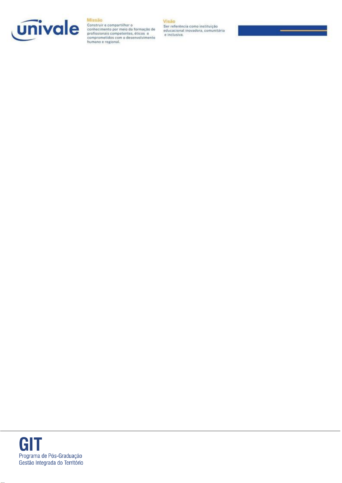 Programa de Pós-graduação stricto sensu em Gestão Integrada do Território Reconhecido: Portaria do MEC Nº 448/2008, de 10/4/2008. Código: 32009011003P0 Universidade Vale do Rio Doce Rua Israel Pinheiro, 2000, Campus II - Antônio Rodrigues Coelho, Bloco PVA, Sala 05 Bairro Universitário, Governador Valadares, MG, CEP 35.020-220 ANEXO 05 Programa de Fomento à Pós-graduação Stricto Sensu (PFPG) Fundamentada no seu compromisso comunitário com a região, a FPF/UNIVALE aprovou o Programa de Fomento à Pós-graduação Stricto Sensu (PFPG/UNIVALE), por meio da Política Afirmativa, da Política de Incentivo e da Política de Parcerias Regionais para formação no nível de Mestrado Acadêmico no Programa de Pós- graduação Interdisciplinar em Gestão Integrada do território (Curso de Mestrado). Tanto as bolsas de mestrado (CAPES e FAPEMIG) com os benefícios na forma de bolsa de estudo ou de percentual de desconto (%), oferecidos pelo PFPG/UNIVALE, serão concedidos aos que forem aprovados no Processo Seletivo do Curso de Mestrado, atenderem à legislação pertinente e/ou comprovem pertencer às categorias listadas nesse anexo. A concessão do benefício de bolsa de mestrado das agências CAPES e FAPEMIG está condicionada a disponibilidade das bolsas, conforme a cota recebida pela instituição. Os critérios para a distribuição das bolsas da FAPEMIG e da CAPES são estabelecidos conforme orientação das agências de fomento, considerando a colocação do processo seletivo, o mérito acadêmico, a disponibilidade de dedicação ao curso e a demanda social, ouvindo as recomendações e indicação da comissão do Processo Seletivo. Para os beneficiários de bolsa de 50% e de descontos, fica condicionado o benefício à quitação da parte remanescente da mensalidade, após aplicado da dedução, até a data do vencimento. Se o aluno não quitar a parte remanescente dentro do prazo, perderá o benefício ao desconto naquele mês, voltando a fazer jus ao benefício nos meses subsequentes. Programa de Pós-graduação stricto sensu em Gestão Integrada do Território Reconhecido: Portaria do MEC Nº 448/2008, de 10/4/2008. Código: 32009011003P0 Universidade Vale do Rio Doce Rua Israel Pinheiro, 2000, Campus II - Antônio Rodrigues Coelho, Bloco PVA, Sala 05 Bairro Universitário, Governador Valadares, MG, CEP 35.020-220 POLÍTICA AFIRMATIVA DA FPF/UNIVALE Categoria dos aprovados com Direito ao Benefício (%) Candidatos pertencentes a populações indígenas 100 Candidatos pertencentes a comunidades quilombolas 100 Candidato com atuação ativa em prol de direitos de grupos historicamente vulneráveis, a saber: pessoa com deficiência, negros, LGBTI+ (Uma vaga) * 100 Candidato pertencente a comunidade tradicional das áreas atingidas pelo desastre da Vale/BHP/Samarco (agricultores familiares e pescadores) (uma vaga). 100 * A bolsa será concedida para o candidato que obtiver a maior pontuação no processo seletivo na categoria, considerando os seguintes critérios de avaliação e desempate: a) atuação ativa comprovada em prol dos direitos de grupo historicamente vulnerável (2 pontos); b) produção acadêmica comprovada sobre a temática de diversidade e direitos humanos (2 pontos); c) atuação profissional em prol dos direitos de grupo historicamente vulnerável (2 pontos); d) realização de trabalhos voluntários em prol dos direitos de grupo historicamente vulnerável (2 pontos). Os comprovantes de tais critérios de avaliação e desempate devem ser anexos impreterivelmente no ato de inscrição ao certame. A bolsa será concedida para o candidato que obtiver a maior pontuação no processo seletivo na categoria. POLÍTICA DE INCENTIDO DA FPF/UNIVALE Categoria dos aprovados com Direito ao Benefício (%) Aprovado(a) em primeiro lugar no processo seletivo* 100 Egressos(as) da UNIVALE dos Cursos de Graduação 25 Egressos(as) da UNIVALE dos Cursos de Especialização 25 Profissional da Área da Saúde de Gov. Valadares e Regiões**, da ativa ou aposentado; 25 Professores da Educação Básica das redes Pública e Privada de Gov. Valadares e Regiões**, da ativa ou aposentado; 25 Programa de Pós-graduação stricto sensu em Gestão Integrada do Território Reconhecido: Portaria do MEC Nº 448/2008, de 10/4/2008. Código: 32009011003P0 Universidade Vale do Rio Doce Rua Israel Pinheiro, 2000, Campus II - Antônio Rodrigues Coelho, Bloco PVA, Sala 05 Bairro Universitário, Governador Valadares, MG, CEP 35.020-220 Servidores da Área de Segurança Pública de Gov. Valadares e Regiões**, da ativa ou apesentado 25 Servidores da Área Ambiental e do Sistema Estadual de Meio Ambiente e Recursos hídricos (SISEMA) 25 * Serão exigidos dedicação e desempenho nas atividades acadêmicas e conclusão no prazo regulamentar de 24 meses. ** Região Intermediária de Governador Valadares (regiões imediatas de Aimorés, Resplendor, Governador Valadares, Guanhães e de Mantena); Região Intermediária de Ipatinga (regiões imediatas de Caratinga, Ipatinga e de João Monlevade); Região Intermediária de Teófilo Otoni (regiões imediatas de Águas Formosas, Almenara, Araçuaí, Capelinha, Diamantina, Teófilo Otoni e de Pedra Azul); Região Imediata de Itabira; Região Imediata de Manhuaçu; e Regiões Intermediárias de Colatina e de São Mateus, no Espírito Santo. POLÍTICA DE APOIO A CAPACITAÇÃO DE PROFESSORES E COLABORADORES DA FPF/UNIVALE Professor(a) da UNIVALE/FPF (5 vagas) * 60 Pessoal Técnico-Administrativo da UNIVALE/FPF (5 vagas) * 60 * A bolsa de 60% será concedida considerando a colocação no processo seletivo, ficando o restante do valor contratual dividido em 30 parcelas, com desconto em folha. Programa de Pós-graduação stricto sensu em Gestão Integrada do Território Reconhecido: Portaria do MEC Nº 448/2008, de 10/4/2008. Código: 32009011003P0 Universidade Vale do Rio Doce Rua Israel Pinheiro, 2000, Campus II - Antônio Rodrigues Coelho, Bloco PVA, Sala 05
