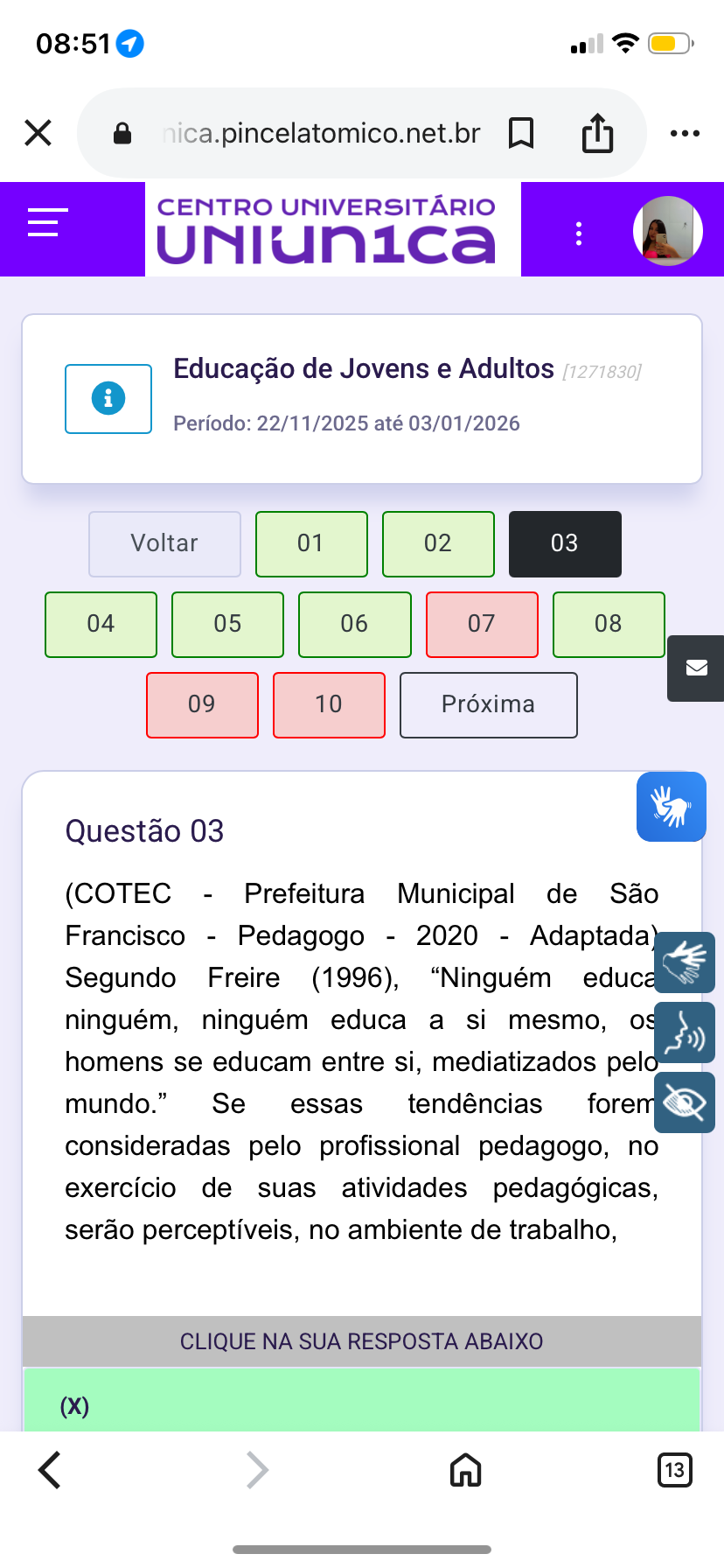 08:51 1 X nica.pincelatomico.net.br CENTRO UNIVERSITÁRIO ... Educação de Jovens e Adultos [1271830] i Período: 22/11/2025 até 03/01/2026 Voltar 01 02 03 04 05 06 07 08 09 10 Próxima Questão 03 (COTEC - Prefeitura Municipal de São Francisco - Pedagogo - 2020 Adaptada) Segundo Freire (1996), "Ninguém educa ninguém, ninguém educa a si mesmo, os homens se educam entre si, mediatizados pelo mundo." Se essas tendências forem consideradas pelo profissional pedagogo, no exercício de suas atividades pedagógicas, serão perceptíveis, no ambiente de trabalho, CLIQUE NA SUA RESPOSTA ABAIXO (X) 13