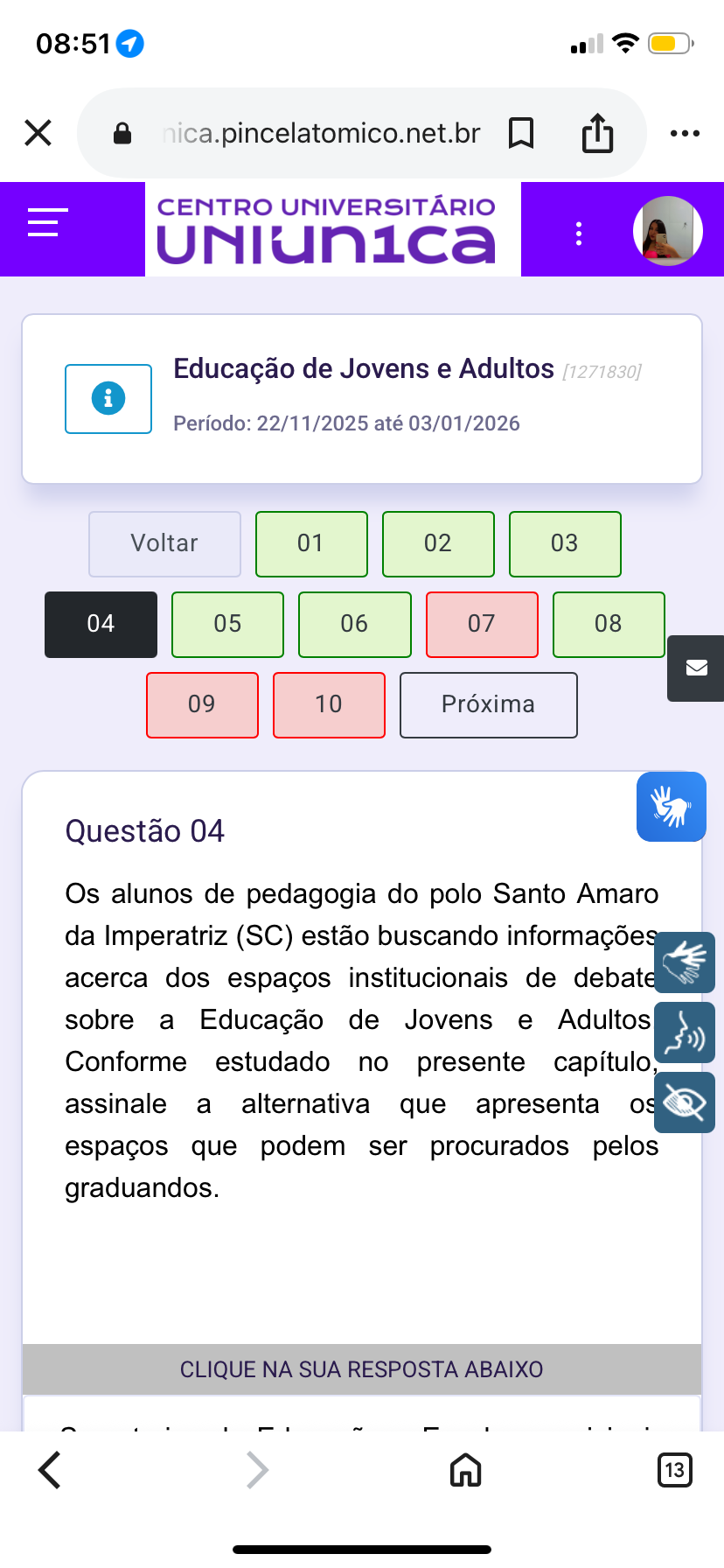08:51 1 X CENTRO UNIVERSITÁRIO Educação de Jovens e Adultos [1271830] i Período: 22/11/2025 até 03/01/2026 Voltar 01 02 03 04 05 06 07 08 09 10 Próxima Questão 04 Os alunos de pedagogia do polo Santo Amaro da Imperatriz (SC) estão buscando informações acerca dos espaços institucionais de debate sobre a Educação de Jovens e Adultos Conforme estudado no presente capítulo, assinale a alternativa que apresenta os espaços que podem ser procurados pelos graduandos. CLIQUE NA SUA RESPOSTA ABAIXO 13