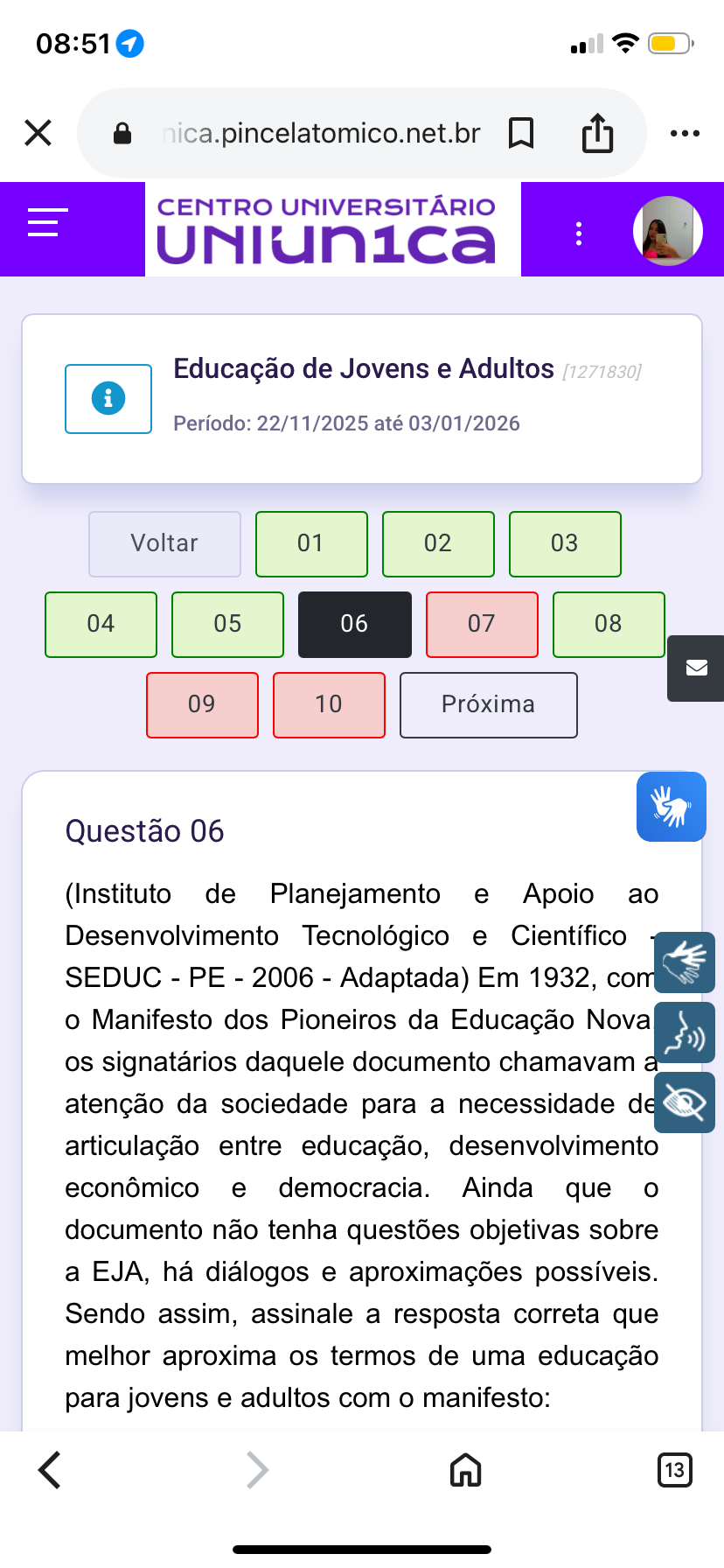 08:51 1 X CENTRO UNIVERSITÁRIO ... Educação de Jovens e Adultos [1271830] i Período: 22/11/2025 até 03/01/2026 Voltar 01 02 03 04 05 06 07 08 09 10 Próxima Questão 06 (Instituto de Planejamento e Apoio ao Desenvolvimento Tecnológico e Científico SEDUC - PE 2006 Adaptada) Em 1932, com o Manifesto dos Pioneiros da Educação Nova os signatários daquele documento chamavam atenção da sociedade para a necessidade de articulação entre educação, desenvolvimento econômico e democracia. Ainda que o documento não tenha questões objetivas sobre a EJA, há diálogos e aproximações possíveis. Sendo assim, assinale a resposta correta que melhor aproxima os termos de uma educação para jovens e adultos com o manifesto: 13