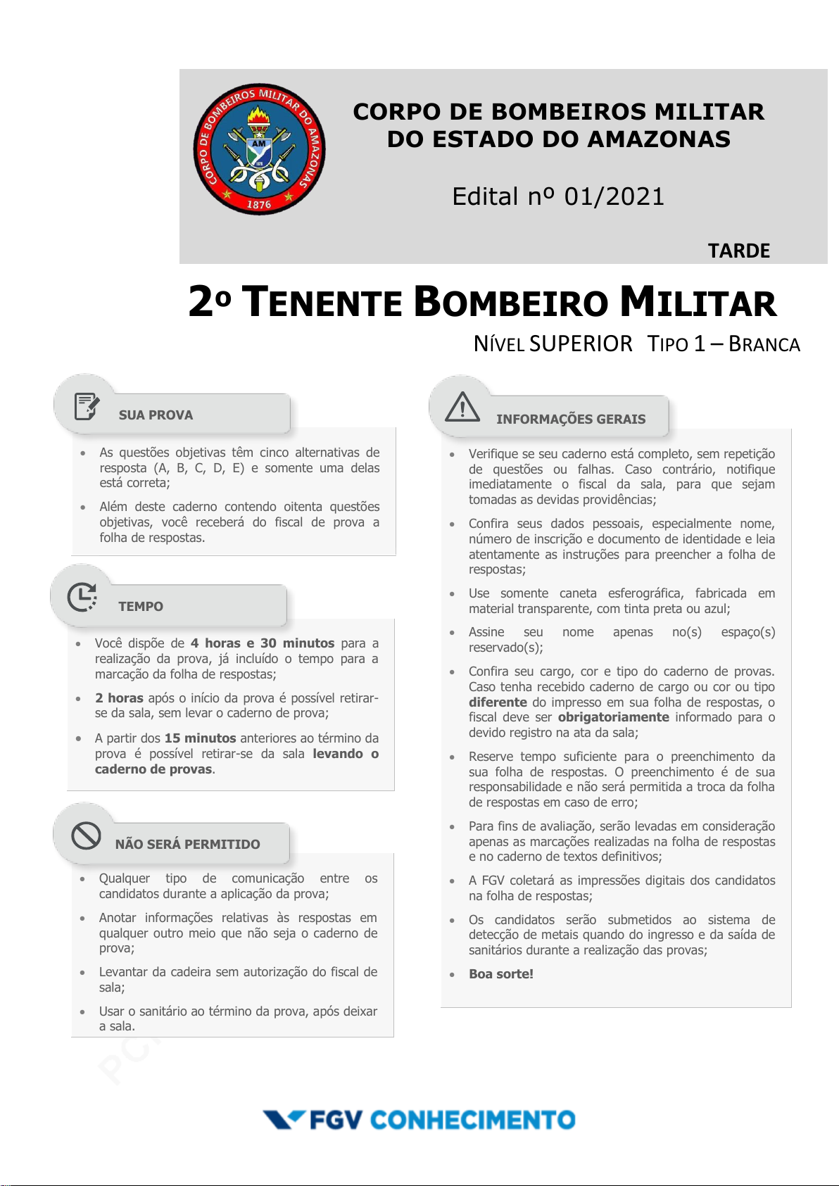 pcimarkpci MjgwNDo1NmQ4OjAwMjA6MDE5Yzo5MTRkOjlhY2M6ZjliNToyZjE2:V2VkLCAyNiBOb3YgMjAyNSAwOToxNDoyNCAtMDMwMA== www.pciconcursos.com.br CORPO DE BOMBEIROS MILITAR DO ESTADO DO AMAZONAS Edital nº 01/2021 TARDE 2º TENENTE BOMBEIRO MILITAR NÍVEL SUPERIOR TIPO 1 – BRANCA As questões objetivas têm cinco alternativas de resposta (A, B, C, D, E) e somente uma delas está correta; Além deste caderno contendo oitenta questões objetivas, você receberá do fiscal de prova a folha de respostas. Verifique se seu caderno está completo, sem repetição de questões ou falhas. Caso contrário, notifique imediatamente o fiscal da sala, para que sejam tomadas as devidas providências; Confira seus dados pessoais, especialmente nome, número de inscrição e documento de identidade e leia atentamente as instruções para preencher a folha de respostas; Use somente caneta esferográfica, fabricada em material transparente, com tinta preta ou azul; Assine seu nome apenas no(s) espaço(s) reservado(s); Confira seu cargo, cor e tipo do caderno de provas. Caso tenha recebido caderno de cargo ou cor ou tipo diferente do impresso em sua folha de respostas, o fiscal deve ser obrigatoriamente informado para o devido registro na ata da sala; Reserve tempo suficiente para o preenchimento da sua folha de respostas. O preenchimento é de sua responsabilidade e não será permitida a troca da folha de respostas em caso de erro; Para fins de avaliação, serão levadas em consideração apenas as marcações realizadas na folha de respostas e no caderno de textos definitivos; A FGV coletará as impressões digitais dos candidatos na folha de respostas; Os candidatos serão submetidos ao sistema de detecção de metais quando do ingresso e da saída de sanitários durante a realização das provas; Boa sorte! Você dispõe de 4 horas e 30 minutos para a realização da prova, já incluído o tempo para a marcação da folha de respostas; 2 horas após o início da prova é possível retirar- se da sala, sem levar o caderno de prova; A partir dos 15 minutos anteriores ao término da prova é possível retirar-se da sala levando o caderno de provas. Qualquer tipo de comunicação entre os candidatos durante a aplicação da prova; Anotar informações relativas às respostas em qualquer outro meio que não seja o caderno de prova; Levantar da cadeira sem autorização do fiscal de sala; Usar o sanitário ao término da prova, após deixar a sala. SUA PROVA TEMPO NÃO SERÁ PERMITIDO INFORMAÇÕES GERAIS pcimarkpci MjgwNDo1NmQ4OjAwMjA6MDE5Yzo5MTRkOjlhY2M6ZjliNToyZjE2:V2VkLCAyNiBOb3YgMjAyNSAwOToxNDoyNCAtMDMwMA== www.pciconcursos.com.br CONCURSO PARA O CORPO DE BOMBEIROS MILITAR DO ESTADO DO AMAZONAS - CBMAM 2021 FGV 2º Tenente Bombeiro Militar Tipo Branca – Página 2 Língua Portuguesa As questões desta prova são elaboradas a partir de pequenos textos e pretendem avaliar sua capacidade em interpretar e compreender textos, assim como em redigir de forma correta e adequada. 1 Uma frase de Mario Quintana nos fala sobre um dos papéis das reticências nas frases: “As reticências são os três primeiros passos do pensamento que continua por conta própria o seu caminho.” Assinale a frase a seguir em que as reticências exercem exatamente essa função de deixar a imaginação do leitor completar a frase. (A) “Quanto ao seu pai... Às vezes penso... Asseguro-lhe que é verdade. Penso que ela esqueceu de tudo.” (B) “Você... tão sozinha... Não lhe ocorre, muitas vezes, que se um homem... Não tem vontade de casar-se?”. (C) “Mágoa de o ter perdido, amor ainda. Ódio por ele? Não... não vale a pena...”. (D) “Duas horas te esperei. Duas horas mais te esperaria. Se gostas de mim não sei...”. (E) “Isso também conta. As raízes... – Que raízes? – cortou José Paulino, bruscamente.” 2 Um pensador italiano disse: “Sou a favor da liberdade de pensamento, desde que não se transforme em palavras.” Assinale a afirmação correta sobre a ideia e os componentes desse pensamento. (A) A frase é um paradoxo, pois o pensamento se materializa em palavras. (B) A segunda oração indica uma consequência do que é afirmado na primeira. (C) O pensamento é uma ironia contra os que falam sem pensar. (D) A frase mostra uma estrutura argumentativa, com a apresentação de uma tese e de argumentos que a defendem. (E) A estruturação da frase mostra um pensamento de cunho universal, sem participação do autor. 3 Em todos os pensamentos a seguir há a repetição de termos destacados; assinale a frase em que esses termos não mostram o mesmo significado. (A) Se não queres perder-te no esquecimento logo ao morrer, ou escreve coisas dignas de ler-se ou faze coisas dignas de escrever-se. (B) Você consegue muito mais com uma palavra amável e um revólver do que somente com uma palavra amável. (C) Entre duas palavras escolha sempre a mais simples. Entre duas palavras simples, escolha sempre a mais curta. (D) O mundo se divide em duas espécies de pessoas: aquelas que querem falar com você e aquelas com as quais você quer falar. (E) Um homem sério tem poucas ideias. Um homem de ideias nunca está sério. 4 “O mais importante não é o número de ideias agrupadas em sua mente, mas o vínculo que as une.” Essa frase fala de uma característica do real conhecimento, que é construído (A) pela quantidade de ideias que você armazena. (B) pelas relações estabelecidas entre as ideias. (C) pela seleção qualitativa das ideias. (D) pela independência de cada ideia. (E) pela substituição progressiva das ideias. 5 Todas as frases a seguir foram construídas de forma impessoal, à exceção de uma. Assinale-a. (A) Por melhor que se fale, quando se fala muito, finaliza-se sempre por dizer tolices. (B) Hoje em dia não se sabe falar porque não se sabe escutar. (C) Analisa-se o homem para que ele seja conhecido. (D) Perguntar é ensinar. (E) Quem pensa bem se equivoca muito. 6 Observe o seguinte pensamen