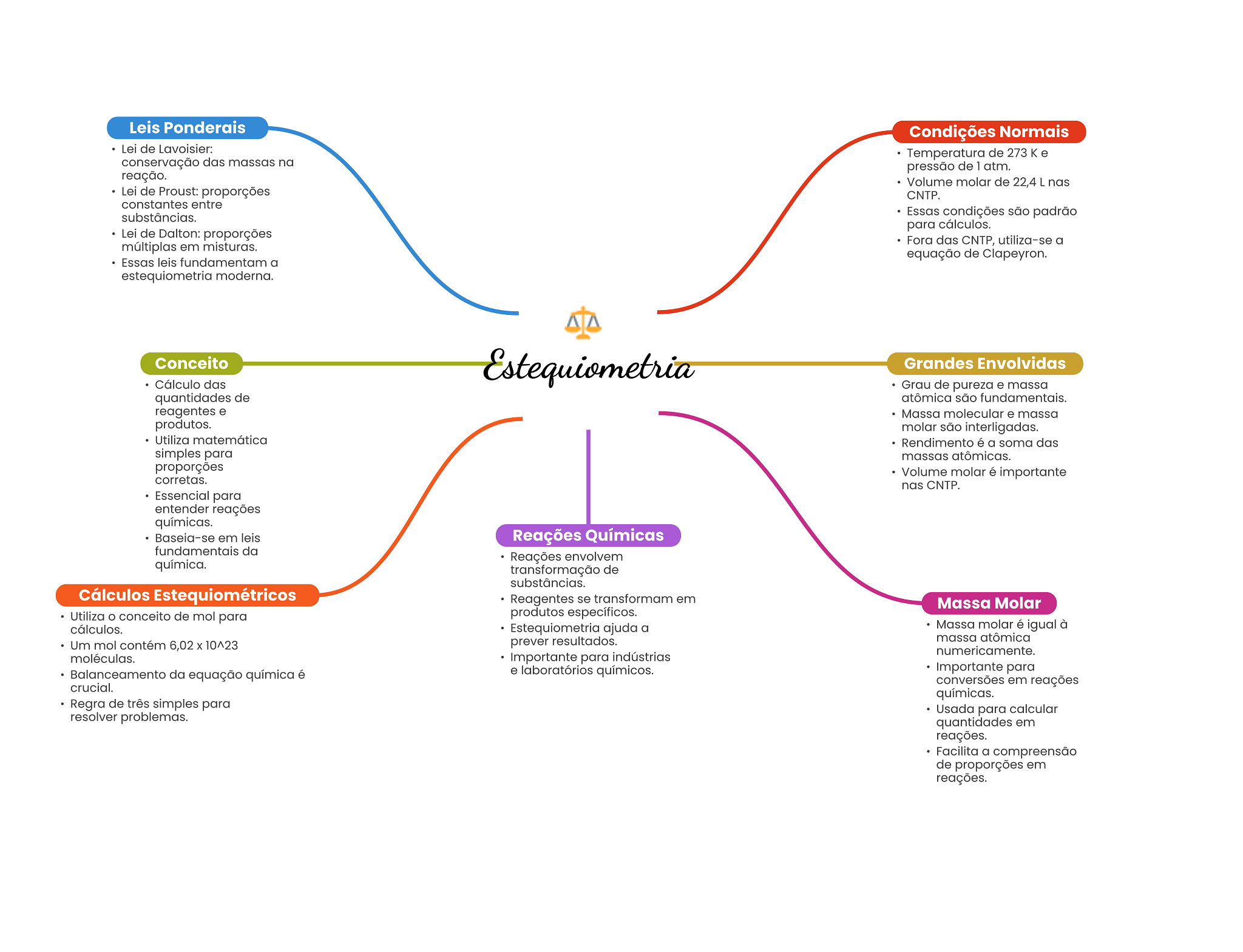 Leis Ponderais Condições Normais Lei de Lavoisier: Temperatura de 273 K e conservação das massas na pressão de 1 atm. reação. Volume molar de 22,4 L nas Lei de Proust: proporções CNTP. constantes entre substâncias. Essas condições são padrão para cálculos. Lei de Dalton: proporções Fora das CNTP, utiliza-se a múltiplas em misturas. equação de Clapeyron. Essas leis fundamentam a estequiometria moderna. Conceito Estequiometria Grandes Envolvidas Cálculo das Grau de pureza e massa quantidades de atômica são fundamentais. reagentes e Massa molecular e massa produtos. molar são interligadas. Utiliza matemática Rendimento é a soma das simples para massas atômicas. proporções Volume molar é importante corretas. nas CNTP. Essencial para entender reações químicas. Baseia-se em leis Reações Químicas fundamentais da Reações envolvem química. transformação de substâncias. Cálculos Estequiométricos Reagentes se transformam em Massa Molar Utiliza conceito de mol para produtos específicos. cálculos. Estequiometria ajuda a Massa molar é igual à Um mol contém 6,02 X 10^23 prever resultados. massa atômica numericamente. moléculas. Importante para indústrias e laboratórios químicos. Importante para Balanceamento da equação química é conversões em reações crucial. químicas. Regra de três simples para Usada para calcular resolver problemas. quantidades em reações. Facilita a compreensão de proporções em reações.