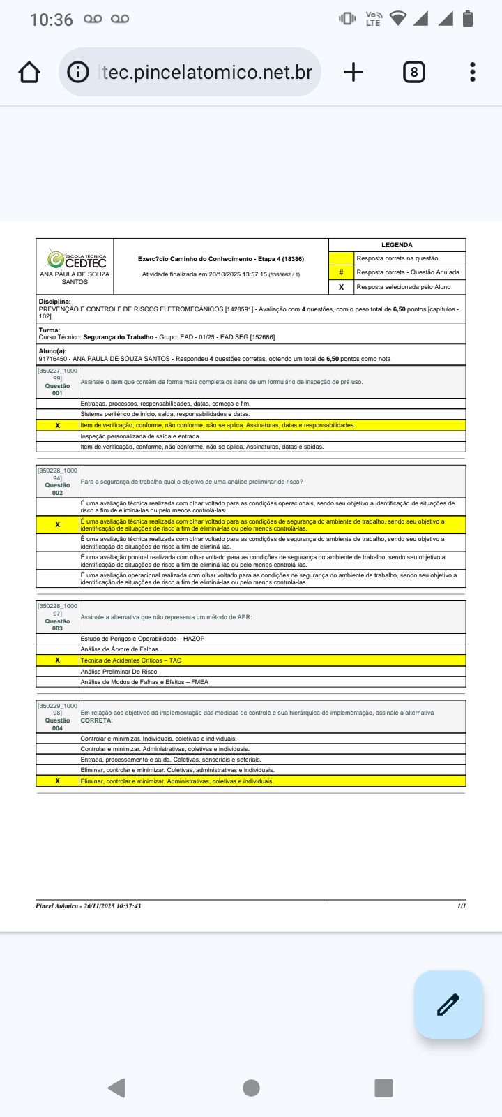 10:36 LTE + 8 LEGENDA ESCOLA TÉCNICA Exerc?cio Caminho do Conhecimento Etapa 4 (18386) Resposta correta na questão CEDTEC ANA PAULA DE SOUZA Atividade finalizada em 20/10/2025 13:57:15 (5365662 1) # Resposta correta Questão Anulada SANTOS X Resposta selecionada pelo Aluno Disciplina: PREVENÇÃO E CONTROLE DE RISCOS ELETROMECÁNICOS Avaliação com 4 com peso total de 6,50 pontos 102] Turma: Curso Segurança do Trabalho Grupo: EAD 01/25 EAD SEG [152686] Aluno(a): 91716450 ANA PAULA DE SOUZA SANTOS Respondeu 4 questões obtendo um total de pontos como nota 1000 99] Assinale item que contém de forma mais completa os itens de um formulário de inspeção de pré uso. Questão 001 processos, datas, começo e Sistema de saida, responsabilidades e Item de não não se datas e responsabilidades. Inspeção personalizada de saida e Item de não não se aplica. datas e 1000 94] Questão Para a segurança do trabalho qual objetivo de uma análise preliminar de risco? 002 E uma avaliação realizada com voltado para as condições sendo seu objetivo a identificação de situações de risco a fim de ou pelo menos E uma avaliação técnica realizada com voltado para as condições de segurança do ambiente de trabalho, sendo seu objetivo a identificação de situações de risco a fim de eliminá-las ou pelo menos E uma avaliação realizada com voltado para as condições de segurança do ambiente de trabalho, sendo seu objetivo a identificação de situações de risco a fim de É uma avaliação pontual realizada com voltado para as condições de segurança do ambiente de trabalho, sendo seu objetivo a identificação de situações de risco a fim de elimina-las ou pelo menos E uma avaliação operacional realizada com voltado para as condições de segurança do ambiente de trabalho, sendo seu objetivo a identificação de situações de risco a fim de ou pelo menos 1000 97] Assinale a alternativa que não representa um método de APR: Questão 003 Estudo de Perigos e Operabilidade HAZOP de Arvore de Falhas Técnica de Acidentes Criticos TAC Preliminar De Risco Analise de Modos de Falhas e Efeitos FMEA 1000 98] Em relação aos objetivos da implementação das medidas de controle e sua de implementação, assinale a alternativa Questão 004 Controlar e minimizar. coletivas e Controlar e minimizar. coletivas e Entrada, processamento e sensoriais e Eliminar, controlar e minimizar. administrativas e Eliminar, controlar e minimizar. coletivas e Pincel Atômico 26/11/2025 10:37:43 1/1