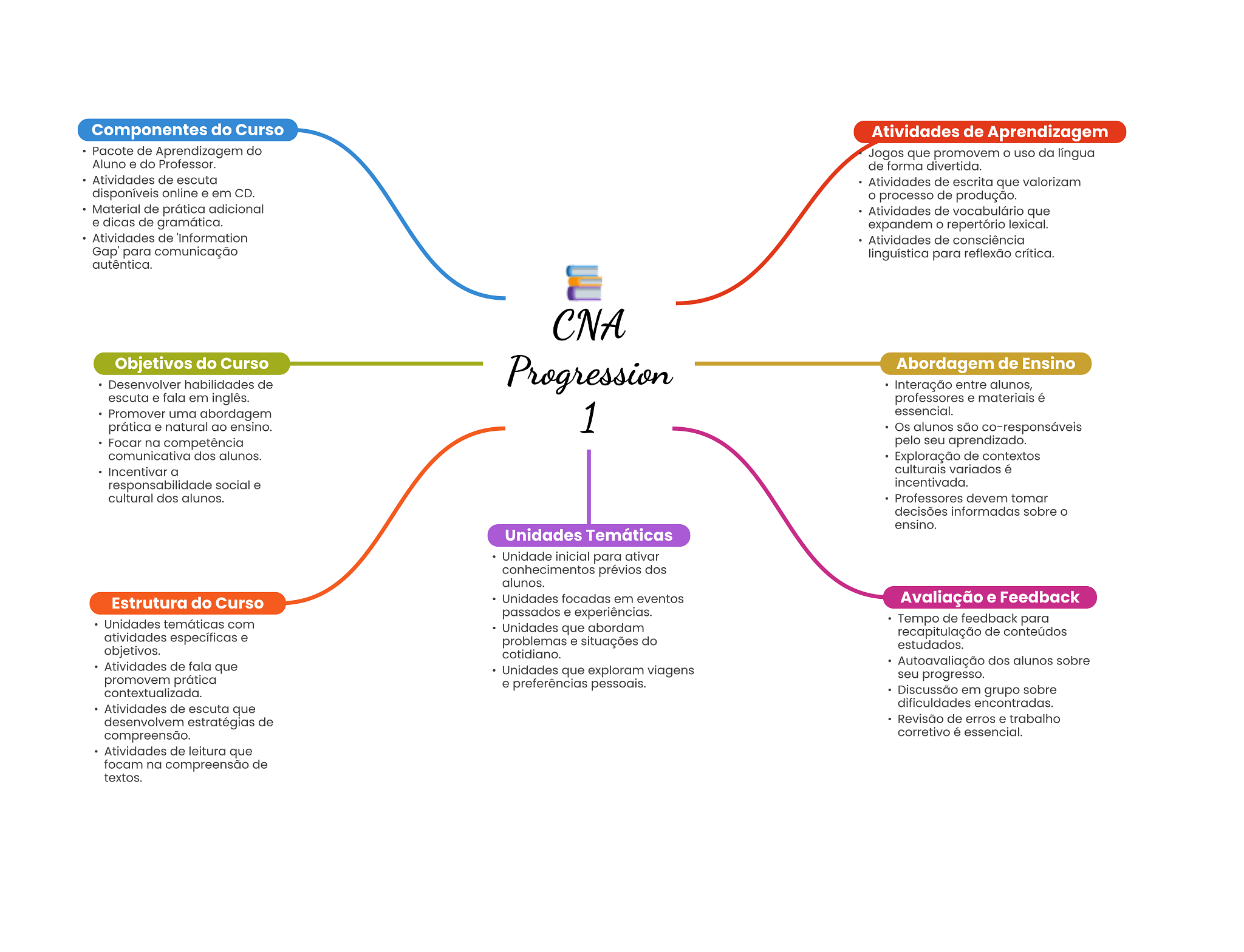 Componentes do Curso Atividades de Aprendizagem Pacote de Aprendizagem do Jogos que promovem uso da língua Aluno e do Professor. de forma divertida. Atividades de escuta Atividades de escrita que valorizam disponíveis online e em CD. processo de produção. Material de prática adicional Atividades de vocabulário que e dicas de gramática. expandem repertório lexical. Atividades de Atividades de consciência Gap' para comunicação linguística para reflexão crítica. autêntica. CNA Objetivos do Curso Progression Abordagem de Ensino Desenvolver habilidades de Interação entre alunos, escuta e fala em inglês. professores e materiais é Promover uma abordagem 1 essencial. prática e natural ao ensino. Os alunos são co-responsáveis Focar na competência pelo seu aprendizado. comunicativa dos alunos. Exploração de contextos Incentivar a culturais variados é responsabilidade social e incentivada. cultural dos alunos. Professores devem tomar decisões informadas sobre O ensino. Unidades Temáticas Unidade inicial para ativar conhecimentos prévios dos alunos. Estrutura do Curso Unidades focadas em eventos Avaliação e Feedback passados e experiências. Unidades temáticas com Tempo de feedback para Unidades que abordam atividades específicas e recapitulação de conteúdos problemas e situações do estudados. objetivos. cotidiano. Atividades de fala que Autoavaliação dos alunos sobre Unidades que exploram viagens promovem prática seu progresso. e preferências pessoais. contextualizada. Discussão em grupo sobre dificuldades encontradas. Atividades de escuta que desenvolvem estratégias de Revisão de erros e trabalho compreensão. corretivo é essencial. Atividades de leitura que focam na compreensão de textos.