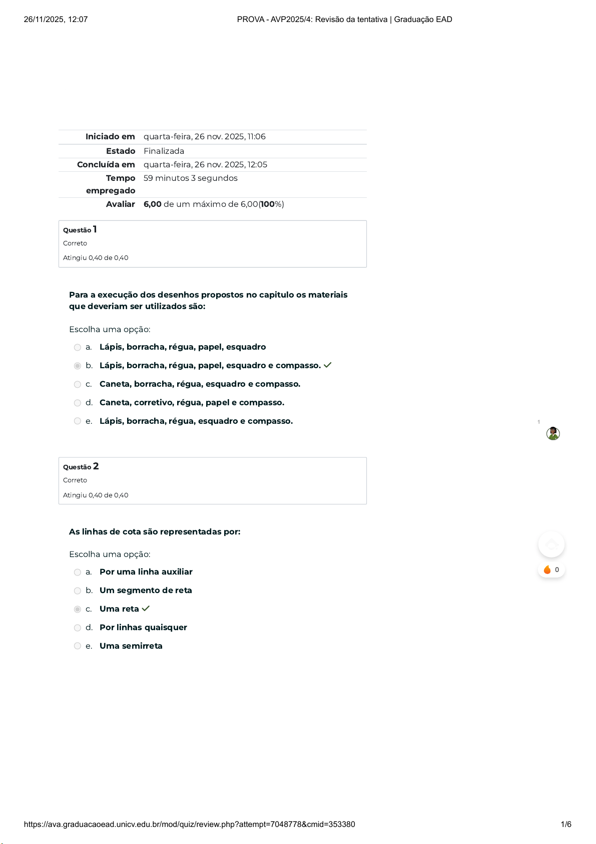 Iniciado em quarta-feira, 26 nov. 2025, 11:06 Estado Finalizada Concluída em quarta-feira, 26 nov. 2025, 12:05 Tempo empregado 59 minutos 3 segundos Avaliar 6,00 de um máximo de 6,00(100%) Questão 1 Correto Atingiu 0,40 de 0,40 Questão 2 Correto Atingiu 0,40 de 0,40 Para a execução dos desenhos propostos no capitulo os materiais que deveriam ser utilizados são: Escolha uma opção: a. Lápis, borracha, régua, papel, esquadro b. Lápis, borracha, régua, papel, esquadro e compasso. ✓ c. Caneta, borracha, régua, esquadro e compasso. d. Caneta, corretivo, régua, papel e compasso. e. Lápis, borracha, régua, esquadro e compasso. As linhas de cota são representadas por: Escolha uma opção: a. Por uma linha auxiliar b. Um segmento de reta c. Uma reta ✓ d. Por linhas quaisquer e. Uma semirreta 1 0 26/11/2025, 12:07 PROVA - AVP2025/4: Revisão da tentativa | Graduação EAD https://ava.graduacaoead.unicv.edu.br/mod/quiz/review.php?attempt=7048778&cmid=353380 1/6 Questão 3 Correto Atingiu 0,40 de 0,40 Questão 4 Correto Atingiu 0,40 de 0,40 Questão 5 Correto Atingiu 0,40 de 0,40 Qual tipo de desenho era encontrado na antiguidade, que era utilizado como forma de expressão? Escolha uma opção: a. Figuras de expressão b. Desenho silvestre c. Desenho pré-histórico d. Desenho rupestre ✓ e. Desenho antigo No AutoCad para incluir cotas utilizamos as ferramentas de dimension, a ferramenta allined insere cotas para qual tipo de linha ou figura? Escolha uma opção: a. As linhas inclinadas com relação a horizontal e vertical; b. Encerre o raio no circulo c. As linhas que não seguem nem a horizontal e nem a vertical ✓ d. As linhas inclinadas com relação a transversal e vertical; e. As linhas inclinadas com relação a horizontal e transversal; O comando que chama a janela de configurar cotas é: Escolha uma opção: a. DIMST ✓ b. STYLE c. DIMSTYLESS d. DIMSTYLE e. DIMSTILE 1 26/11/2025, 12:07 PROVA - AVP2025/4: Revisão da tentativa | Graduação EAD https://ava.graduacaoead.unicv.edu.br/mod/quiz/review.php?attempt=7048778&cmid=353380 2/6 Questão 6 Correto Atingiu 0,40 de 0,40 Questão 7 Correto Atingiu 0,40 de 0,40 Questão 8 Correto Atingiu 0,40 de 0,40 Os eixos isométricos tem um ângulo dê ______ graus entre si. Escolha uma opção: a. 60º b. 120º ✓ c. 80º d. 360º e. 150º No comando CIRCLE para desenhar uma circunferência a partir de duas tangentes e o raio selecionamos a função: Escolha uma opção: a. TTR ✓ b. Diameter c. Raio d. 2P e. 3P Qual o comando que possibilita o desenho de uma linha a partir de 2 pontos? Escolha uma opção: a. Line ✓ b. Circle c. Zoom d. Offset e. Rectangle 1 26/11/2025, 12:07 PROVA - AVP2025/4: Revisão da tentativa | Graduação EAD https://ava.graduacaoead.unicv.edu.br/mod/quiz/review.php?attempt=7048778&cmid=353380 3/6 Questão 9 Correto Atingiu 0,40 de 0,40 Questão 10 Correto Atingiu 0,40 de 0,40 Questão 11 Correto Atingiu 0,40 de 0,40 A régua que normalmente usamos o desenho técnico recebe o nome dê: Escolha uma opção: a. Polegada b. Milimetrada ✓ c. Escalonada d. Polegramizada e. Métrica Para inserir a cota em um circulo qual a ferramenta de dimesion que deve ser utilizada? Escolha uma opção: a. Diameter e Raio ✓ b. Linear e diameter c. Allined e diameter d. Allined e Raio e. Linear e allined As linhas que não seguem os eixos isométricos são chamados de linhas ___________. Escolha uma opção: a. Horizontais b. Perpendiculares c. Oblíquas ✓ d. Inclinadas e. Transversais 1 26/11/2025, 12:07 PROVA - AVP2025/4: Revisão da tentativa | Graduação EAD https://ava.graduacaoead.unicv.edu.br/mod/quiz/review.php?attempt=7048778&cmid=353380 4/6 Questão 12 Correto Atingiu 0,40 de 0,40 Questão 13 Correto Atingiu 0,40 de 0,40 Questão 14 Correto Atingiu 0,40 de 0,40 Quando temos um modelo simétrico na vertical e na horizontal, que linha utilizamos como cota para indicar a simetria? Escolha uma opção: a. Linhas quaisquer b. Linhas contínuas c. Linhas tracejadas d. Linhas de agrupamento e. Linhas traço ponto traço ✓ O circulo é representado por qual figura no plano isométrico? Escolha uma opção: a. Retângulo b. O círculo mesmo c. Arco d. Quadrado e. Elipse ✓ Qual os dois softwares propostos para uso no curso? Escolha uma opção: a. Autocade e FeCAD b. CAD e CADFree c. AutoCad e FreeCad ✓ d. AutoFaz e Fresoftware e. Autocada e fazcad 1 26/11/2025, 12:07 PROVA - AVP2025/4: Revisão da tentativa | Graduação EAD https://ava.graduacaoead.unicv.edu.br/mod/quiz/review.php?attempt=7048778&cmid=353380 5/6 Questão 15 Correto Atingiu 0,40 de 0,40 Qual a diferença do desenho técnico para o desenho artístico? Escolha uma opção: a. O desenho artístico é mais colorido que o desenho técnico. b. O desenho técnico descreve o objeto de forma distorcida, enquanto o desenho artístico que passar a realidade do modelo. c. O desenho técnico quer passar a realidade do modelo, enquanto que o desenho artístico não tem preocupação com isso. ✓ d. O desenho artístico é regido por normas enquanto que o desenho técnico pode ser feito de qualquer forma. e. O desenho técnico e o artístico são a mesma coisa, os dois querem passar a realidade do modelo com as devidas medidas e proporções. 1 26/11/2025, 12:07 PROVA - AVP2025/4: Revisão da tentativa | Graduação EAD https://ava.graduacaoead.unicv.edu.br/mod/quiz/review.php?attempt=7048778&cmid=353380 6/6